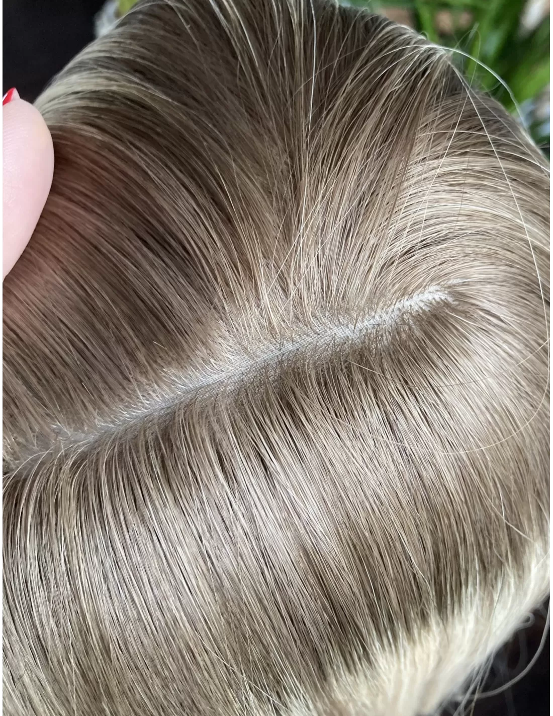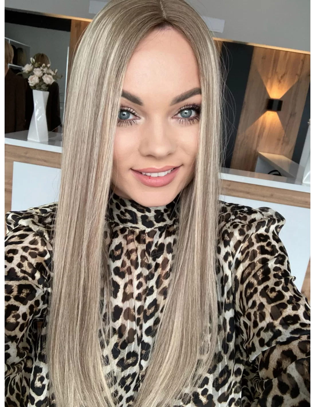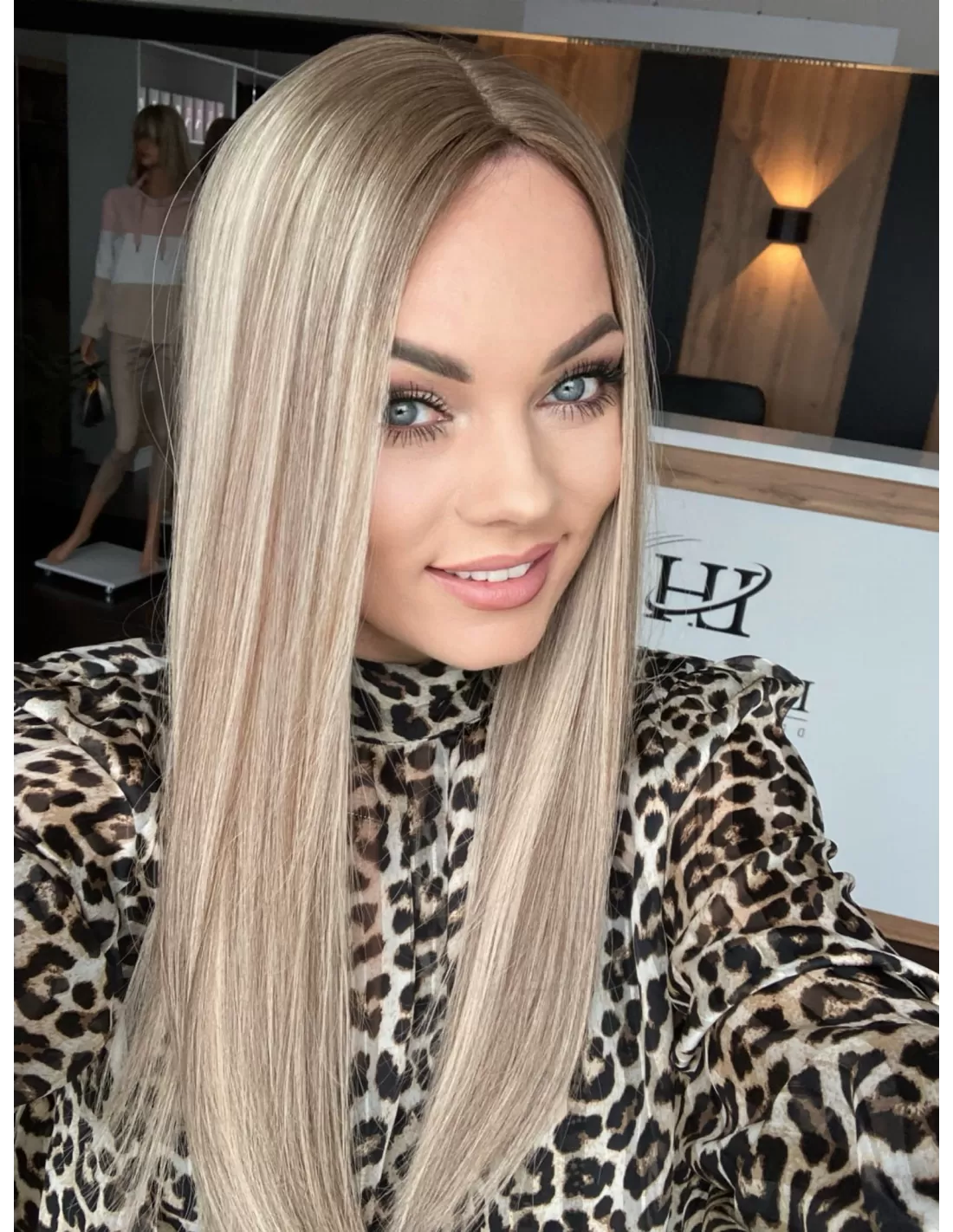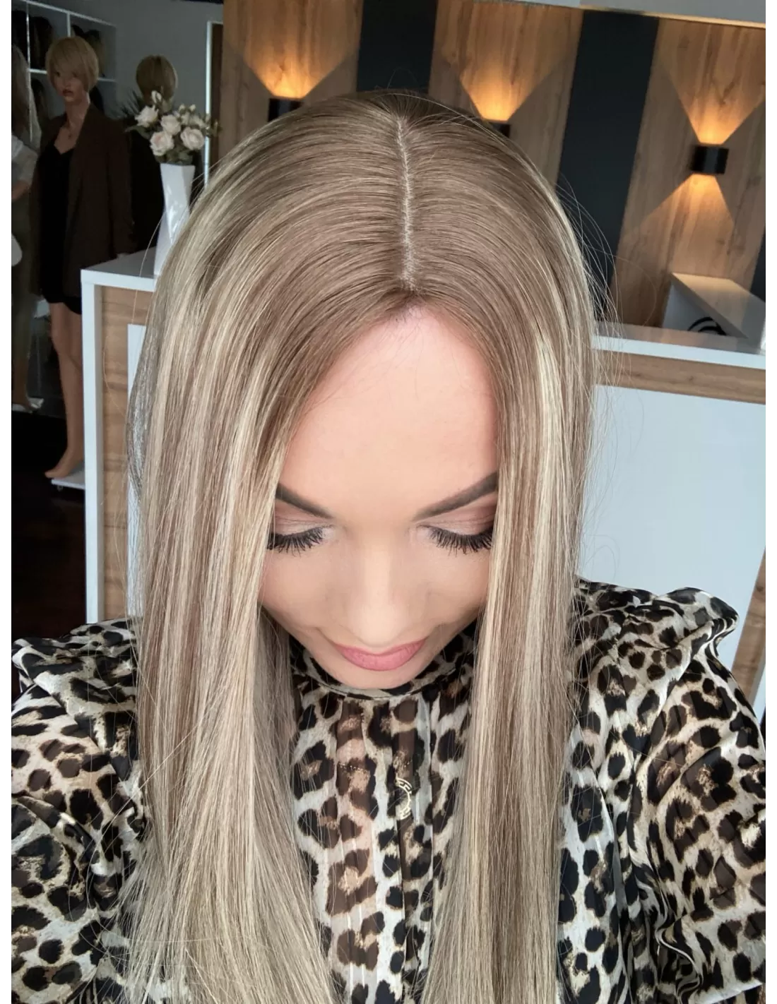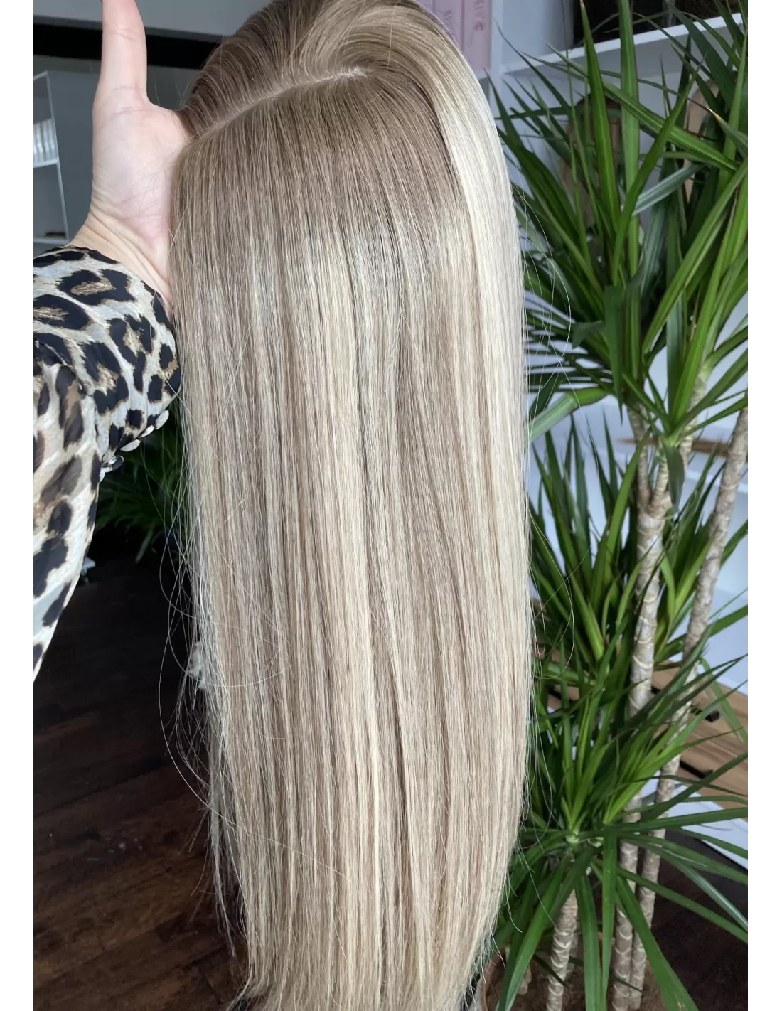 Topper wykonany został z włosów naturalnych europejskich najwyższej jakości. Jego kolor to baleayage w różnych odcieniach bezowego blondu z odrostem w kolorze średniego blondu . Jest to wyrafinowana propozycja dla miłośniczek nowoczesnego stylu. Dodatkowy baleyage nadaje głębokości i ruchu, co sprawia, że ta fryzura emanuje elegancją. Poznaj magię toppera Lila , który nie tylko nadaje się doskonale do codziennego noszenia, ale także dodaje subtelnego pazura i stylu każdej stylizacji.