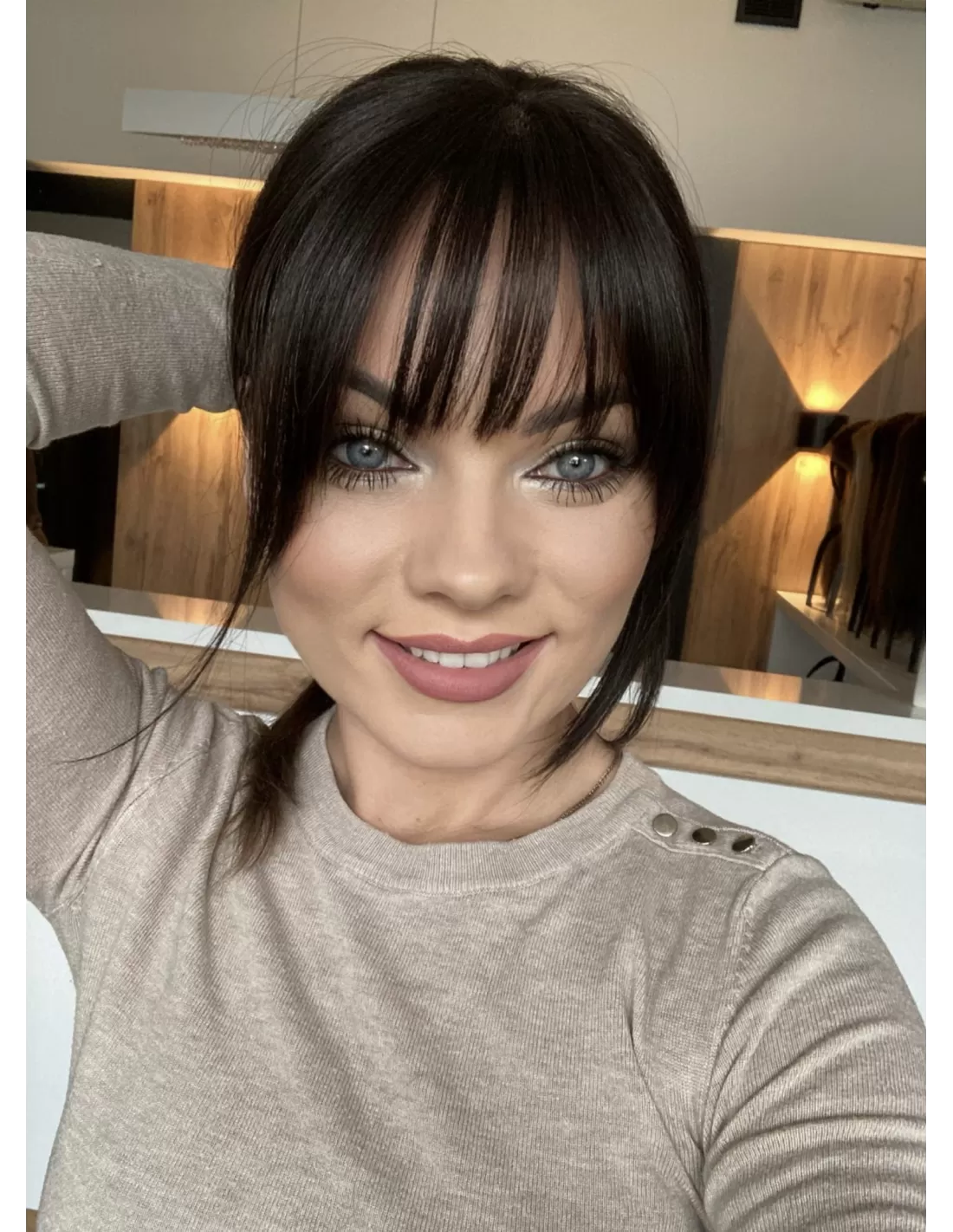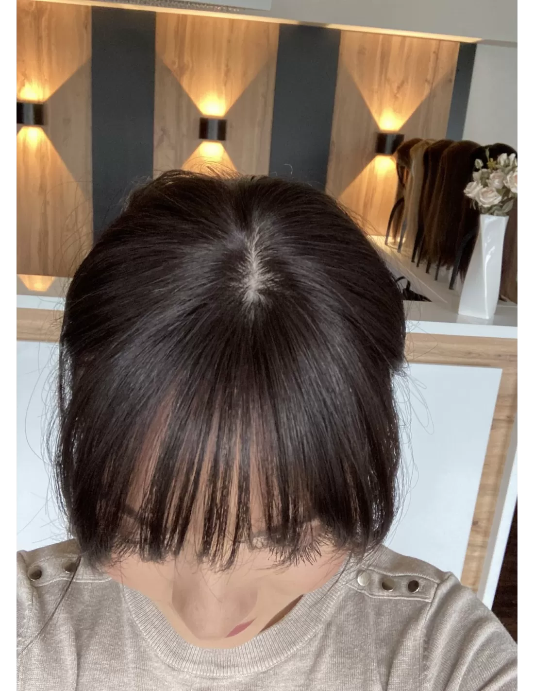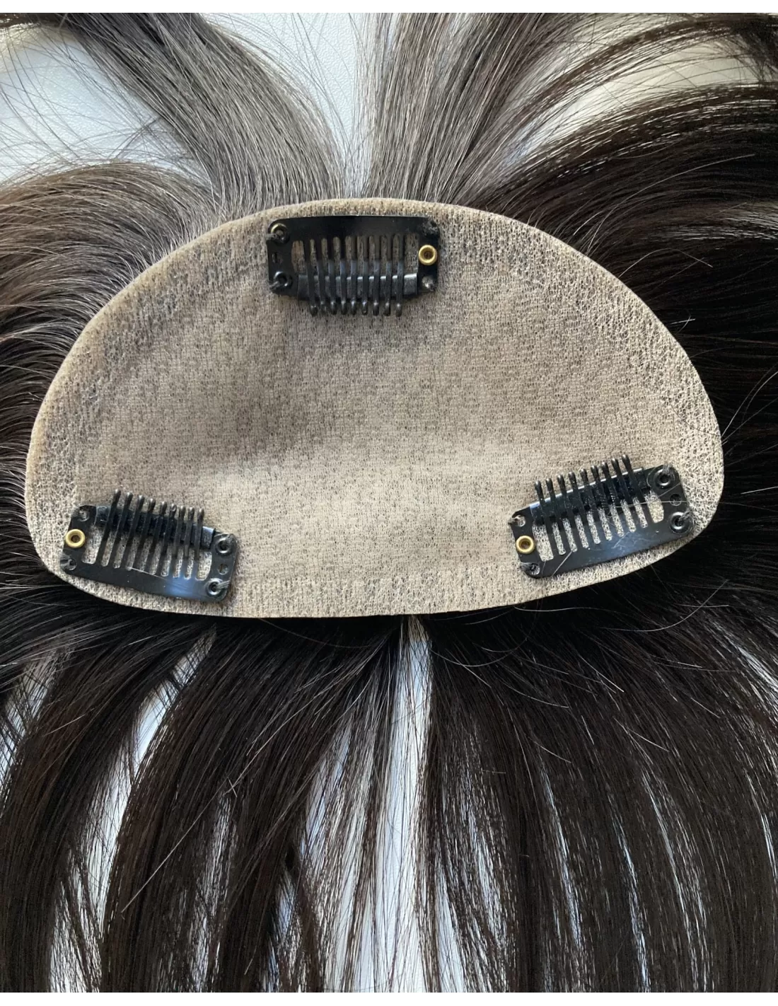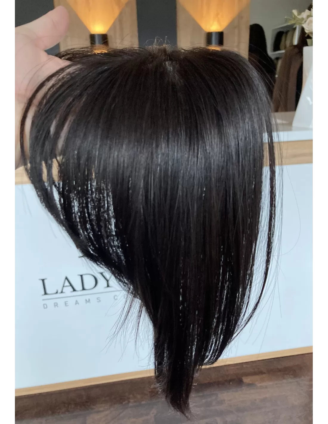 Grzywka wykonana z włosów naturalnych europejskich, w ciepłym odcieniu bardzo ciemnego brązu, nie tylko dodaje charakteru, ale także zachwyca swoją autentycznością. Dzięki precyzyjnej imitacji naturalnej skóry głowy wygląda niezwykle realistycznie, jakby każdy włos wyrastał z naszej własnej głowy.