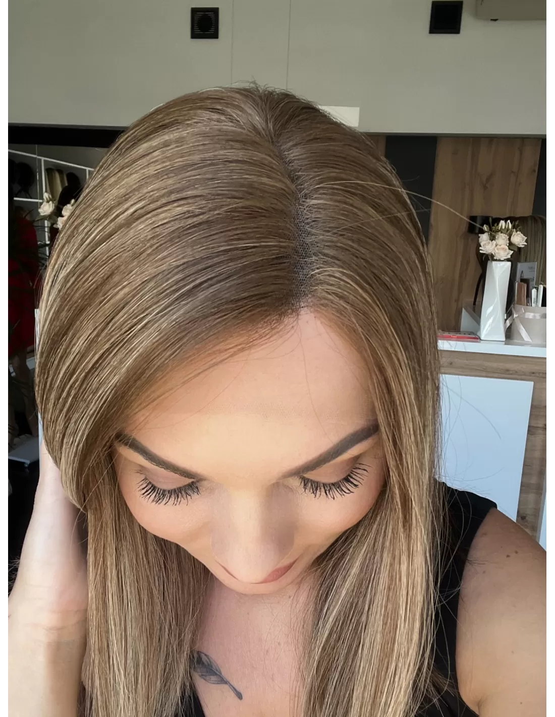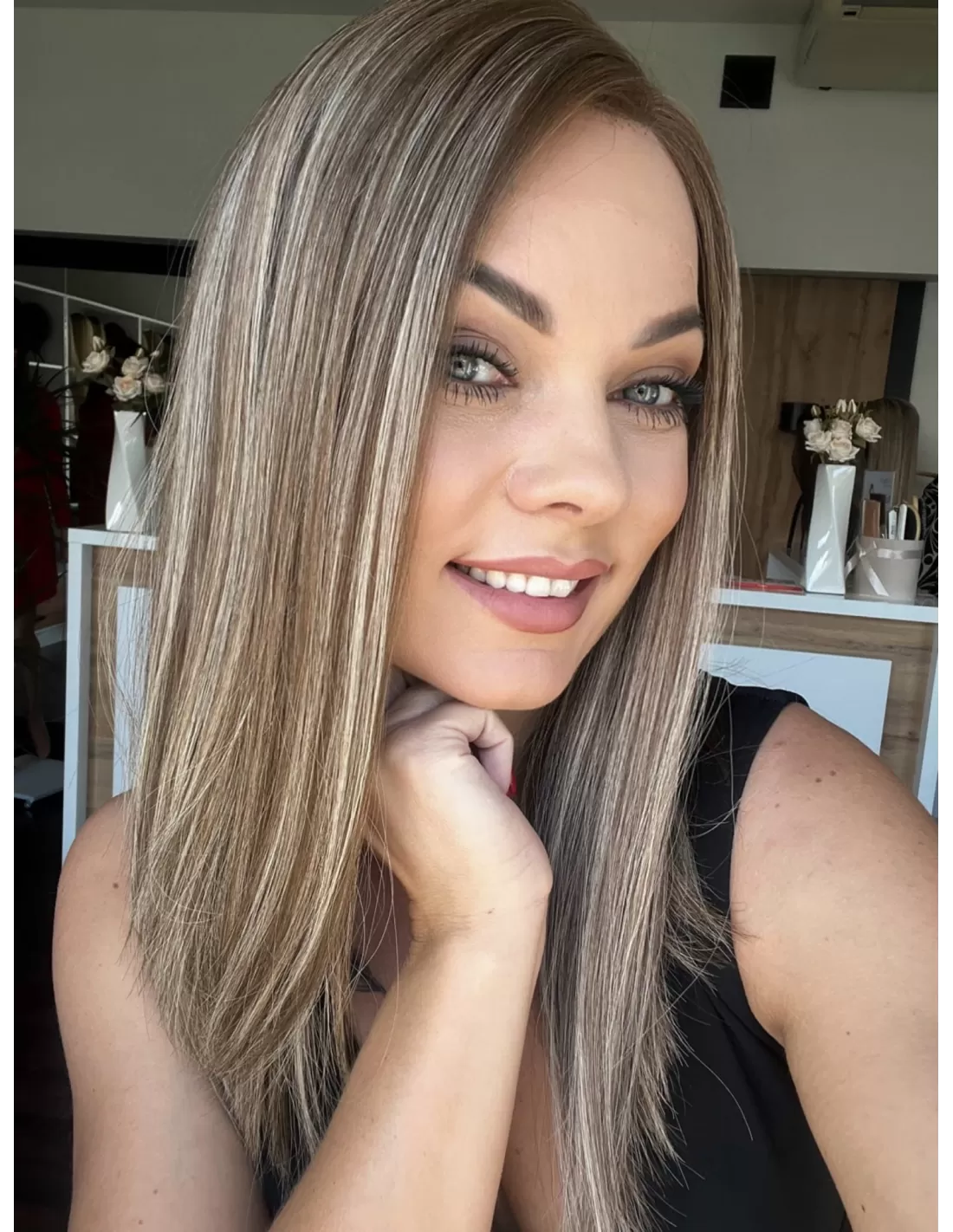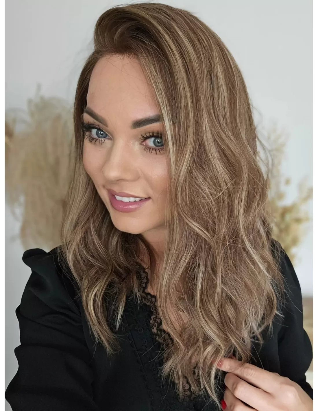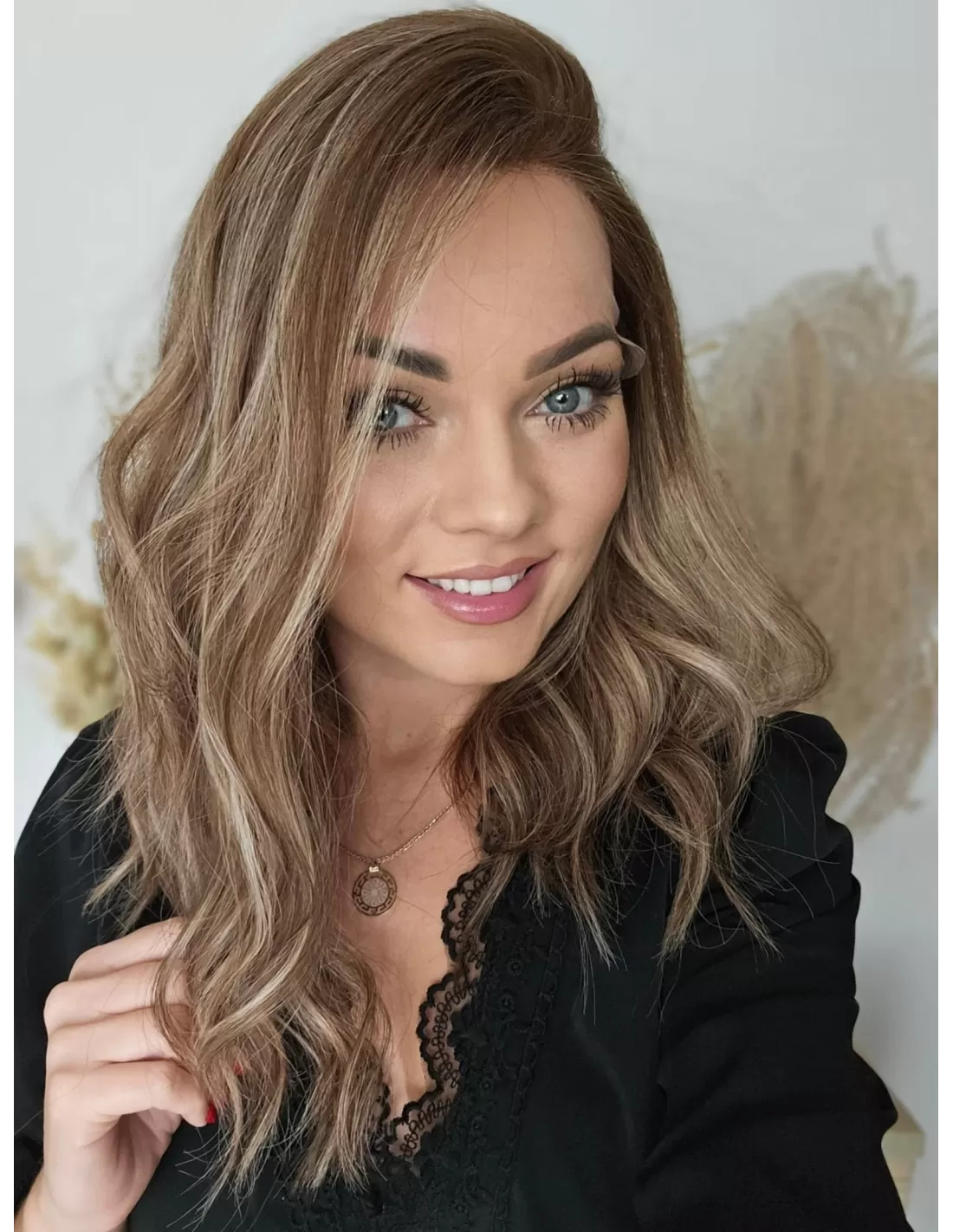 Peruka Kati z włosów naturalnych jest prawdziwym dziełem sztuki. Jej odcień balayage blond to połączenie delikatności i elegancji, z subtelnymi brązowymi pasemkami dodającymi głębi. Kontrast z ciemnym odrostem nadaje jej niepowtarzalnego charakteru. To nie tylko peruka, to wyraz wyjątkowej urody i stylu, który zachwyca i przyciąga uwagę