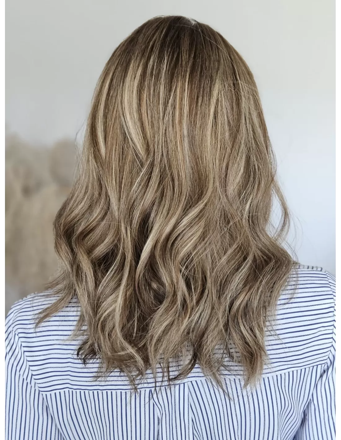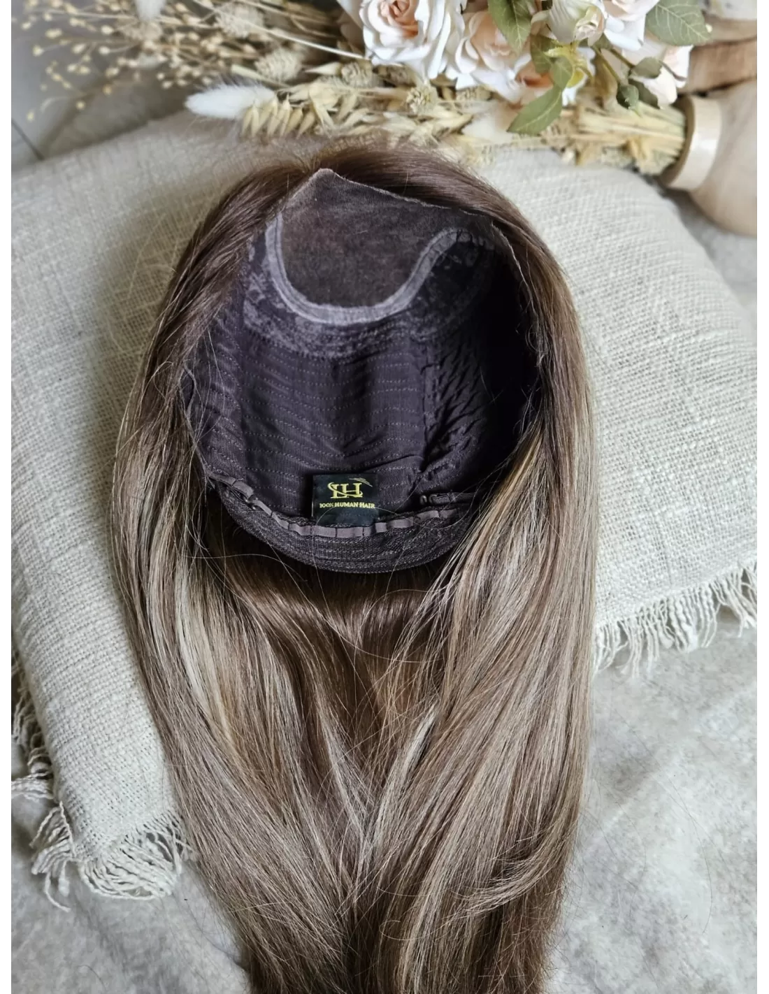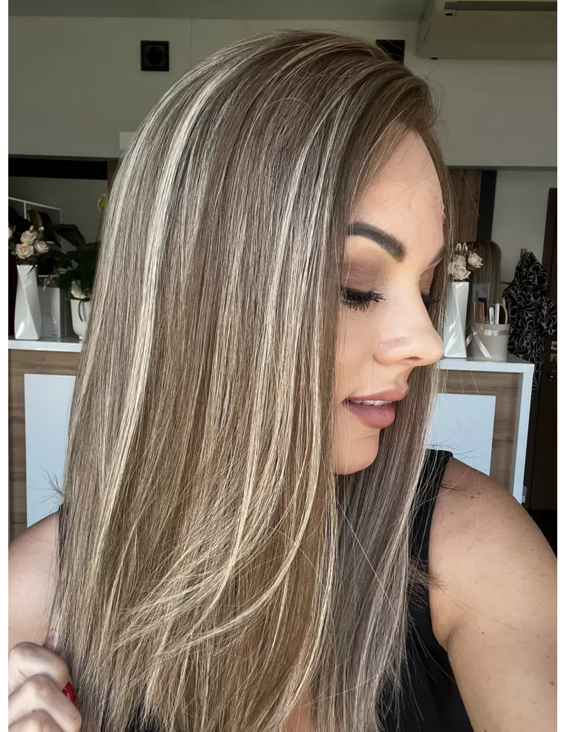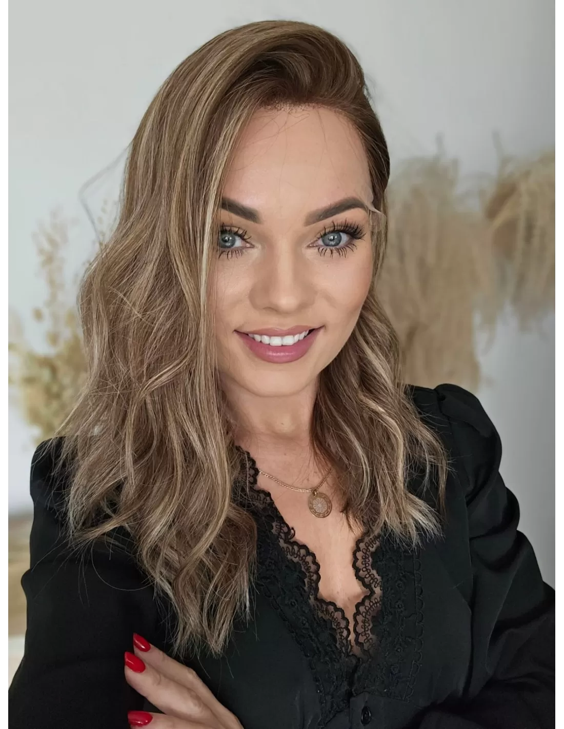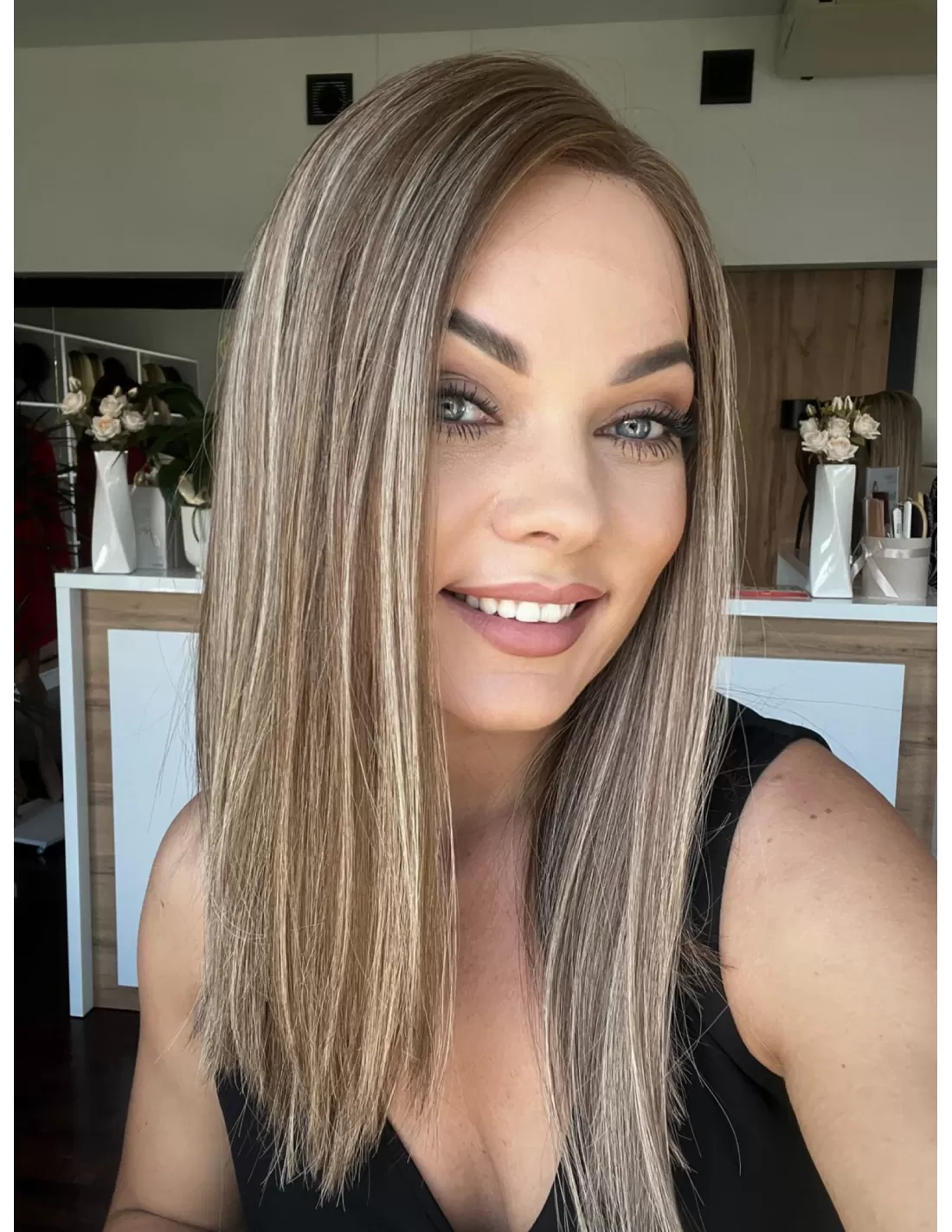 Peruka Kati z włosów naturalnych jest prawdziwym dziełem sztuki. Jej odcień balayage blond to połączenie delikatności i elegancji, z subtelnymi brązowymi pasemkami dodającymi głębi. Kontrast z ciemnym odrostem nadaje jej niepowtarzalnego charakteru. To nie tylko peruka, to wyraz wyjątkowej urody i stylu, który zachwyca i przyciąga uwagę