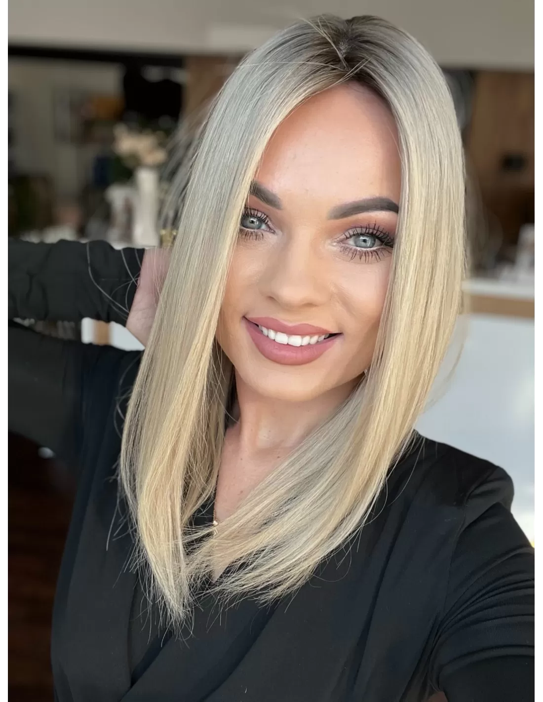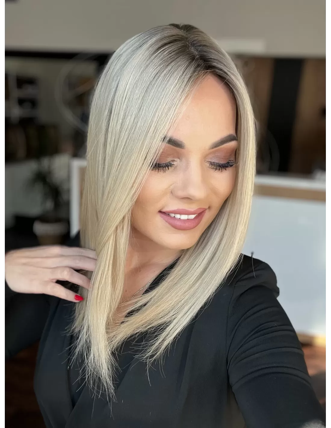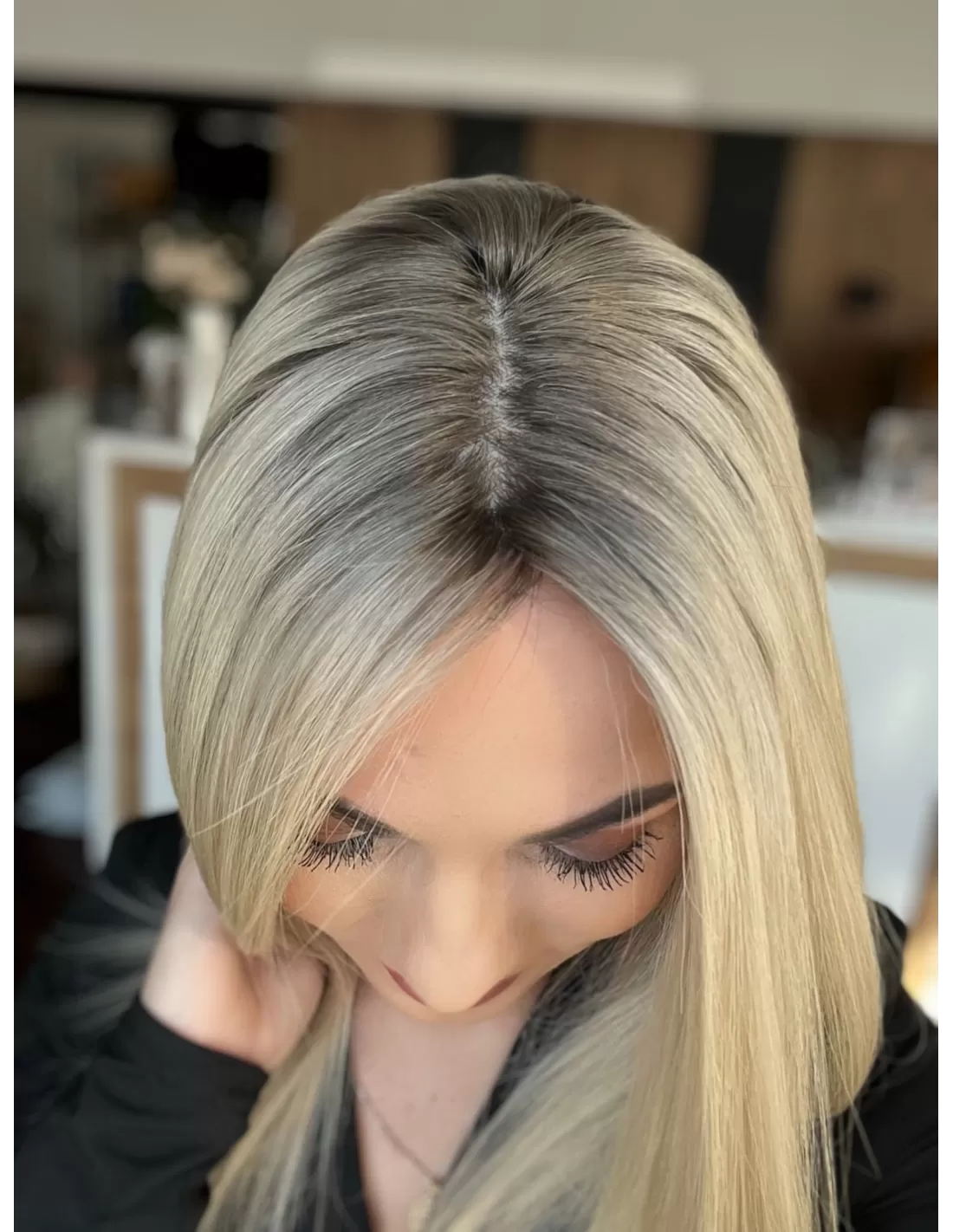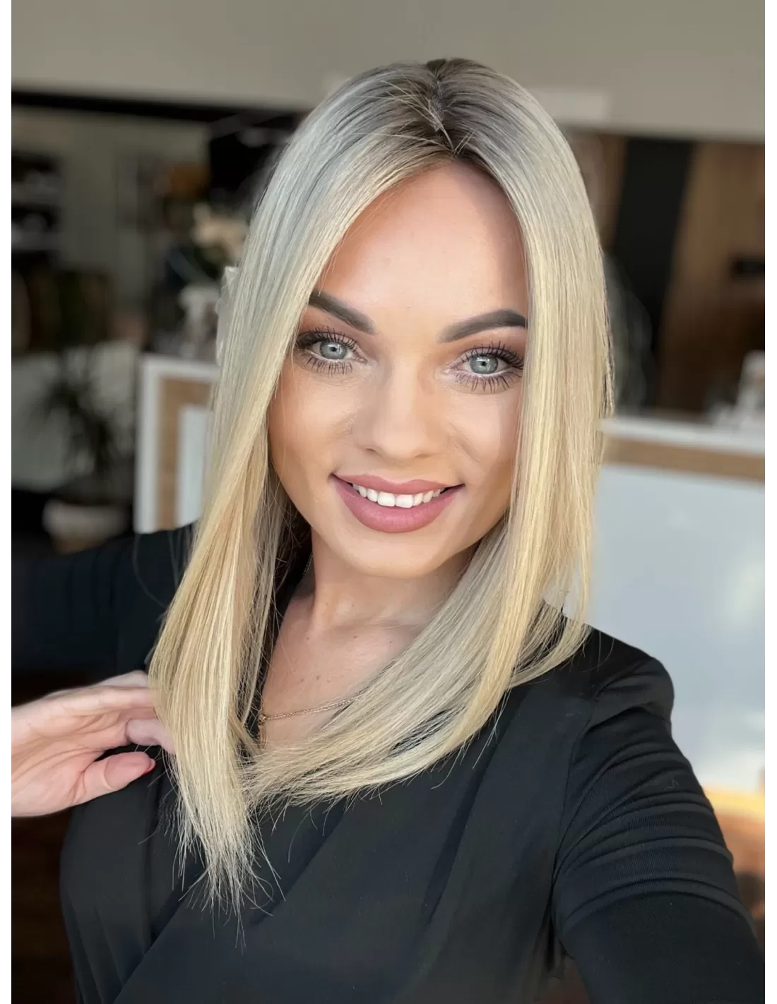 Topper z włosów naturalnych Lili 50-Wykonany został z włosów europejskich najwyższej jakości. Kolor to platynowy blond z grafitowym odrostem.