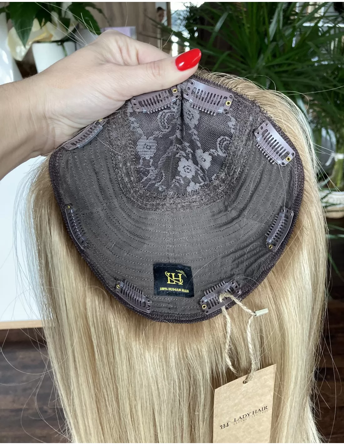 Najwyższa Jakość Włosów Naturalnych: Topper Wilma wykonany jest z najwyższej jakości włosów naturalnych europejskich, co gwarantuje piękny wygląd i trwałość. Włosy te są gładkie, lśniące i wyjątkowo naturalne w dotyku.