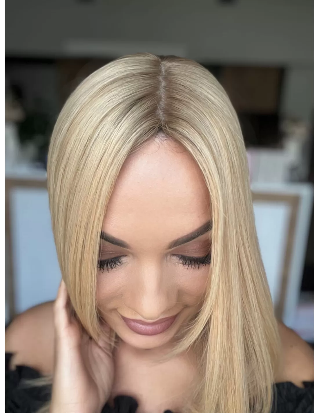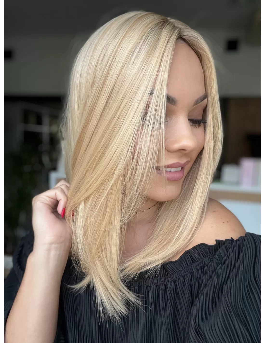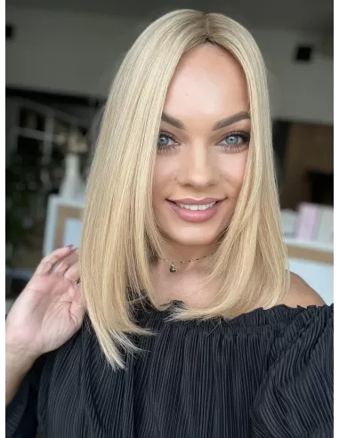 Poznaj Sheilę 35 – kwintesencję elegancji i subtelności. Jej słoneczny blond promieniuje ciepłem i świeżością, a delikatny kontrast odrostu w średnim blondzie nadaje fryzurze niepowtarzalny charakter. To topper, który doda Twojej stylizacji blasku i pewności siebie, czyniąc każdy dzień wyjątkowym.