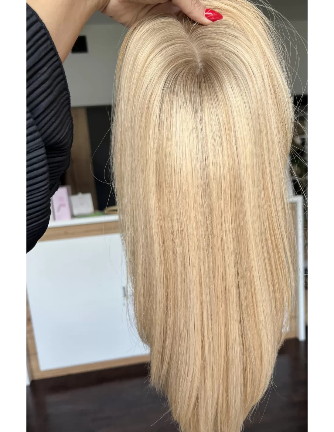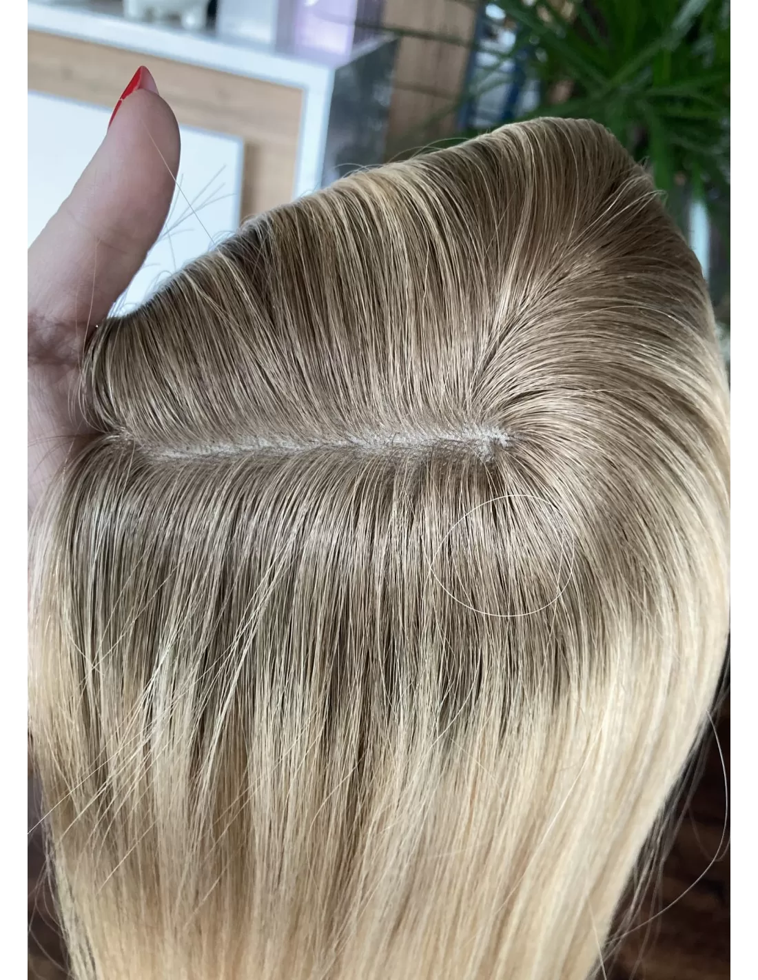 Elastyczna baza z mikroskórą o wymiarach 20 x 20 cm wiernie imituje naturalną skórę głowy, sprawiając, że włosy wyglądają, jakby wyrastały prosto z niej. Dzięki temu topper zapewnia naturalny efekt i pełen komfort noszenia.