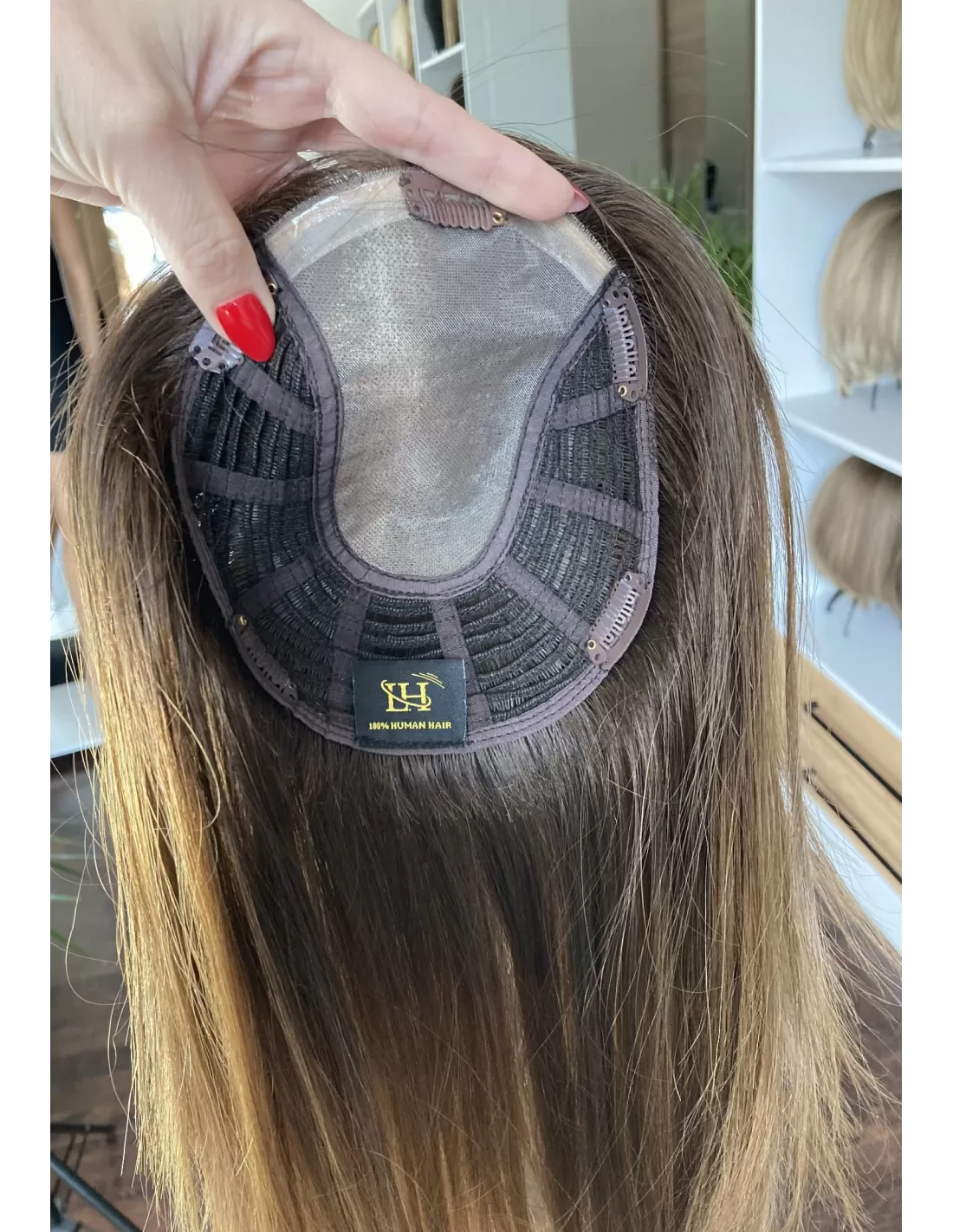 Konstrukcja bazująca na mono: Topper ten wyposażony jest w bazę mono, co oznacza, że włosy są ręcznie tkane do delikatnej siateczki, co zapewnia doskonałe naturalne wykończenie. Mono baza jest niezwykle delikatna dla skóry głowy i zapewnia efekt "scalp-like", co sprawia, że toper jest trudny do odróżnienia od własnych włosów.