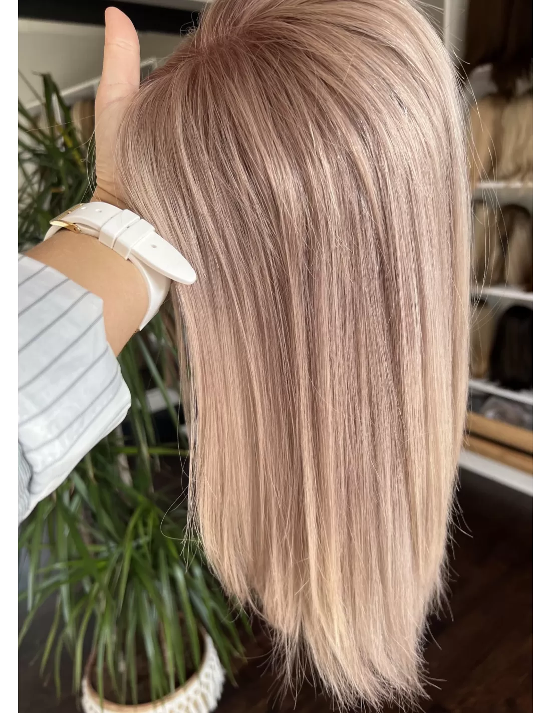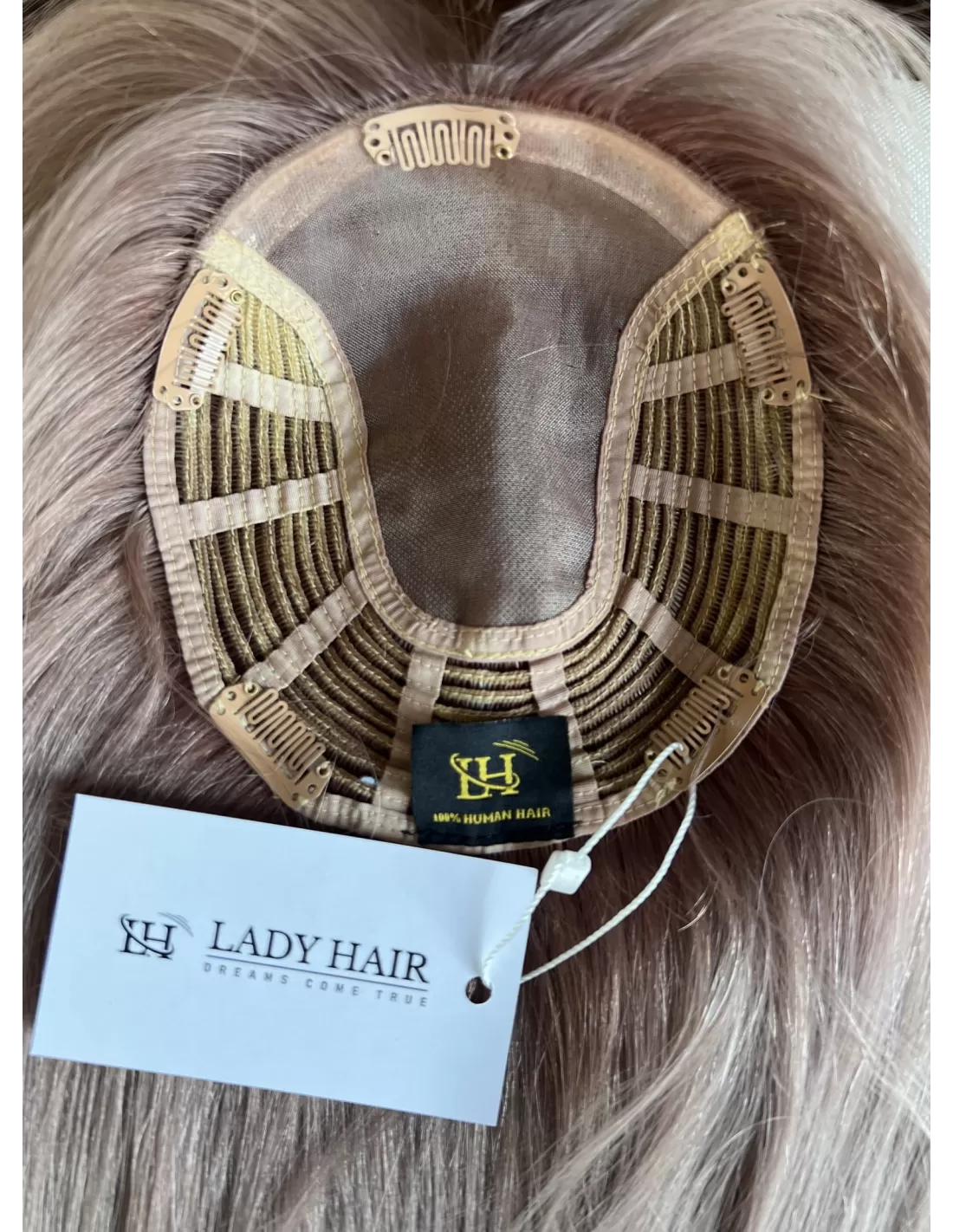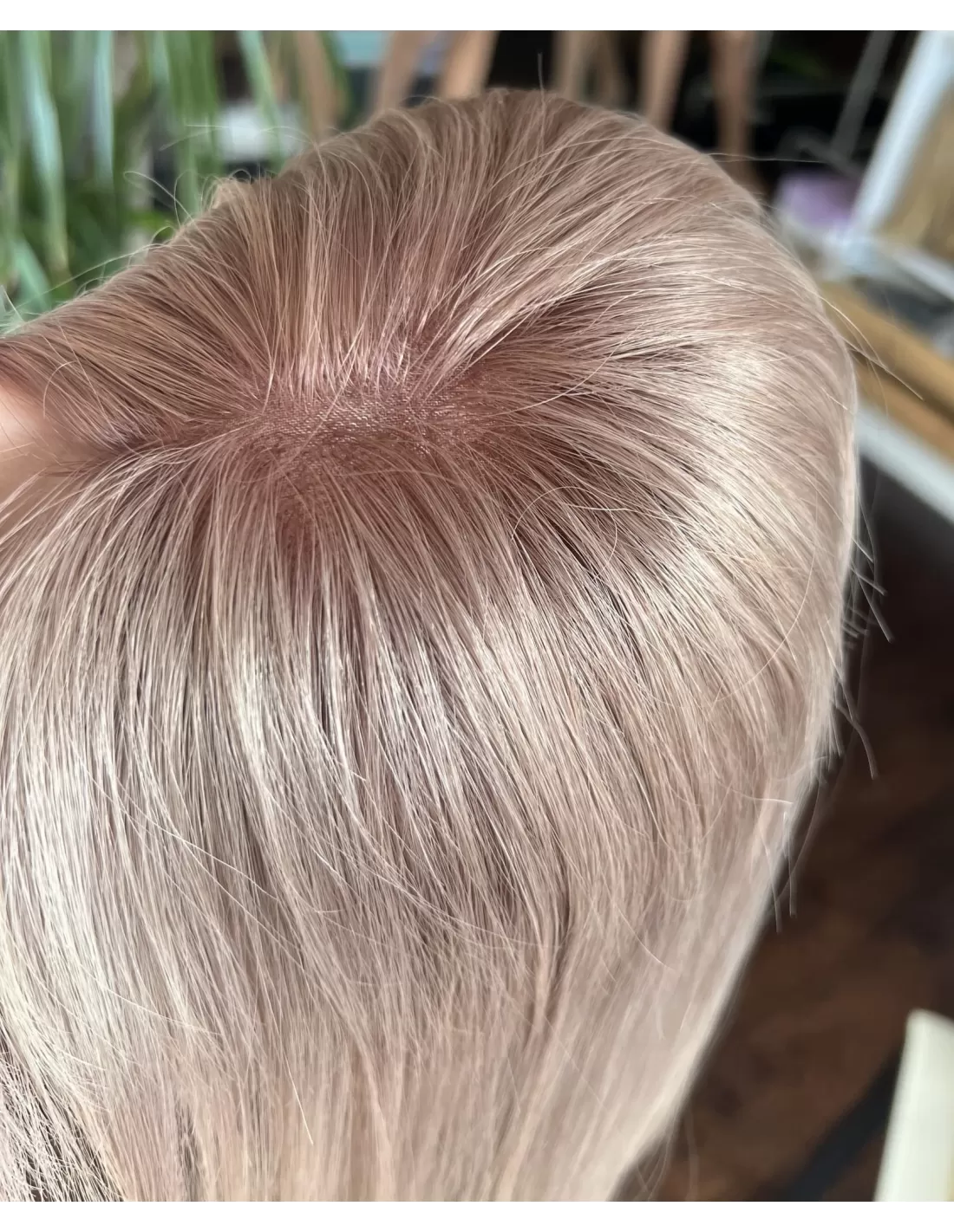 Topper Joni topper to harmonia odcieni bardzo jasnego perłowego blondu z nutką różowej poświaty, co nadaje mu niezwykły blask i elegancję. Delikatne przejście między tymi kolorami zapewnia naturalny i subtelny efekt. Dodatkowo, posiada mocowanie na pięć spineczek typu clip in, co sprawia, że jest niezwykle prosty w zakładaniu i zdejmowaniu, pozwalając na szybką zmianę fryzury.