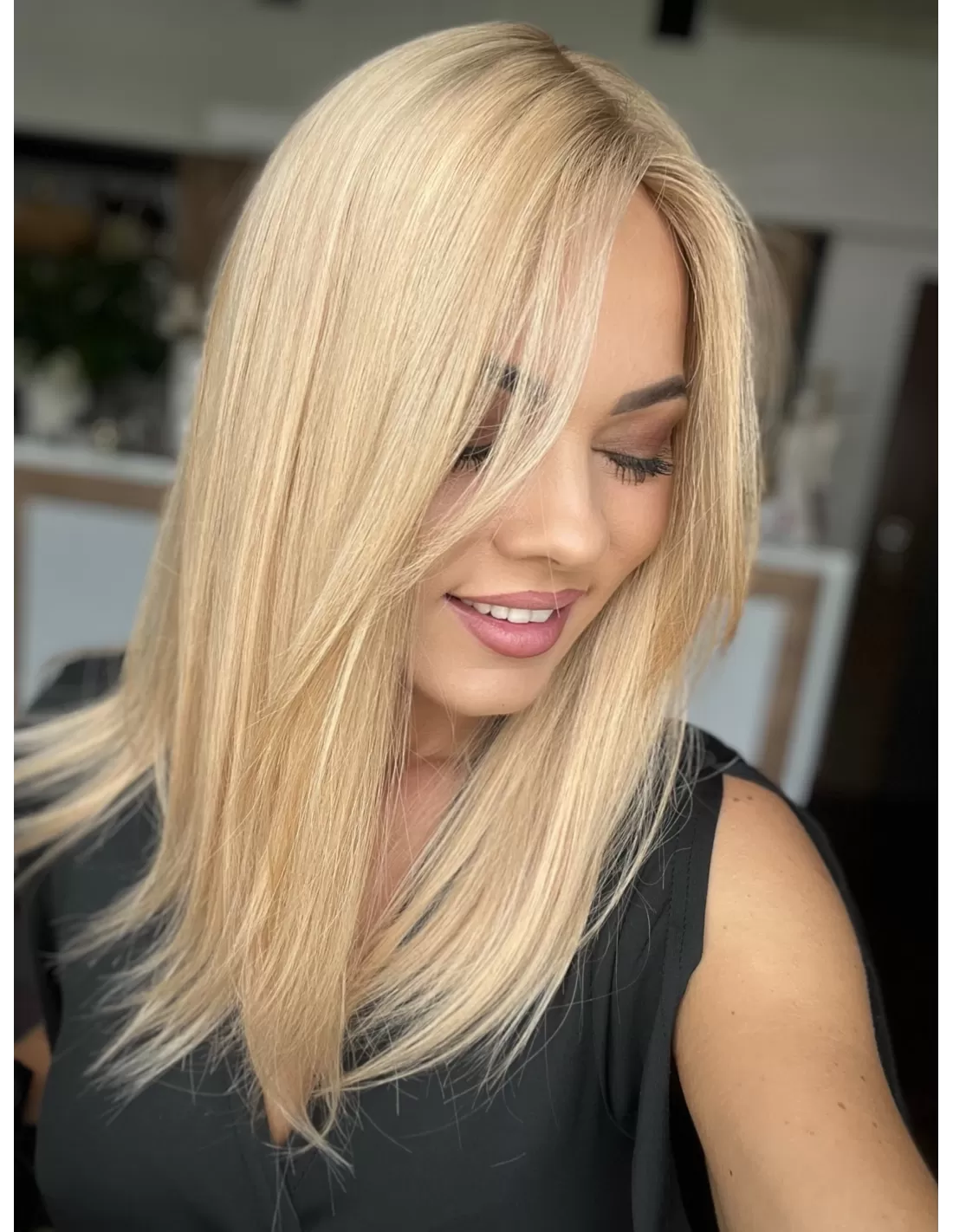 Topper Sheila, to absolutna definicja elegancji i subtelności. Jego lśniące włosy w odcieniach słonecznego blondu promieniują ciepłem i świeżością. Delikatny kontrast odrostu w kolorze ciemnego blondu nadaje mu niepowtarzalny charakter. To idealny dodatek, który dodaje blasku i pewności siebie, sprawiając, że każdy dzień staje się wyjątkowy.