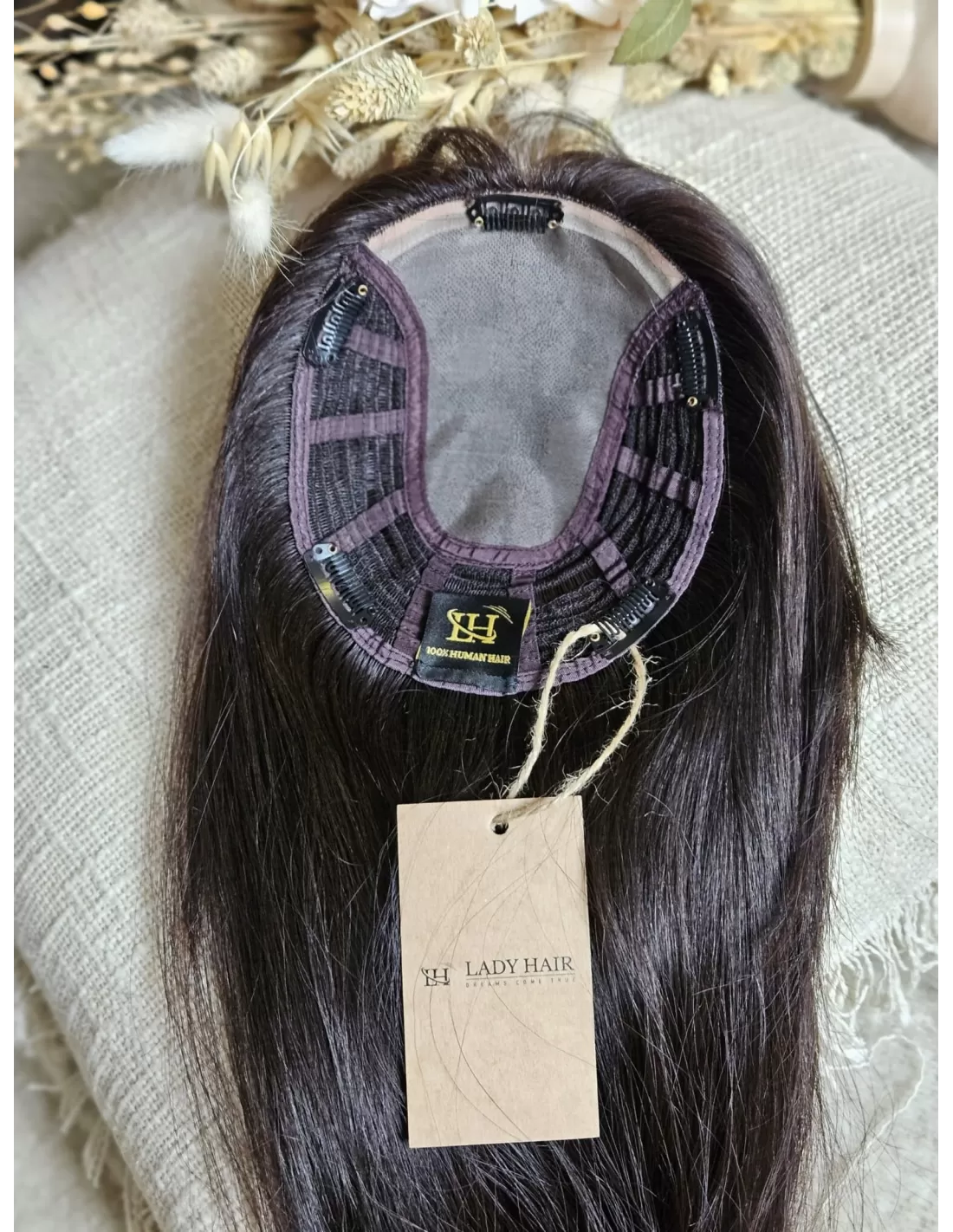 5 spinek Clip In: Topper jest wyposażony w 5 spinek typu "Clip In", które umożliwiają łatwe i bezpieczne przymocowanie do włosów naturalnych. Te spineczki zapewniają stabilność i pewność, że toper pozostanie na miejscu, nawet podczas aktywności.
