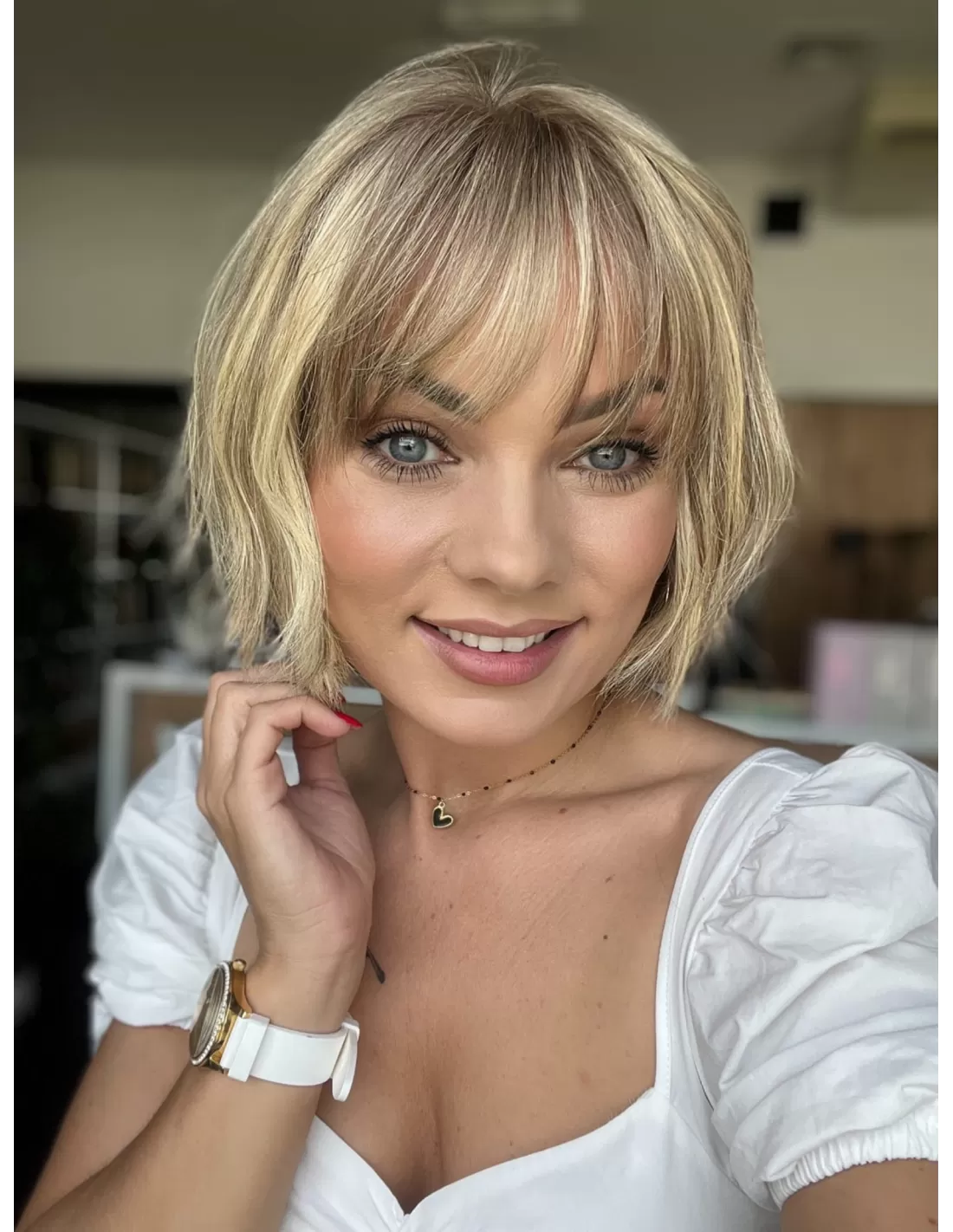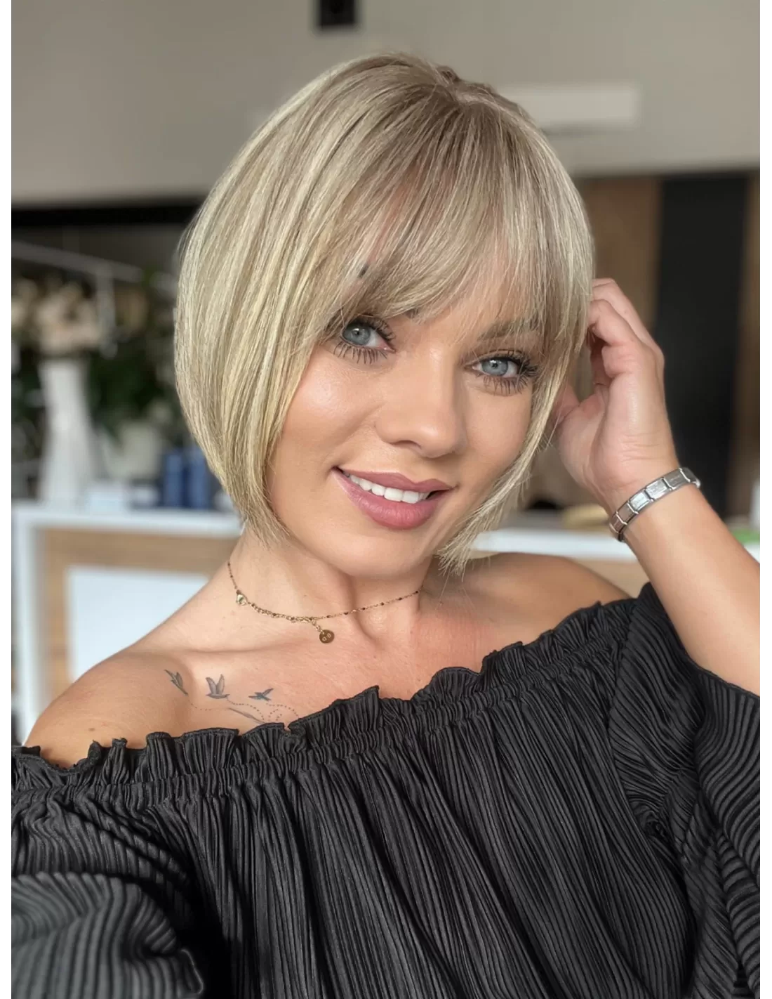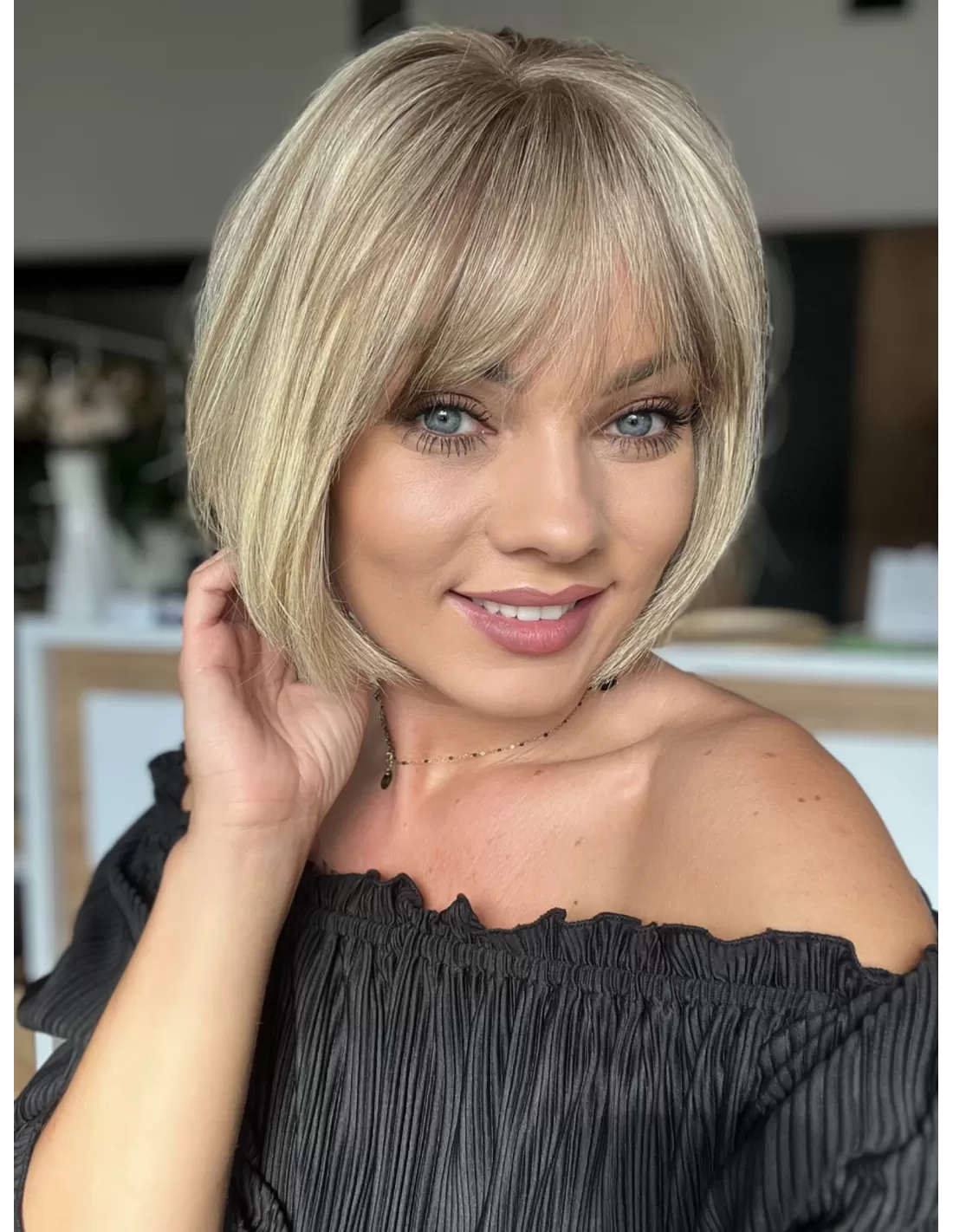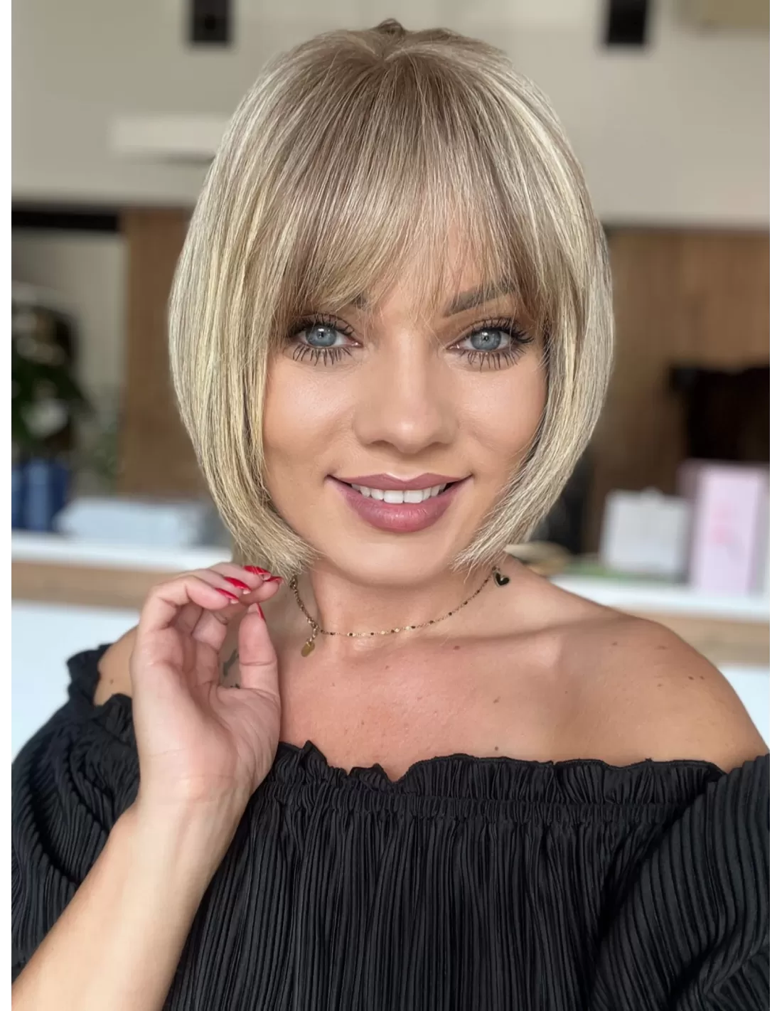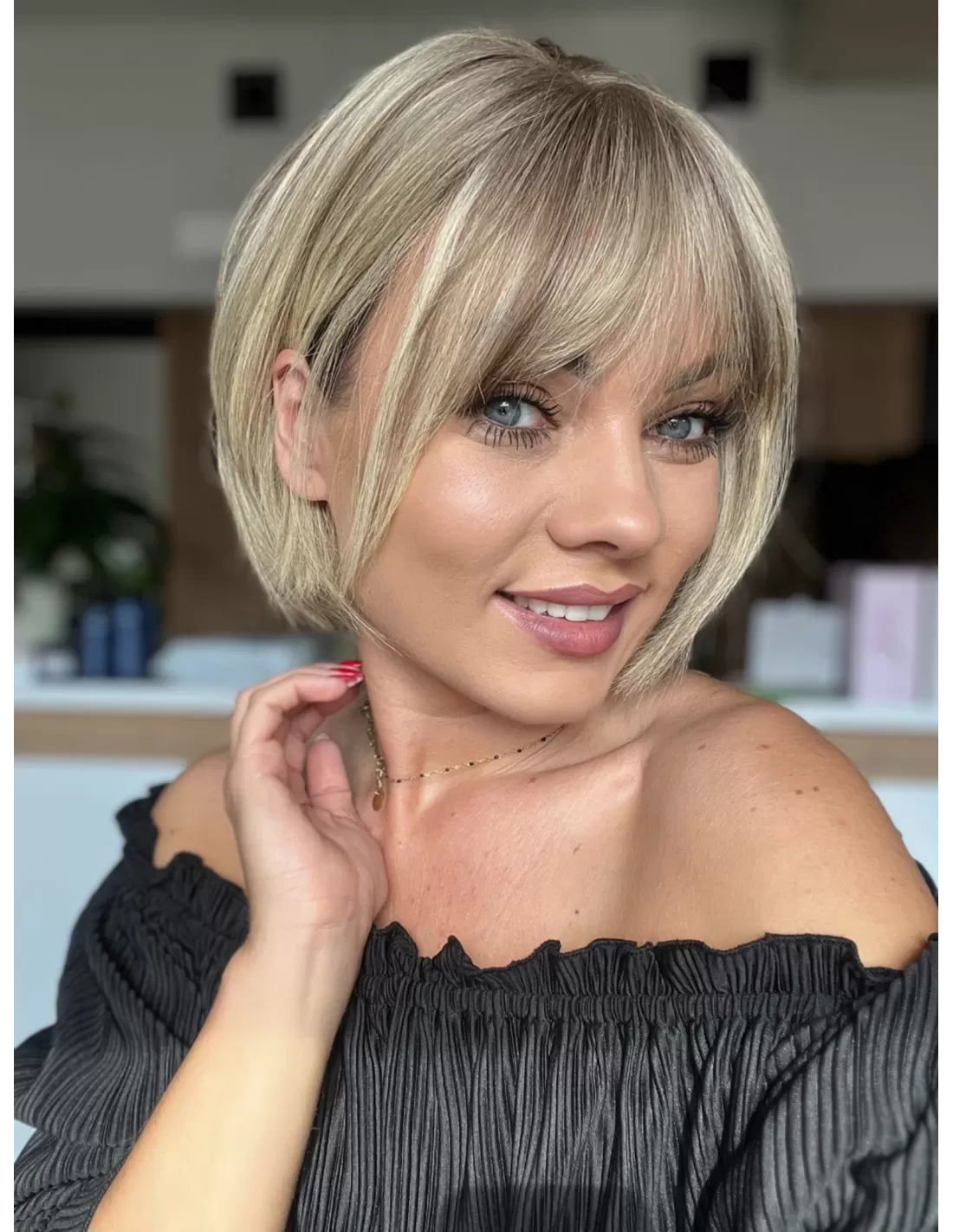 Dzięki obecności grzywki, masz możliwość różnorodnych stylizacji, w tym układania jej na bok. To doskonały dodatek, który podkreśla naturalność tej fryzury i daje ci większą swobodę w eksperymentowaniu z własnym stylem.
