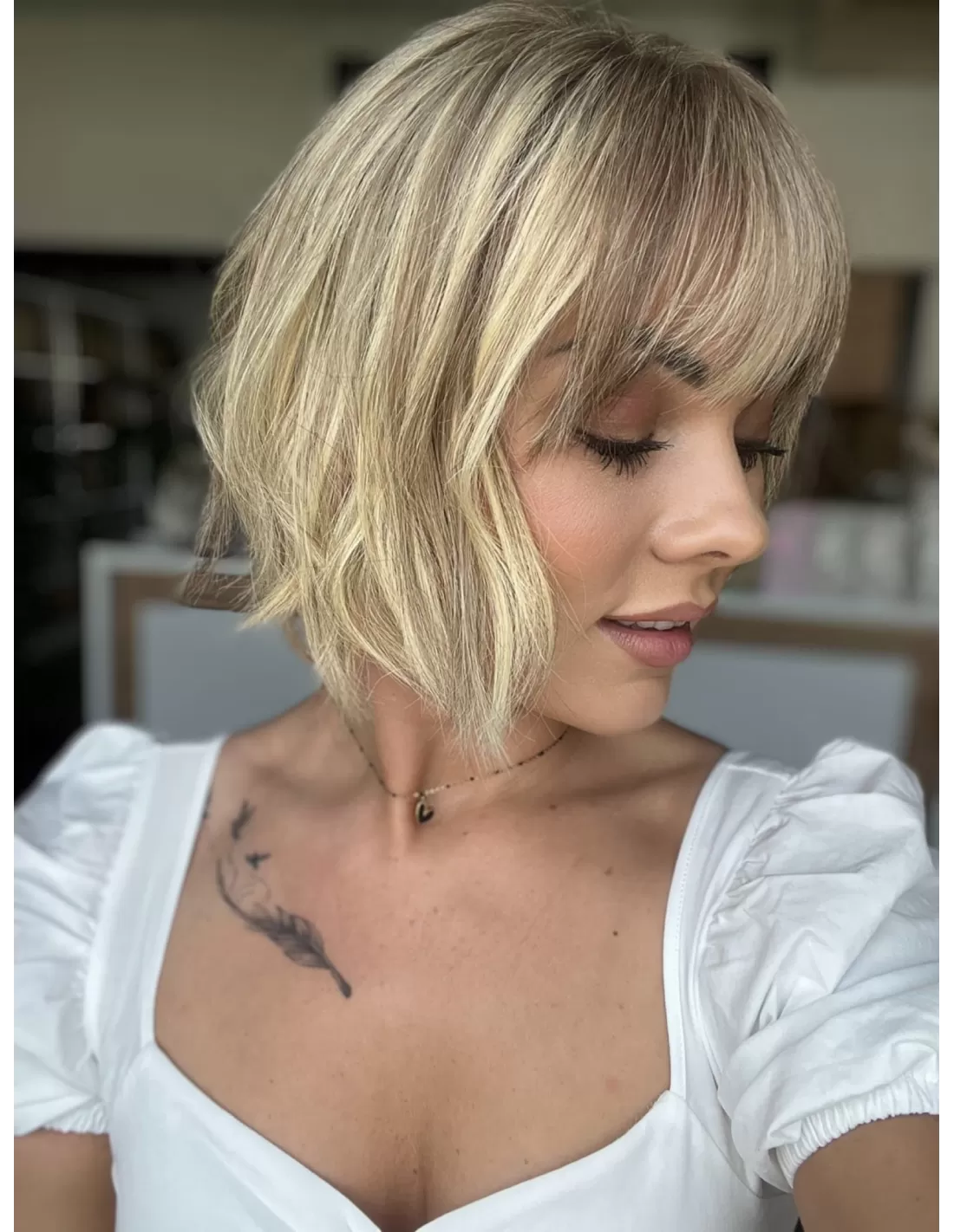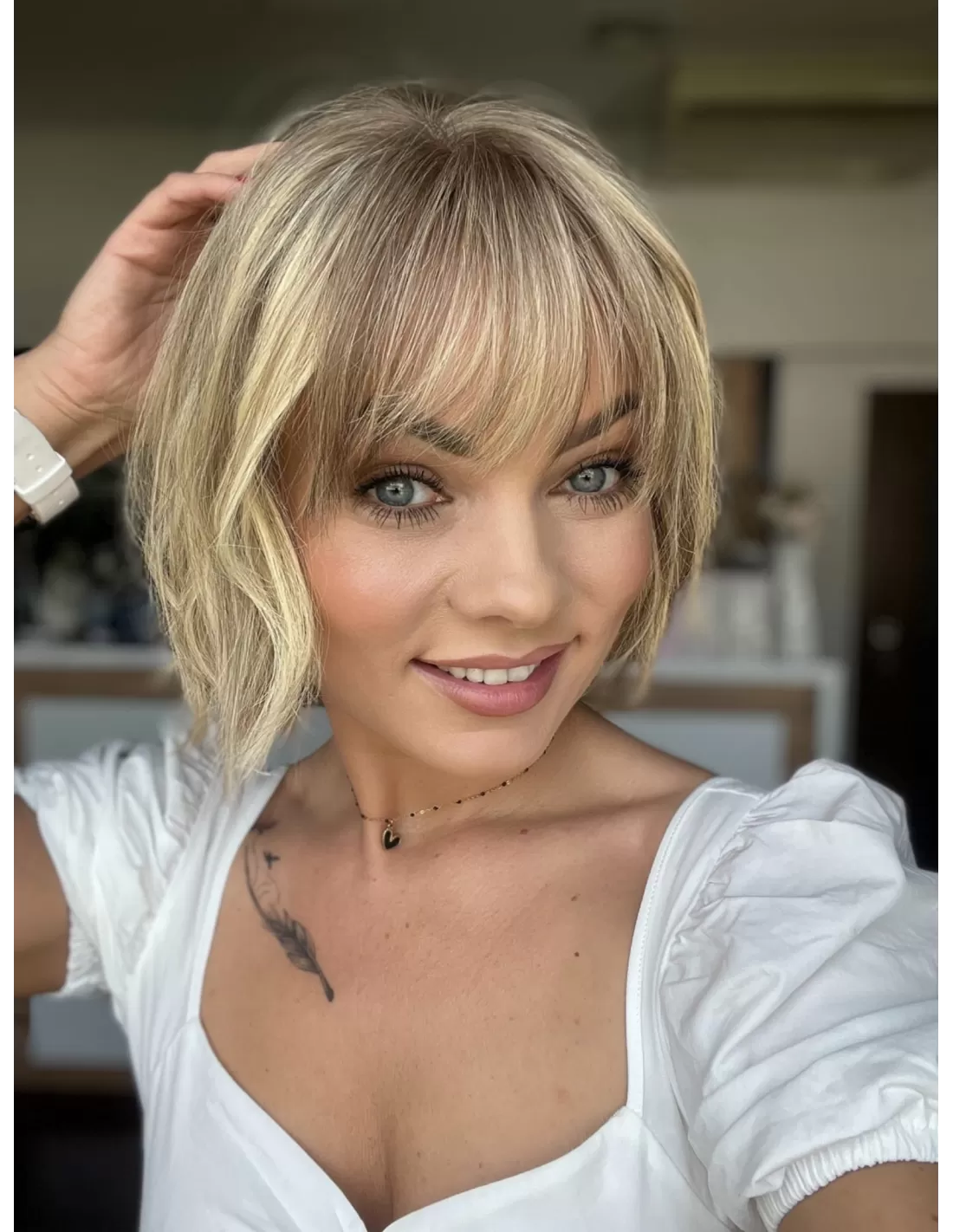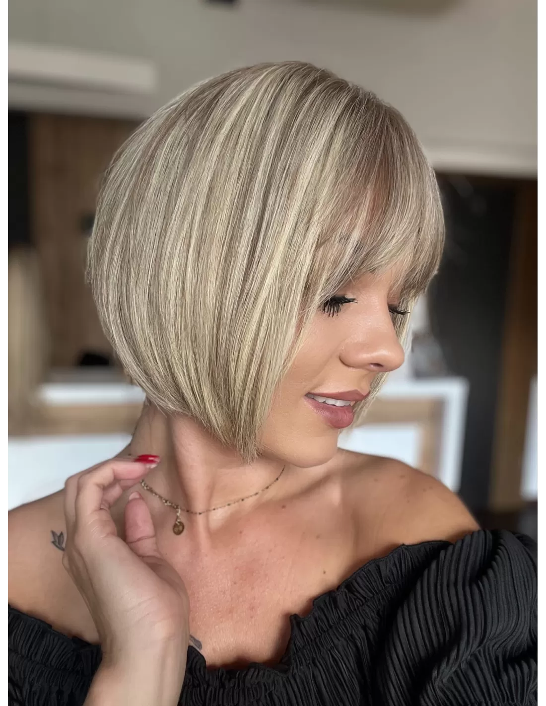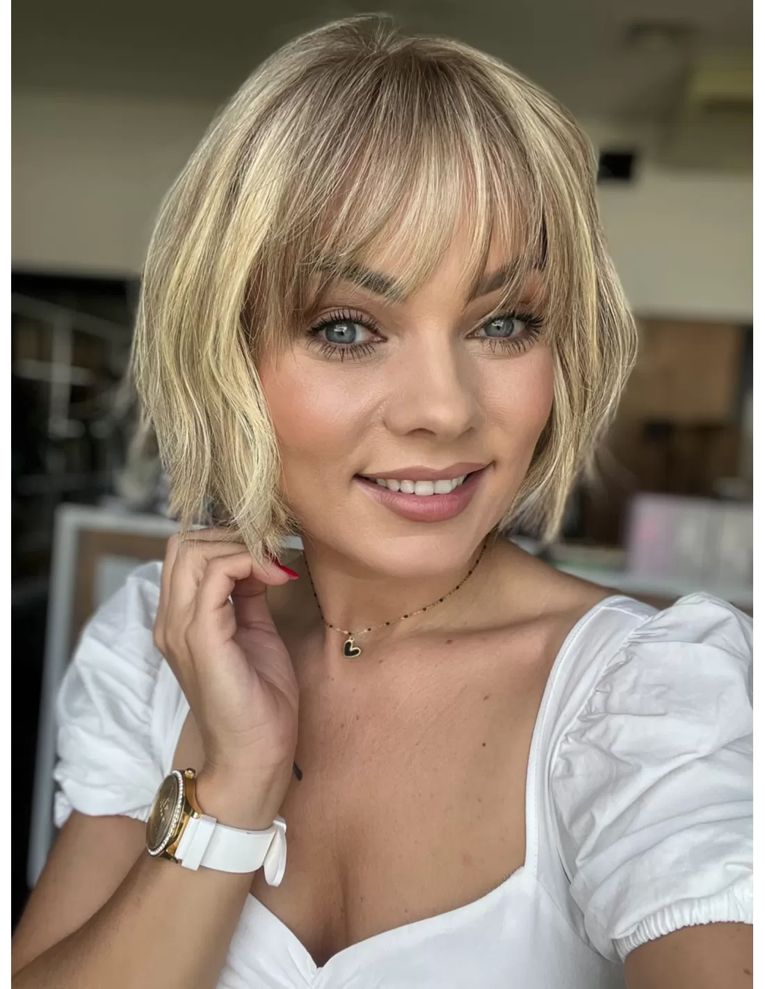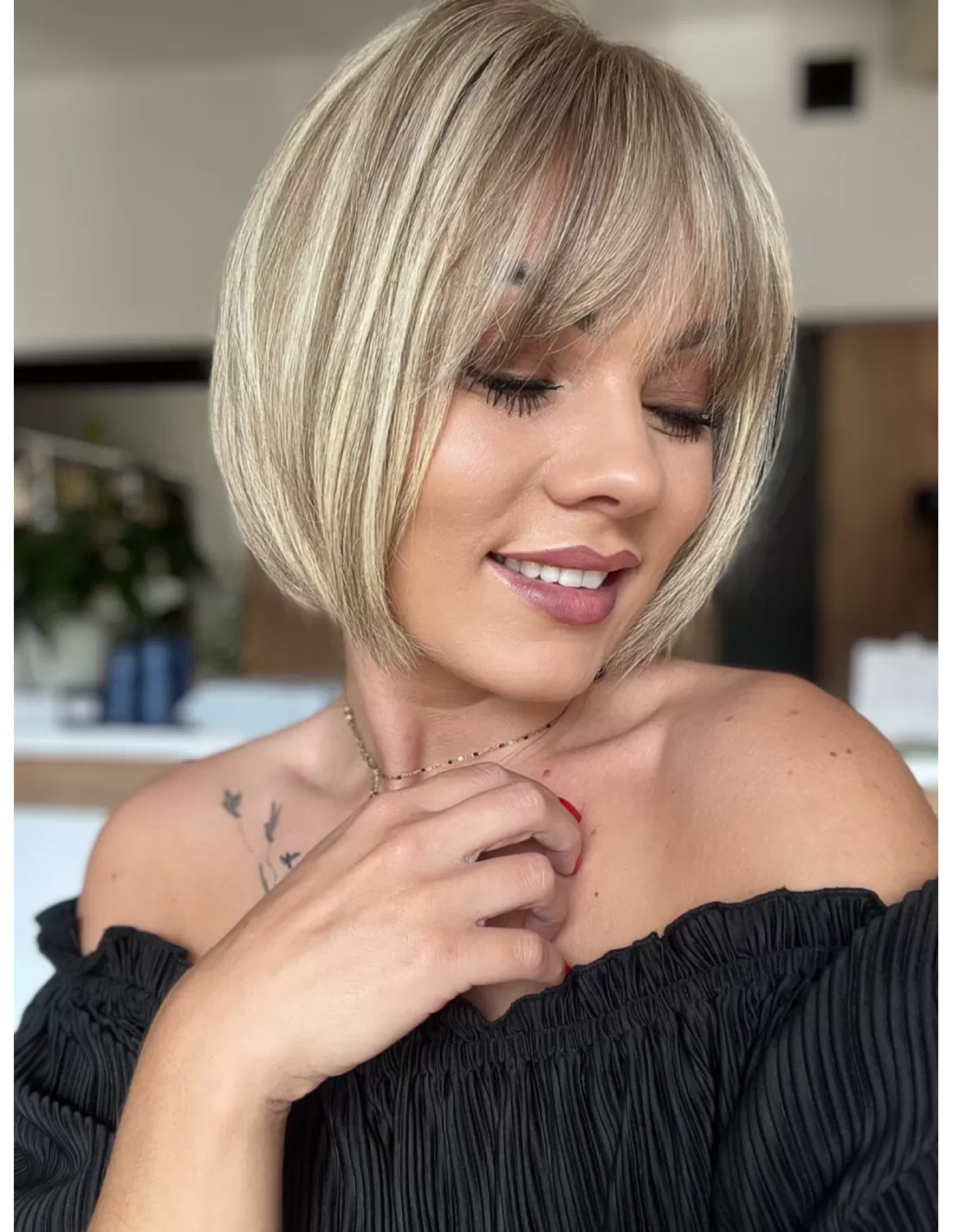 Dzięki obecności grzywki, masz możliwość różnorodnych stylizacji, w tym układania jej na bok. To doskonały dodatek, który podkreśla naturalność tej fryzury i daje ci większą swobodę w eksperymentowaniu z własnym stylem.