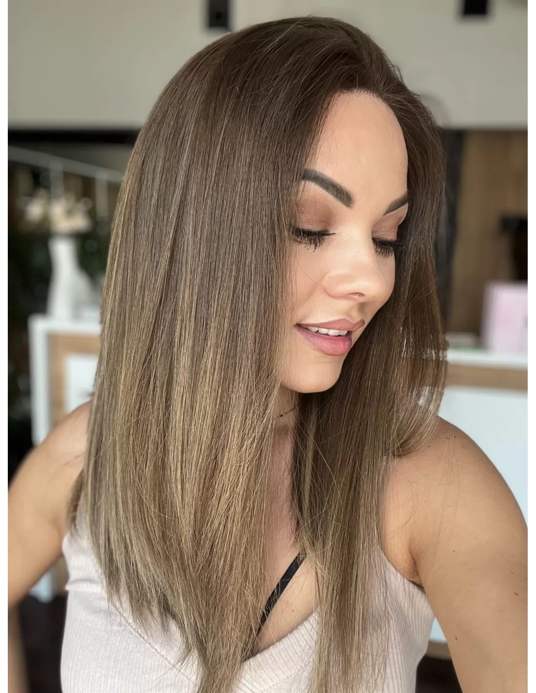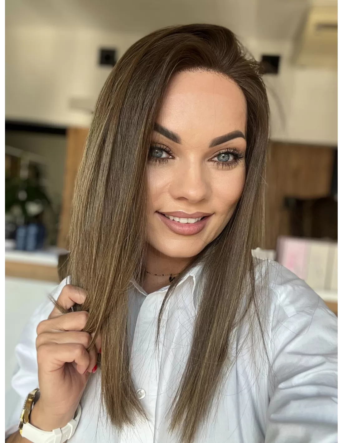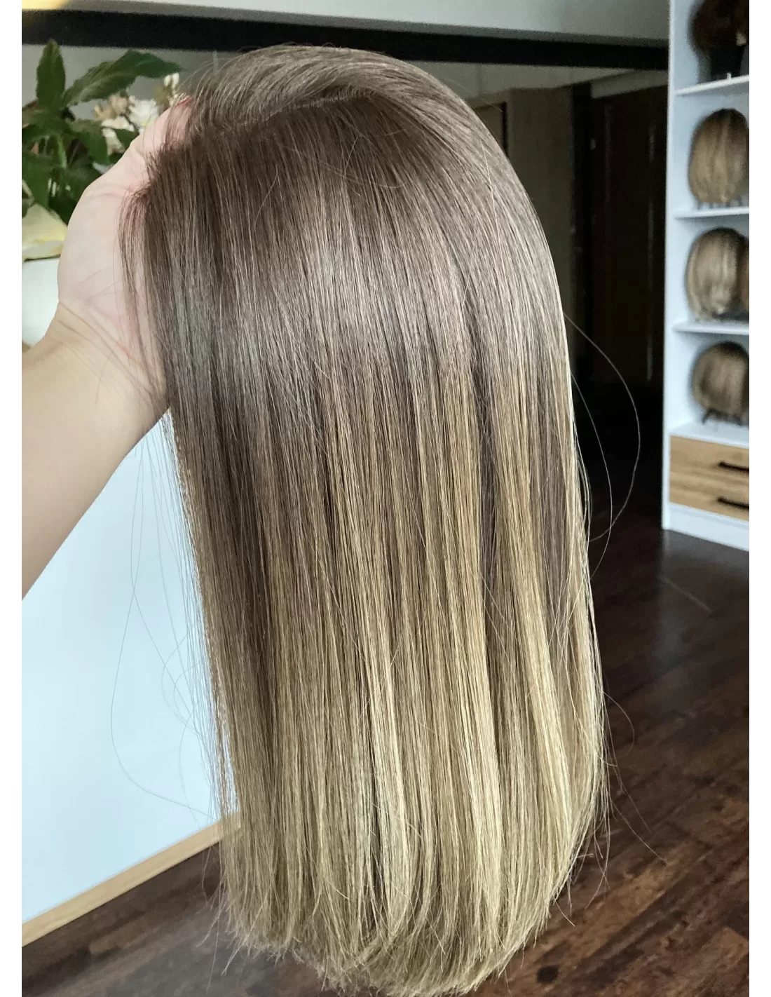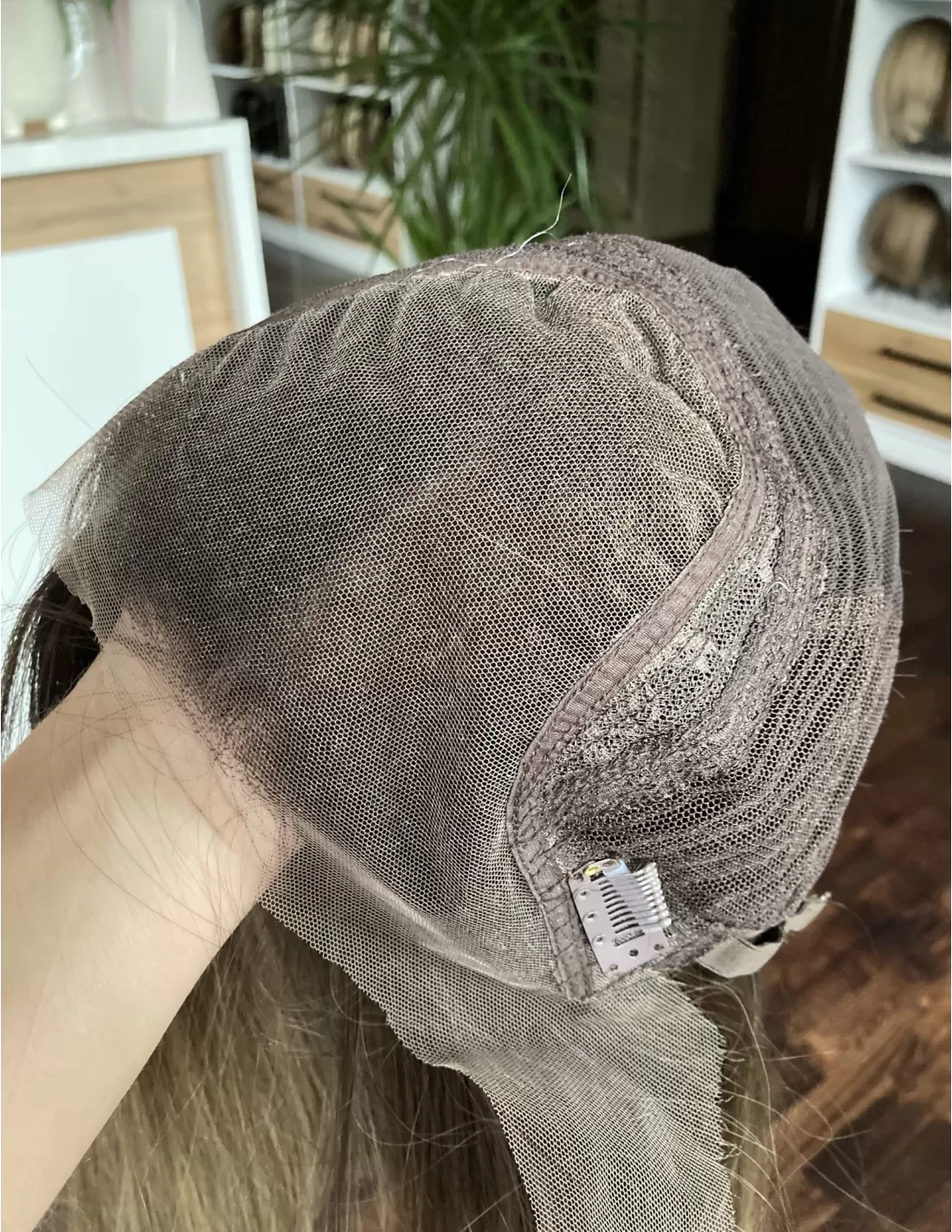 U nasady peruki znajduje się odrost w kolorze naturalnego brązu w chłodnym odcieniu , który dodaje kontrastu i głębi. Ten odcień stopniowo przechodzi w stonowany ciepły blond po długości, tworząc wyjątkowe przejście kolorów (ombre). Ostateczny efekt to harmonijne zestawienie naturalnego brązu i delikatnego ciepłego blondu po długości, co nadaje peruce wyjątkowego uroku.