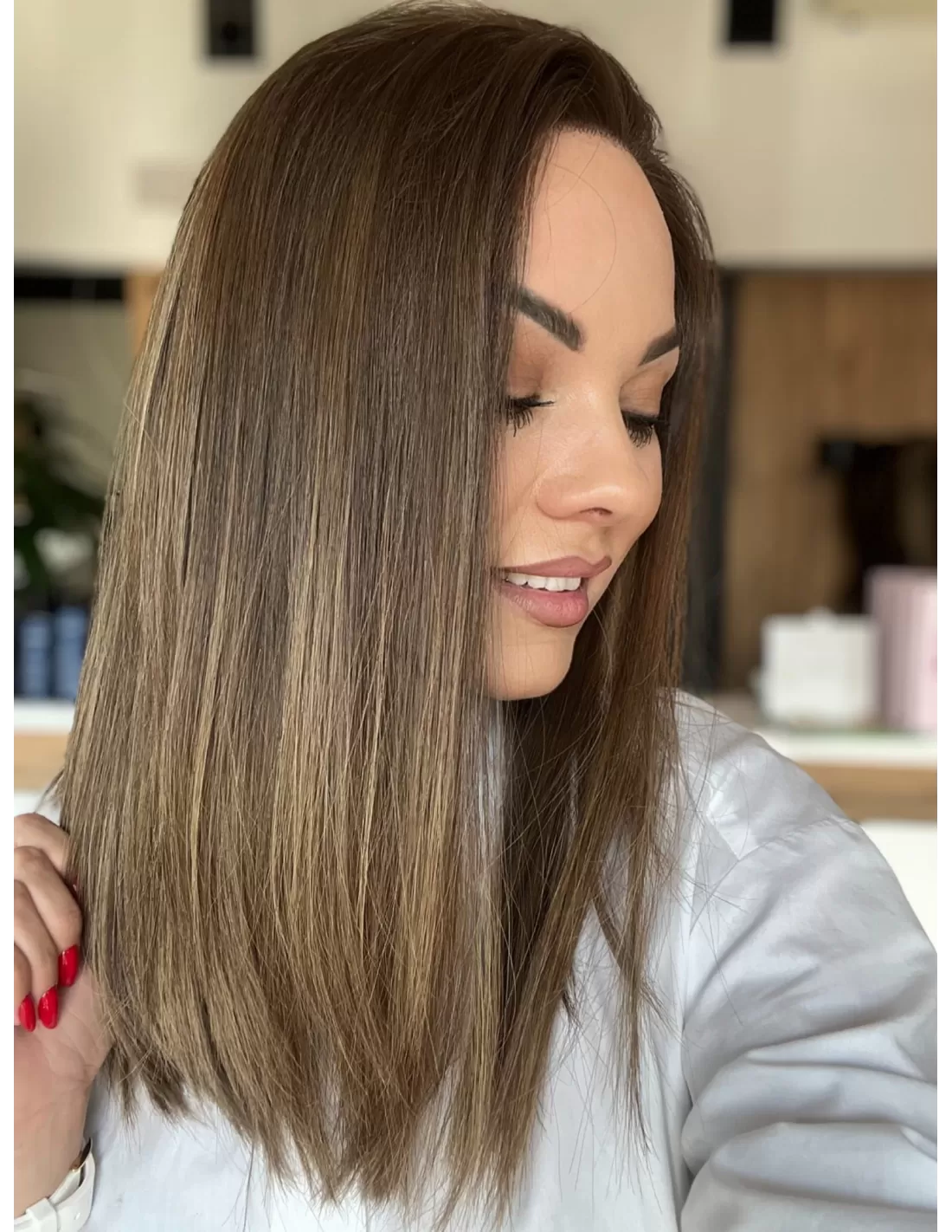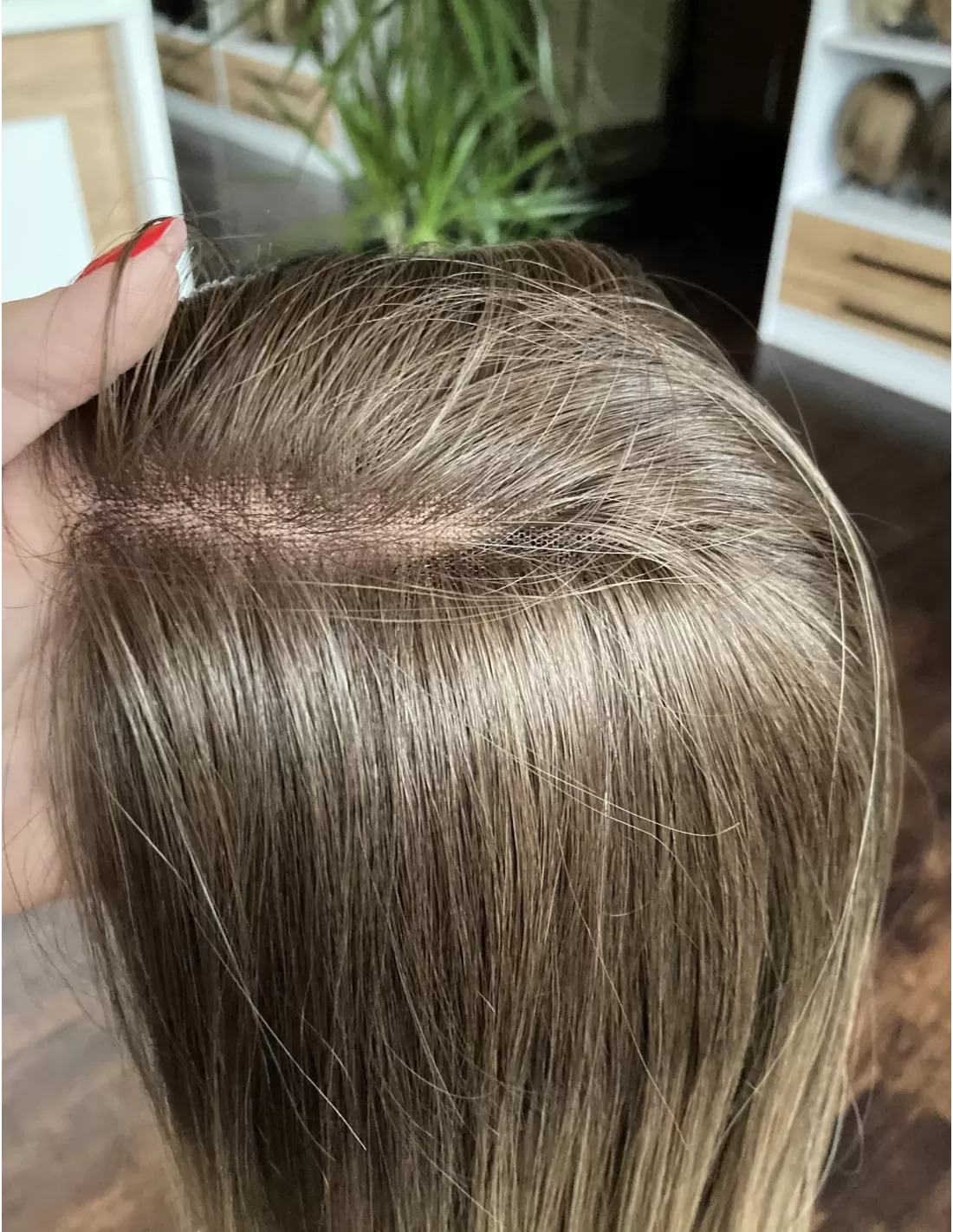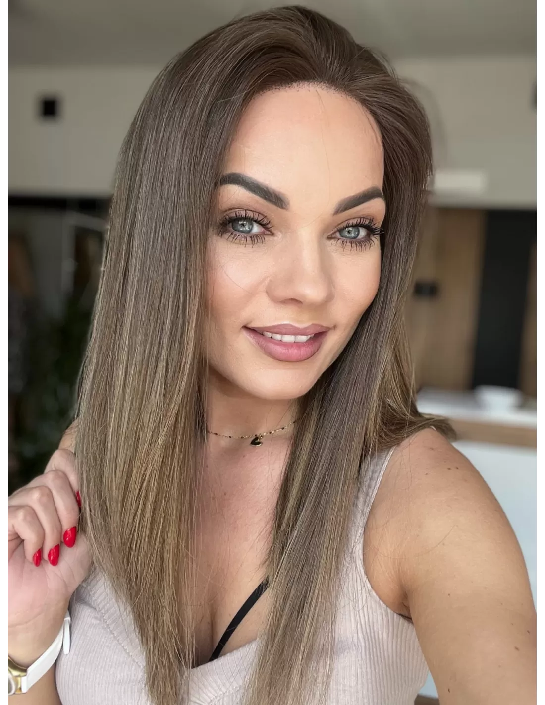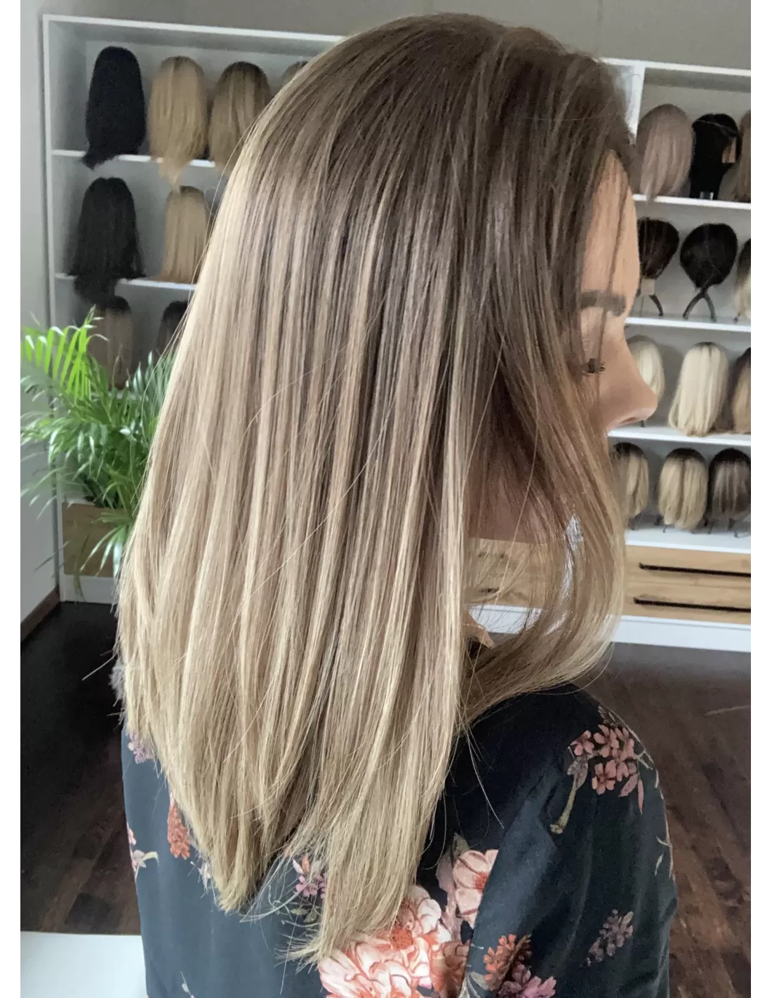 U nasady peruki znajduje się odrost w kolorze naturalnego brązu w chłodnym odcieniu , który dodaje kontrastu i głębi. Ten odcień stopniowo przechodzi w stonowany ciepły blond po długości, tworząc wyjątkowe przejście kolorów (ombre). Ostateczny efekt to harmonijne zestawienie naturalnego brązu i delikatnego ciepłego blondu po długości, co nadaje peruce wyjątkowego uroku.