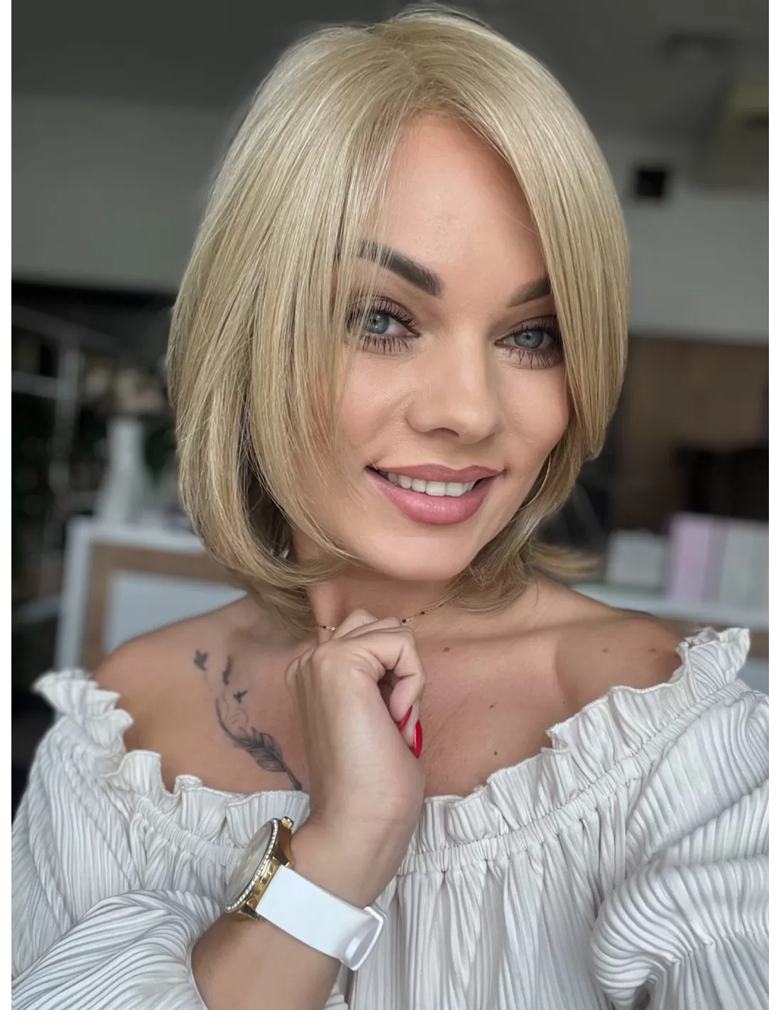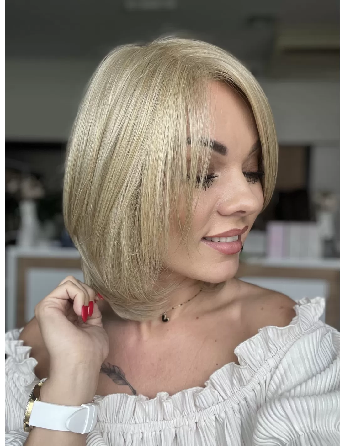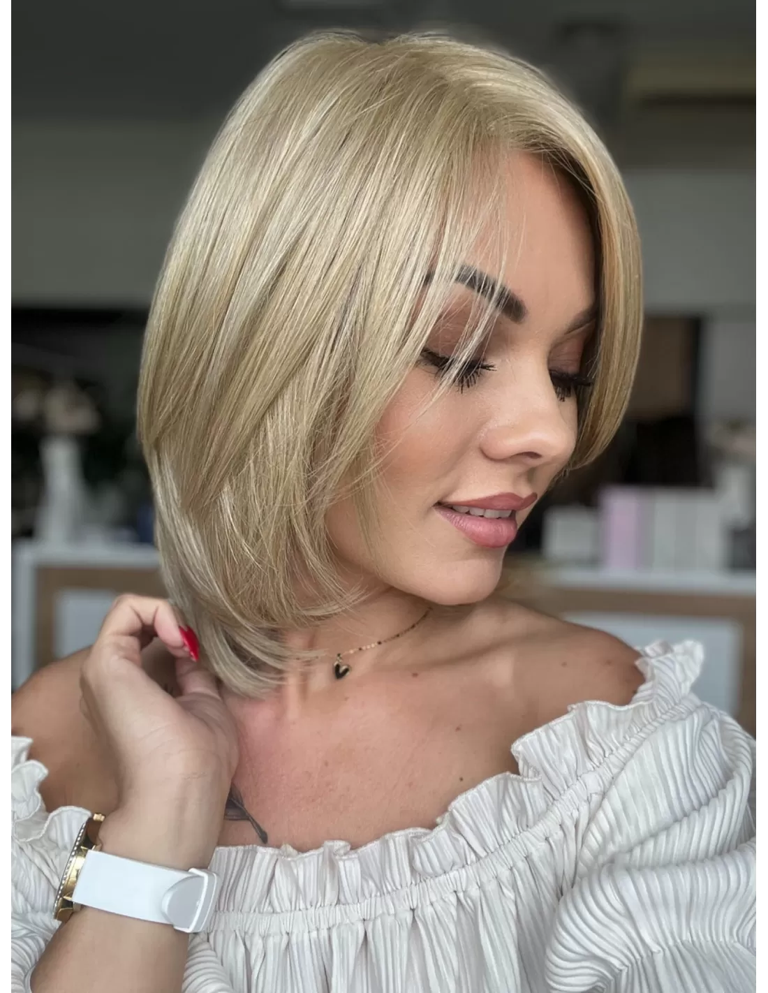 Peruka AURORA to model wykonany maszynowo z przedziałkiem oraz rozmytą linią grzywki z włosa syntetycznego odpornego termicznie do temperatury do 160◦ C. Wyjątkowy fason w kolekcji STARDUST wykonany z dłuższych włosów co pozwala na wszechstronność stylizacji.