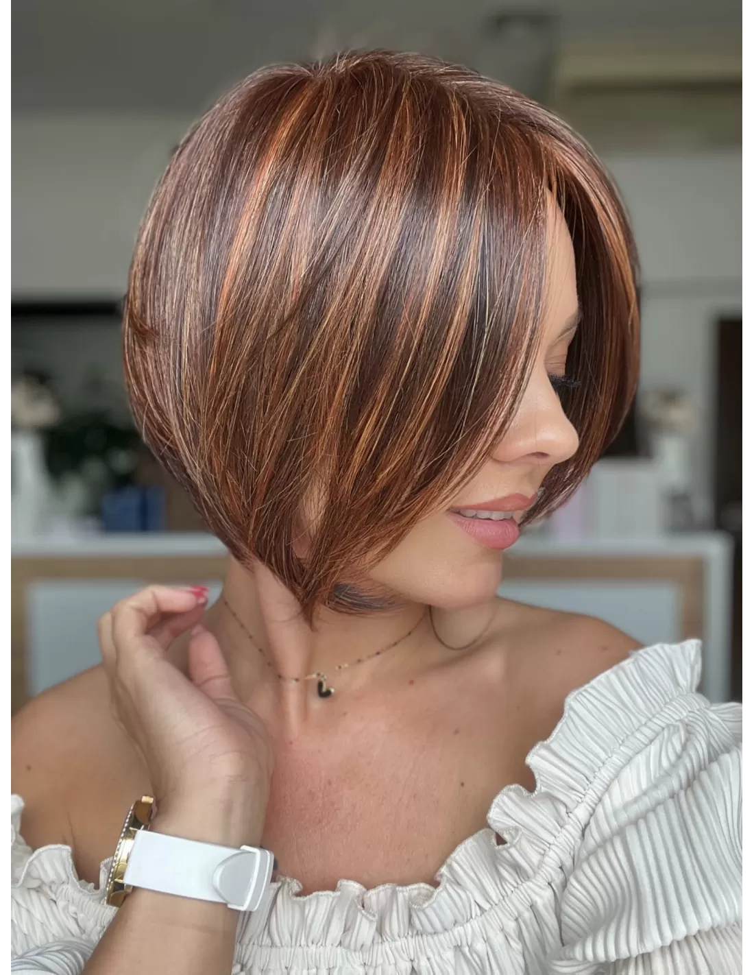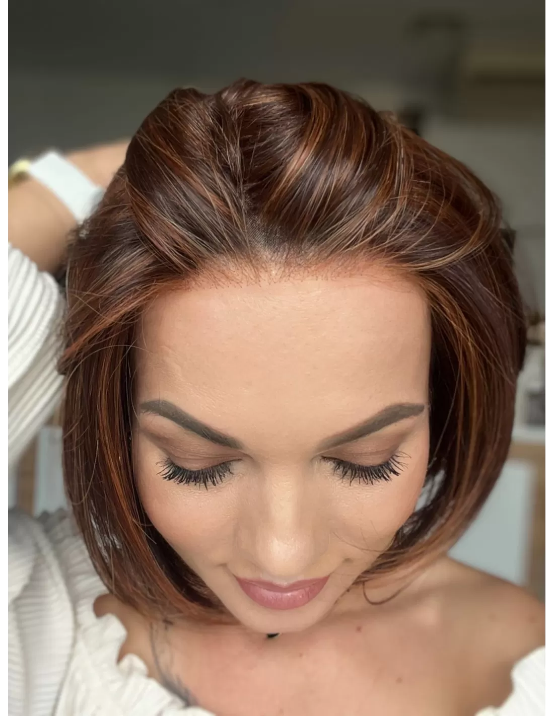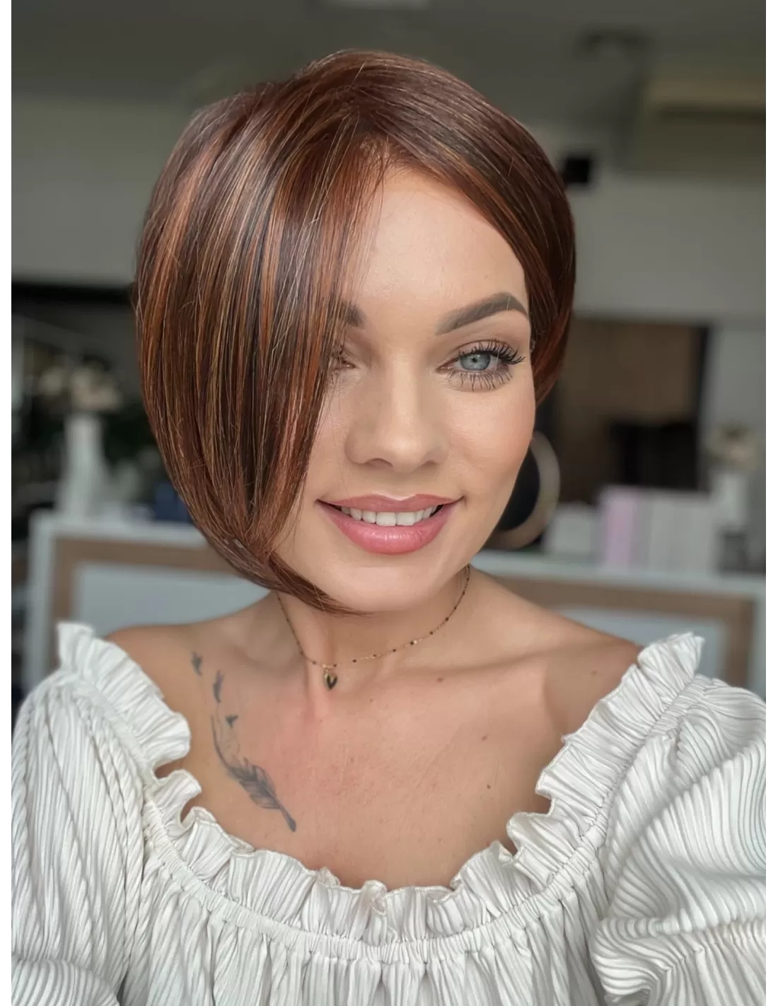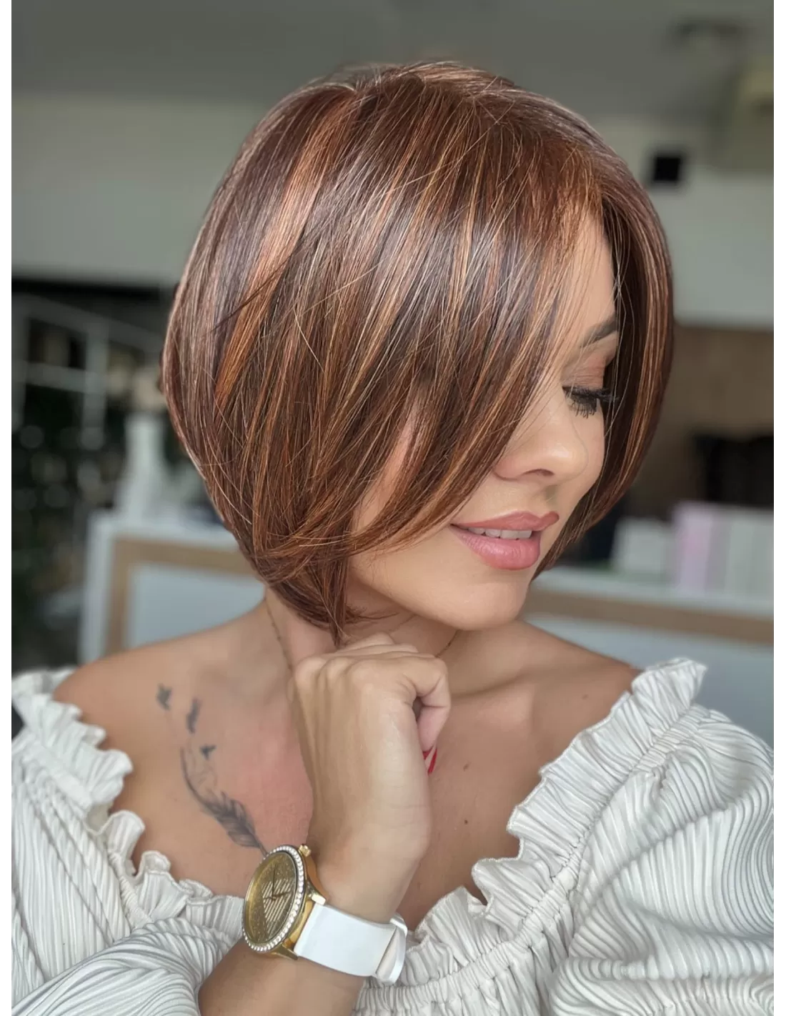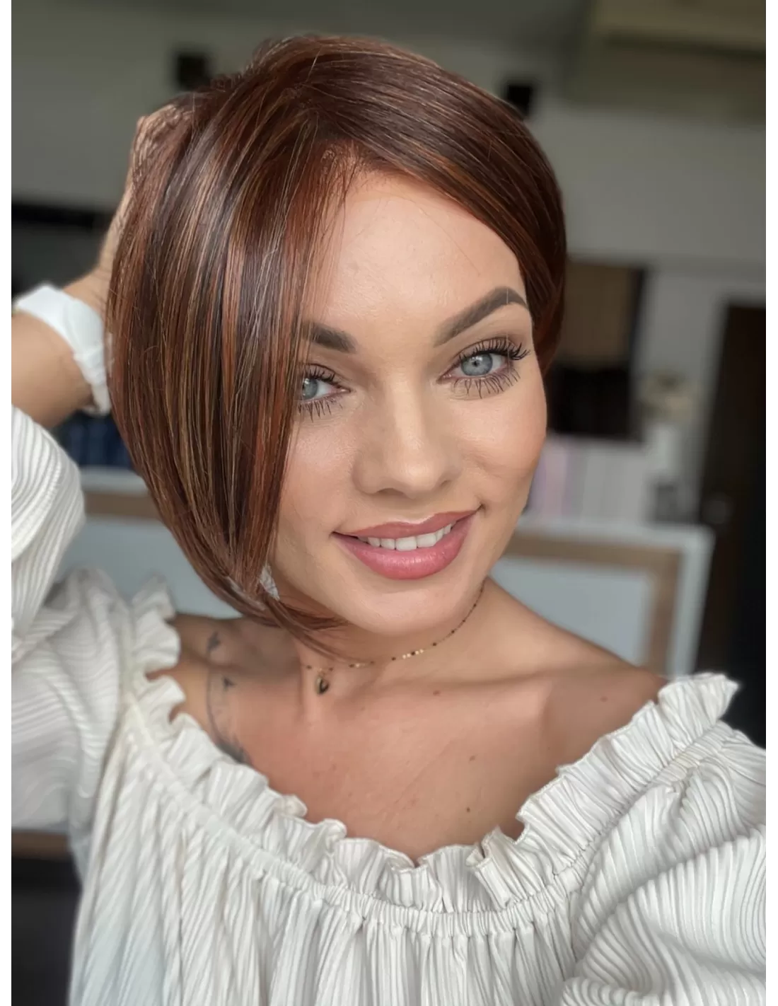 Prezentowany kolor peruki to kasztanowy brąz z refleksami