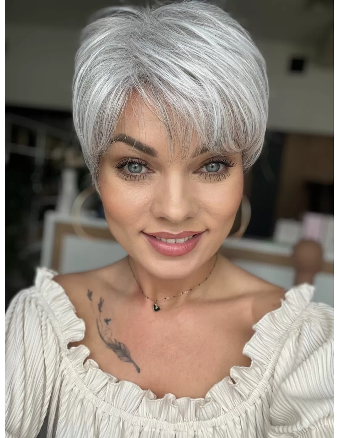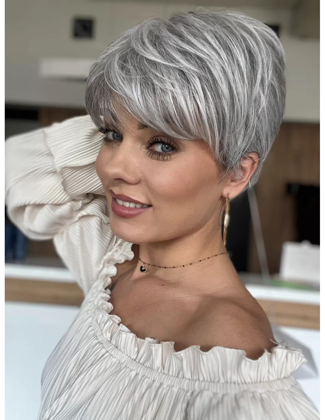 Peruka Izar to model wykonany maszynowo z rozmytą linią grzywki z włosa syntetycznego odpornego termicznie. Włosy odporne termicznie do temperatury do 160◦ C. Model wyjątkowo uniwersalny, krótki dla osób ceniących wygodę i łatwość w uczesaniu.