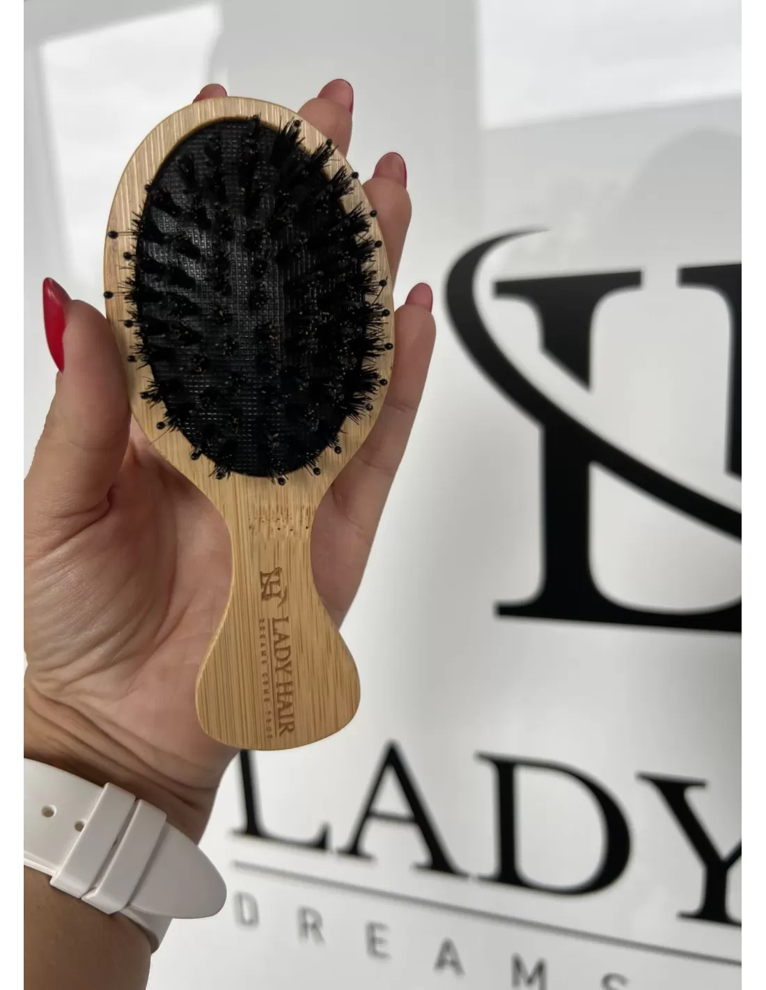 Lady HairMini Szczotka Lady Hair z włosiem dzika i elegancką drewnianą rączką z bambusa to doskonałe narzędzie do pielęgnacji peruk i topperów z włosów naturalnych. Jej unikalny design łączy w sobie funkcjonalność z ekologiczną troską o środowisko.