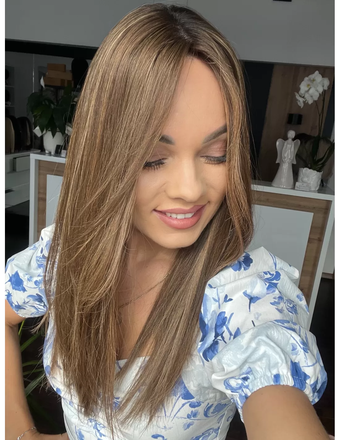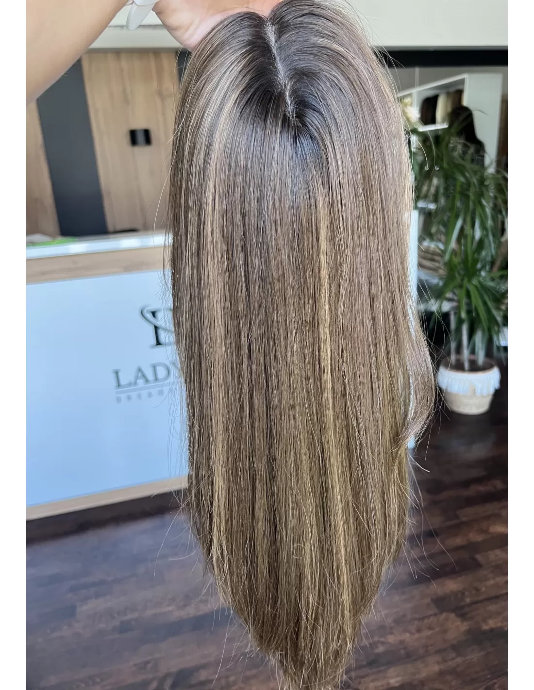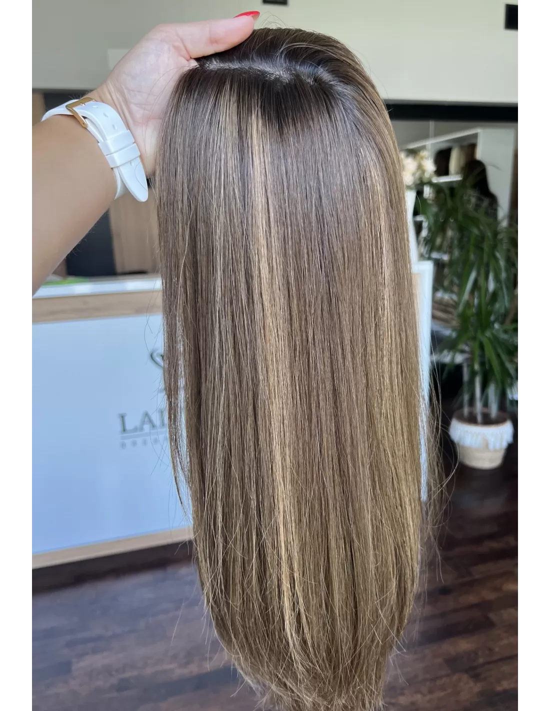 Przedstawiamy wyjątkowy topper z włosów naturalnych Aisha wykonany z najwyższej jakości włosów naturalnych europejskich. Odrost w kolorze średniego brązu dodaje charakteru, tworząc subtelny kontrast. Delikatne refleksy na długości toppera nadają mu elegancji i subtelności, natomiast ciemniejszy odrost nadaje kontrastu całej fryzurze To doskonały wybór dla tych, którzy pragną oryginalności i naturalności w jednym. Elastyczna baza zapewniają idealne dopasowanie do kształtu głowy .