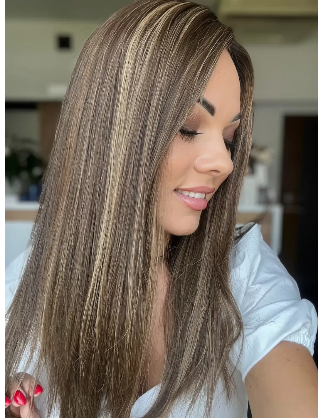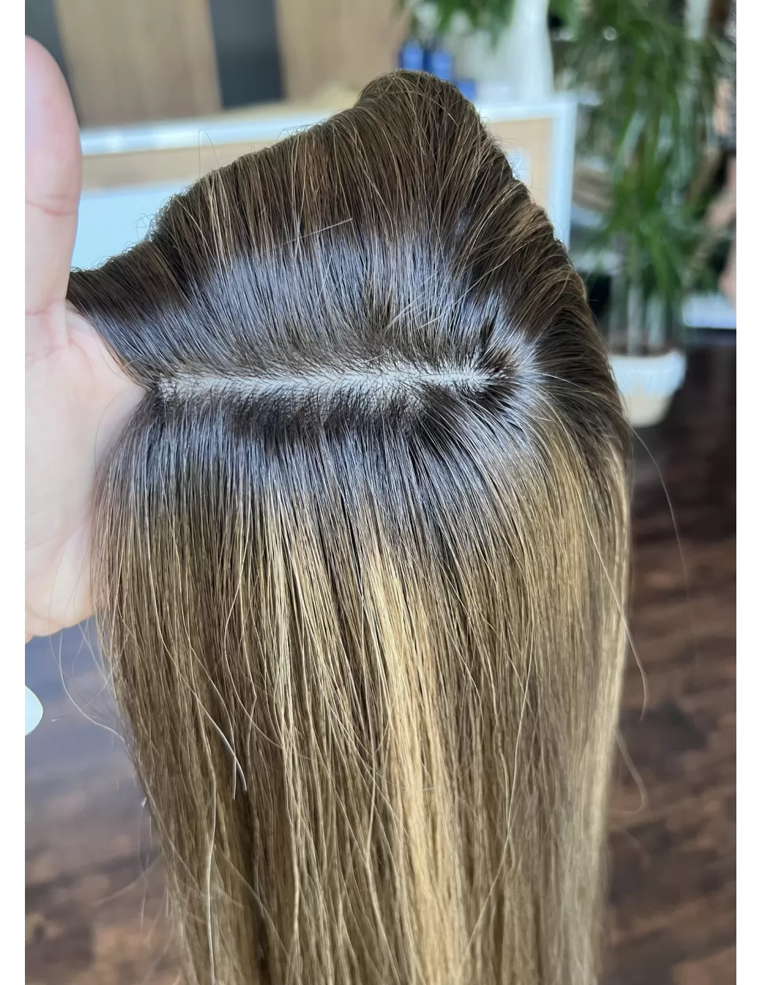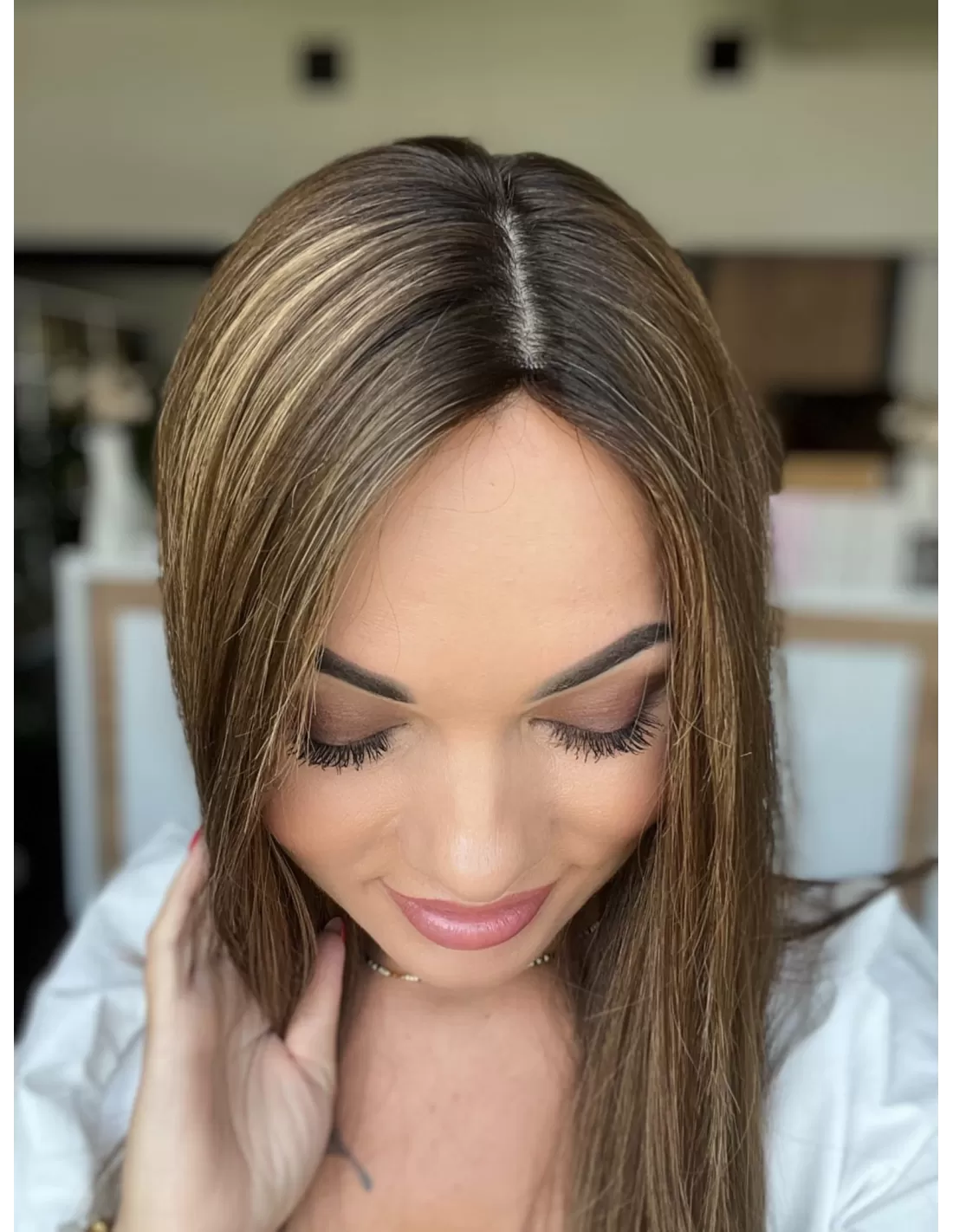 Przedstawiamy wyjątkowy topper z włosów naturalnych Aisha wykonany z najwyższej jakości włosów naturalnych europejskich. Odrost w kolorze średniego brązu dodaje charakteru, tworząc subtelny kontrast. Delikatne refleksy na długości toppera nadają mu elegancji i subtelności, natomiast ciemniejszy odrost nadaje kontrastu całej fryzurze To doskonały wybór dla tych, którzy pragną oryginalności i naturalności w jednym. Elastyczna baza zapewniają idealne dopasowanie do kształtu głowy .
