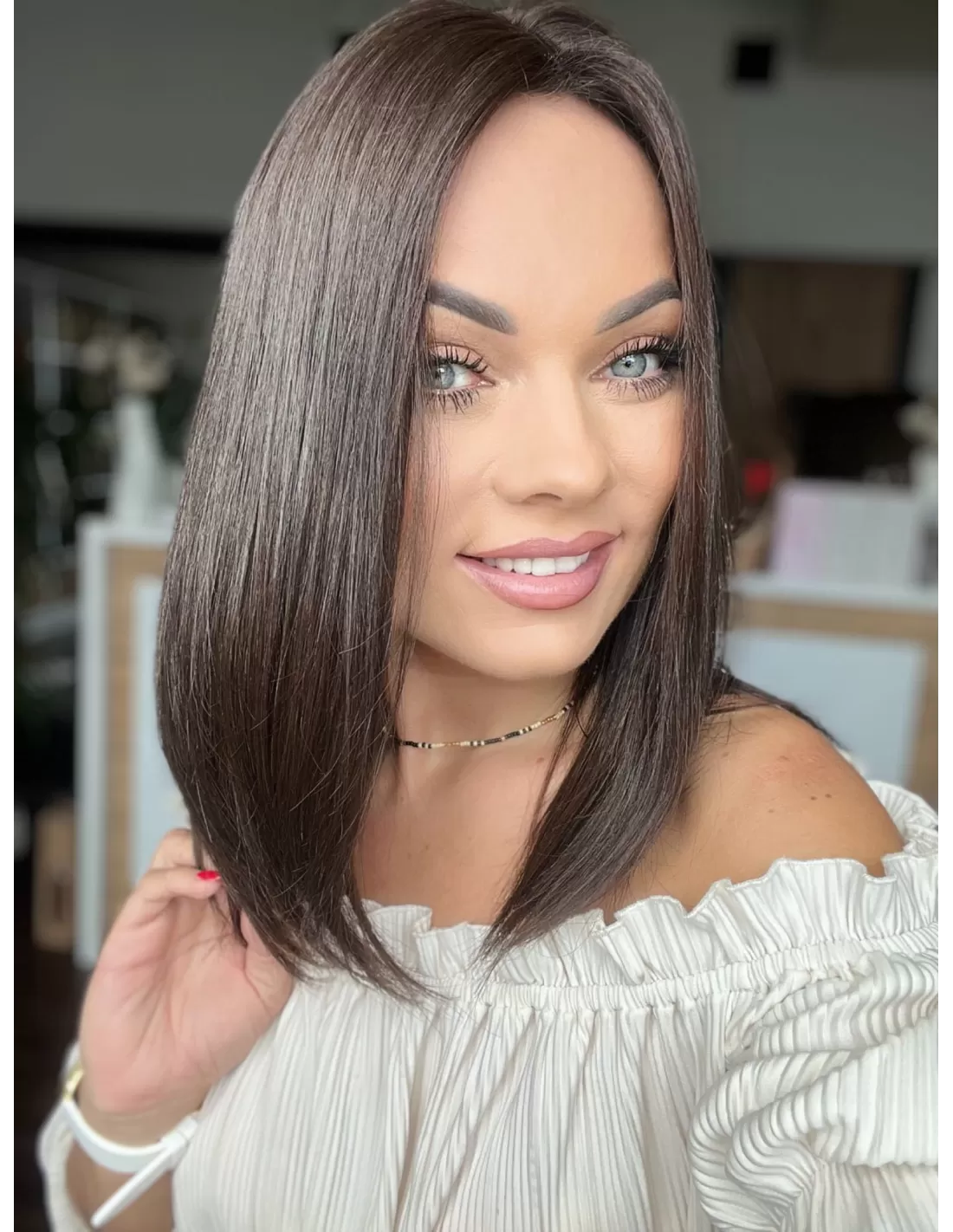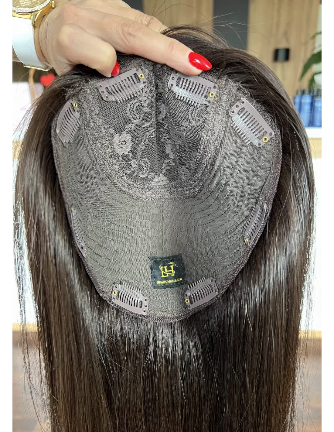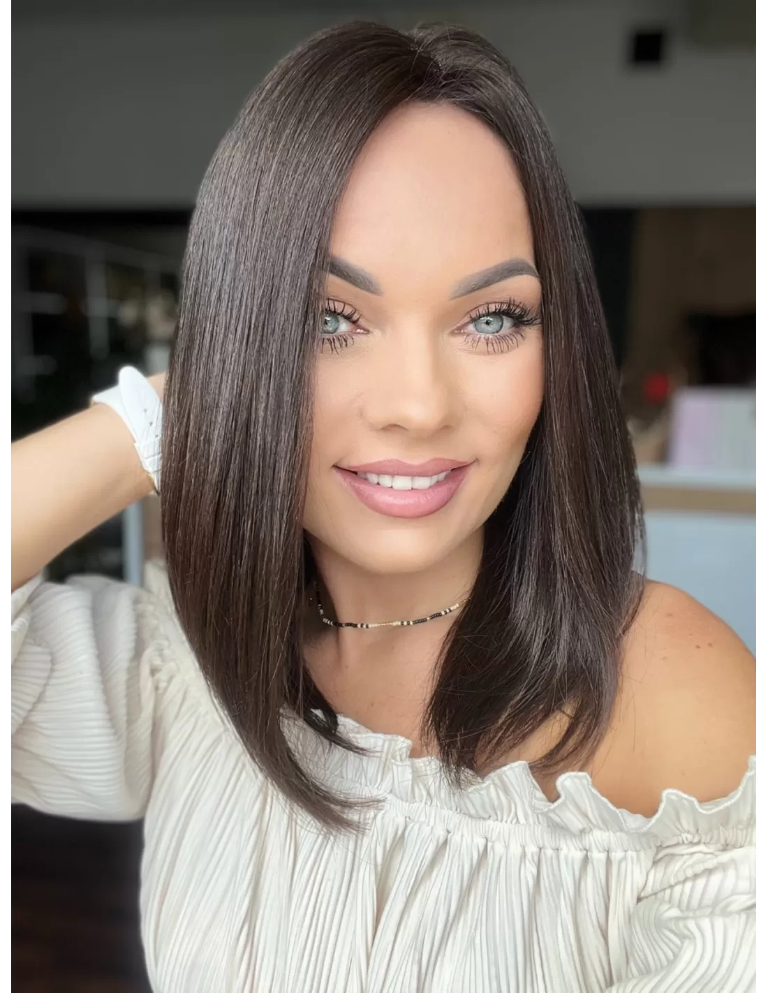 Topper Nila powstał z wyselekcjonowanych, naturalnych włosów w głębokim odcieniu ciemnego czekoladowego brązu (#2). Nila, to kwintesencja elegancji i luksusu. Jego gładka, jedwabista struktura subtelnie otula fryzurę, dodając jednocześnie wyjątkowego blasku. Każdy pasmo toppera emanuje naturalnym pięknem, ponieważ składa się z autentycznych włosów, co gwarantuje niezrównaną jakość. To idealne rozwiązanie dla tych, którzy pragną osiągnąć perfekcyjny efekt, łączący autentyczność z wyrafinowanym stylem.