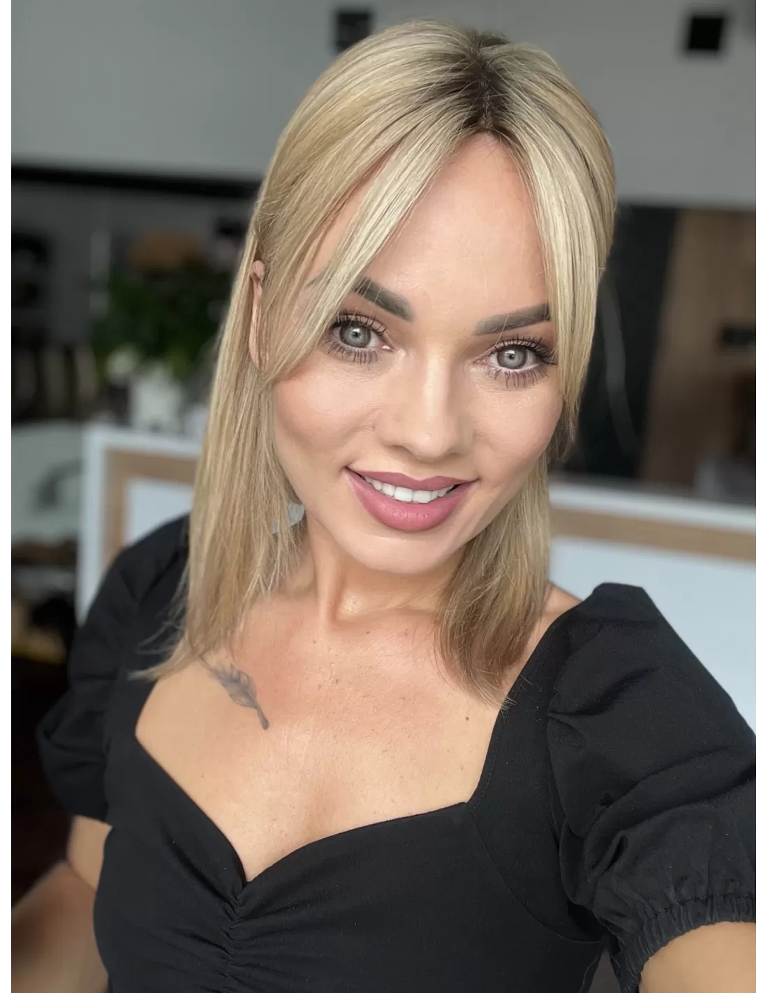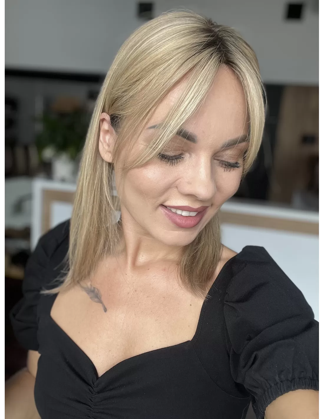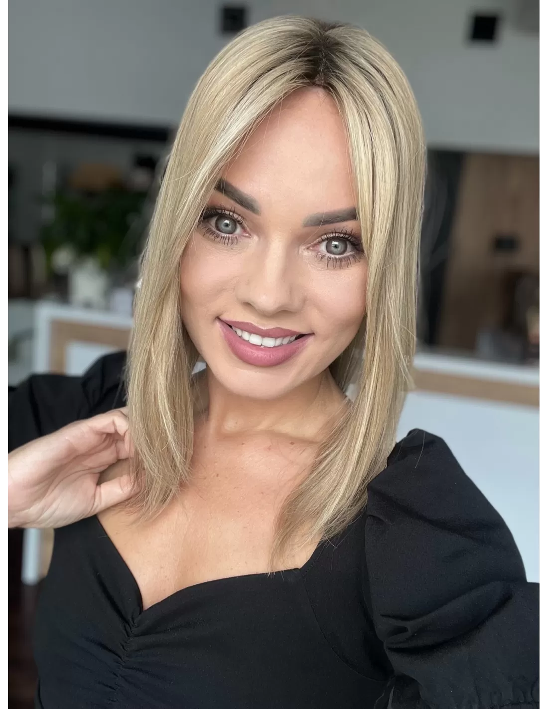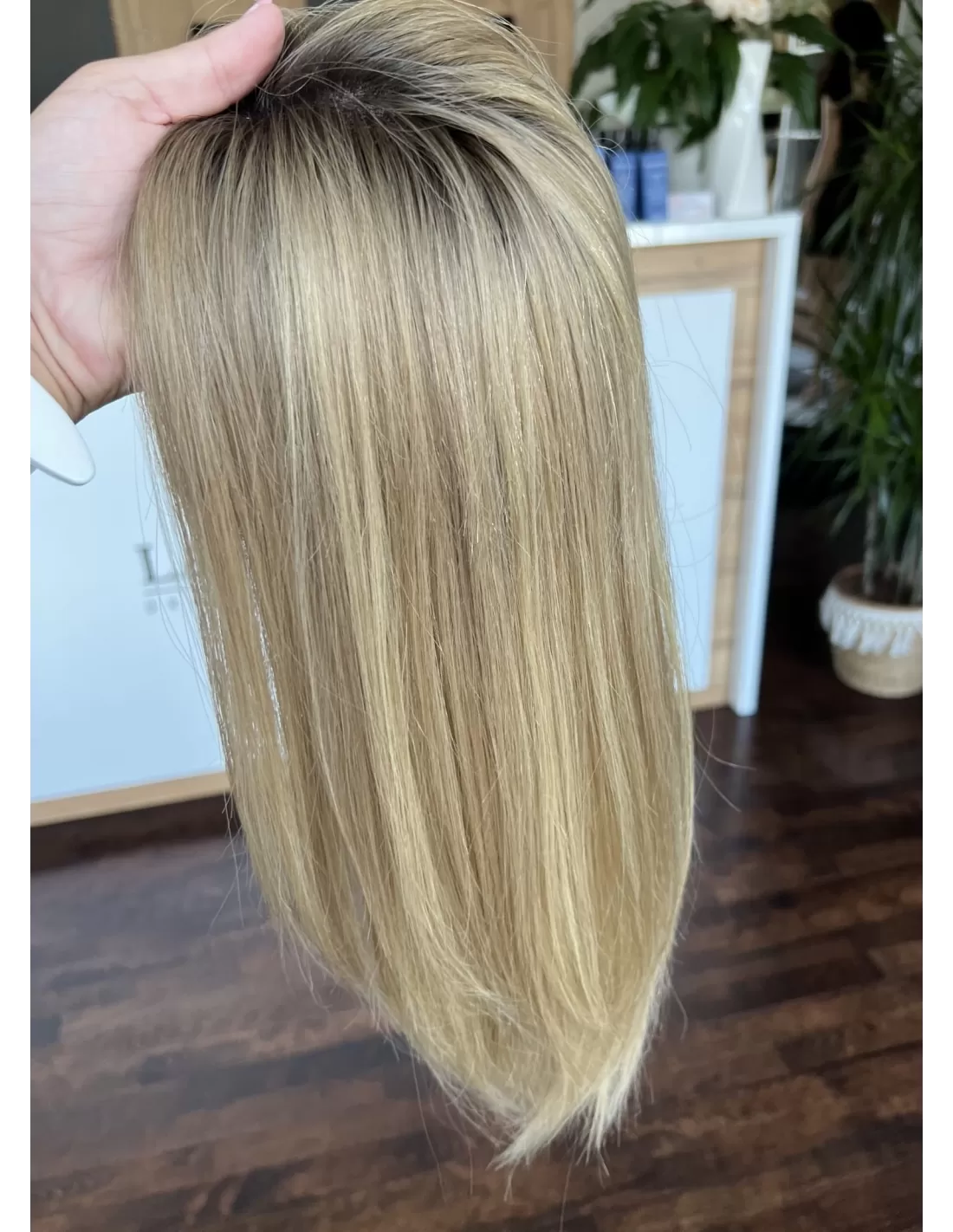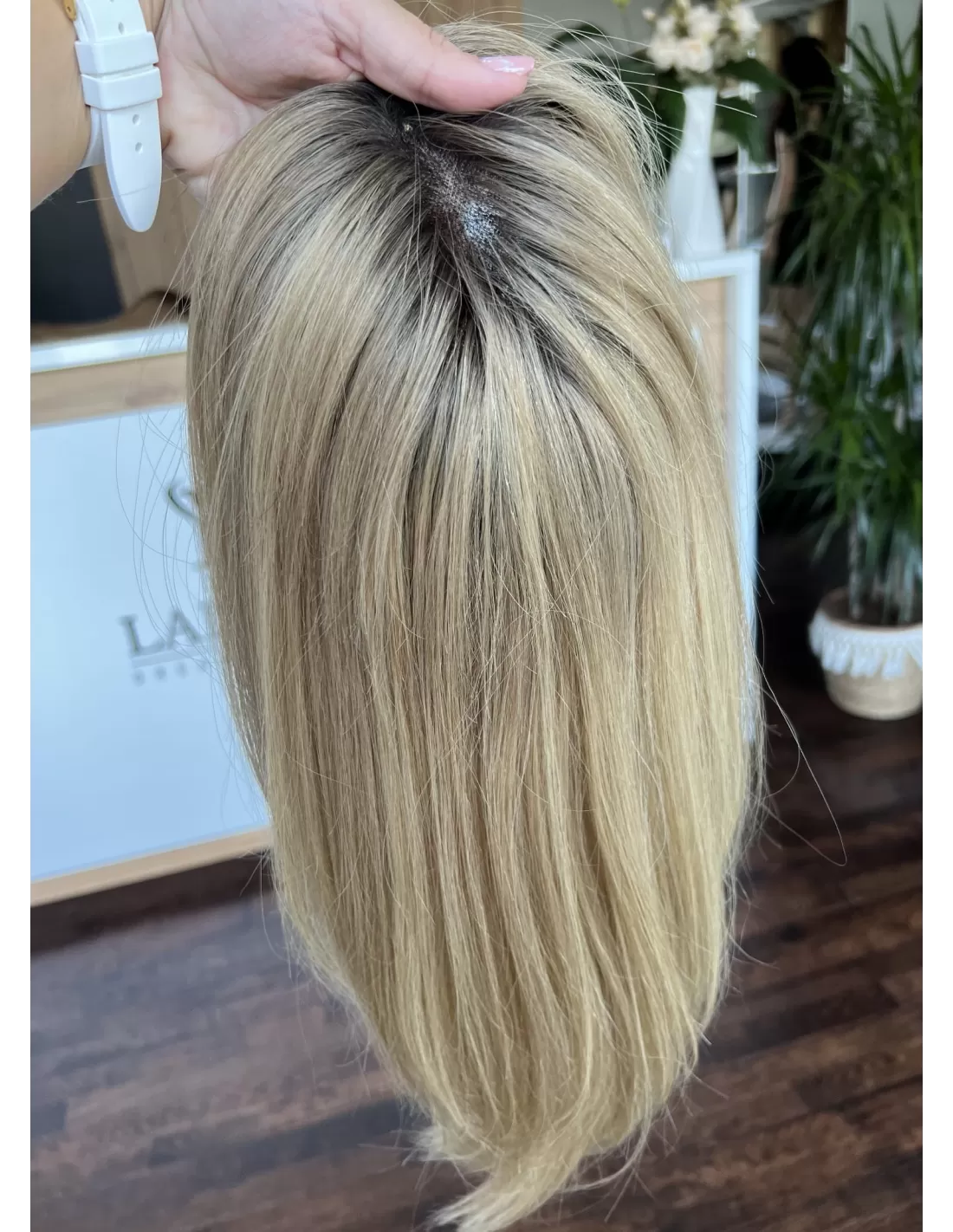 Topper Joni topper to harmonia odcieni beżowego ciepłego blondu z chłodnym odrostem w kolorze brązu na poziomie 8, co nadaje mu niezwykły blask i elegancję. Delikatne przejście między tymi kolorami zapewnia naturalny i subtelny efekt. Dodatkowo, posiada mocowanie na pięć spineczek typu clip in, co sprawia, że jest niezwykle prosty w zakładaniu i zdejmowaniu, pozwalając na szybką zmianę fryzury.