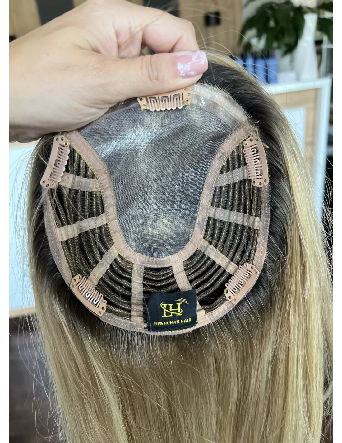 Konstrukcja bazująca na mono: Topper ten wyposażony jest w bazę mono, co oznacza, że włosy są ręcznie tkane do delikatnej siateczki, co zapewnia doskonałe naturalne wykończenie. Mono baza jest niezwykle delikatna dla skóry głowy i zapewnia efekt "scalp-like", co sprawia, że toper jest trudny do odróżnienia od własnych włosów.