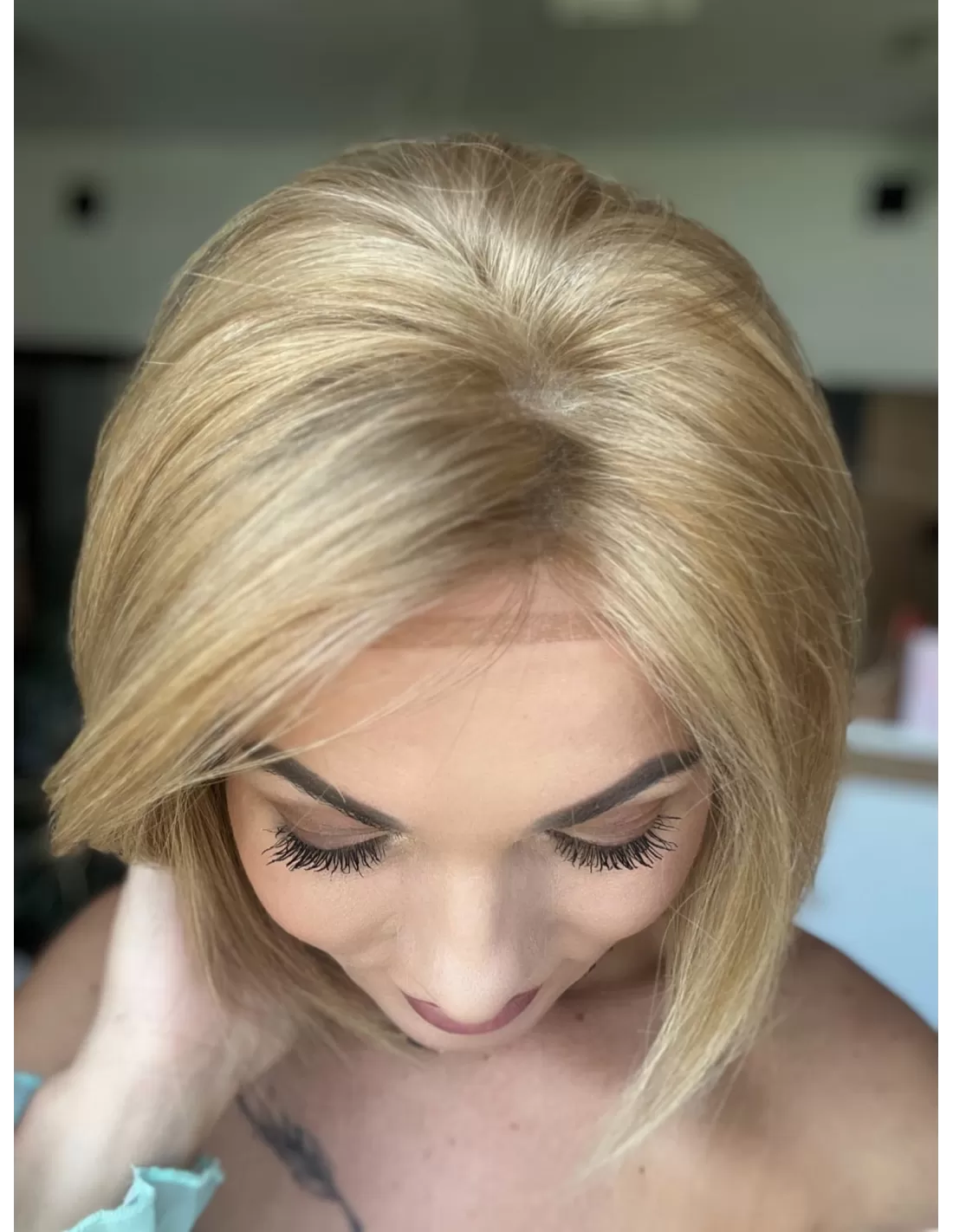 Linie brzegową widoczną na czole należy przyciąć do linii włosów w peruce.
