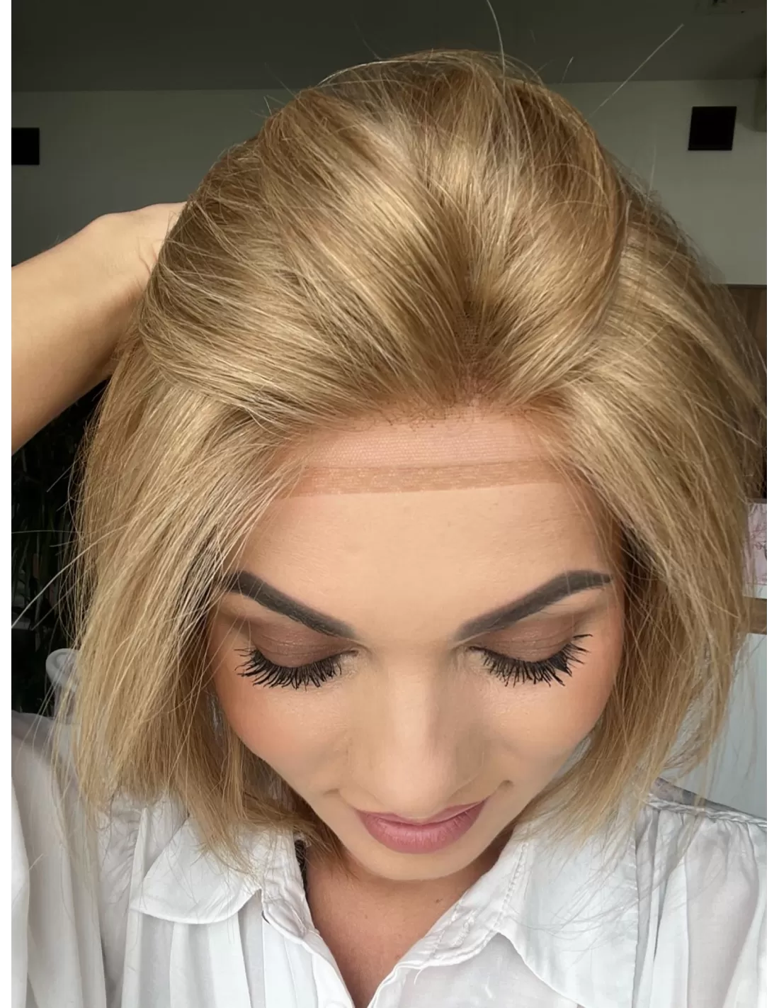 Linie brzegową widoczną na czole należy przyciąć do linii włosów w peruce.
