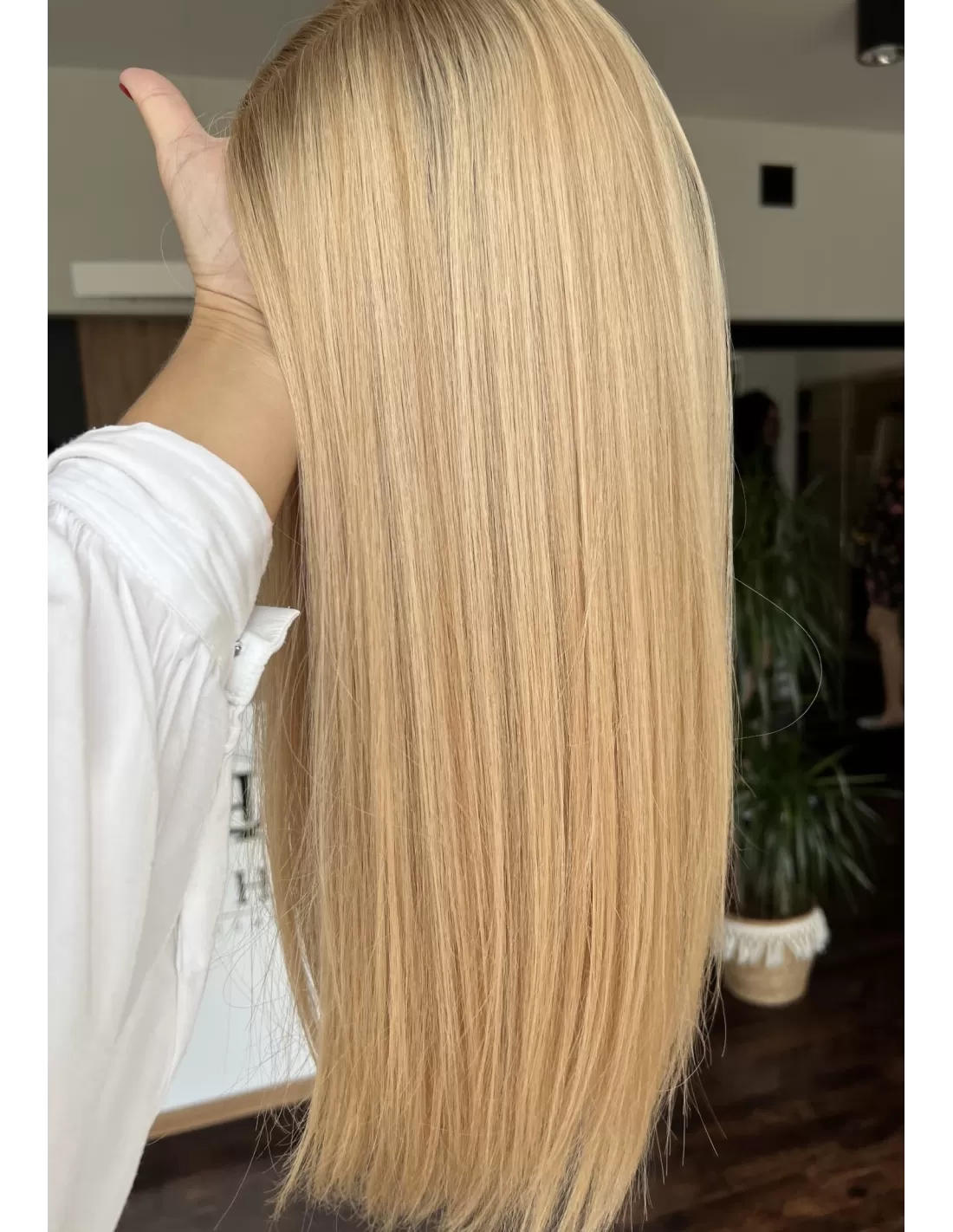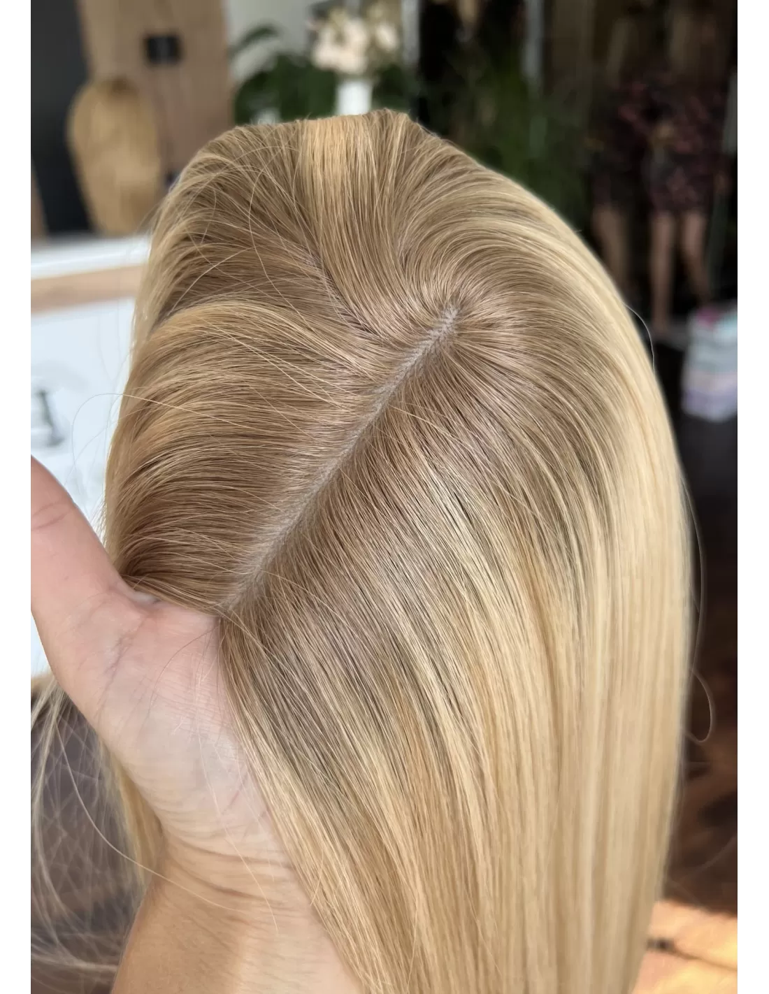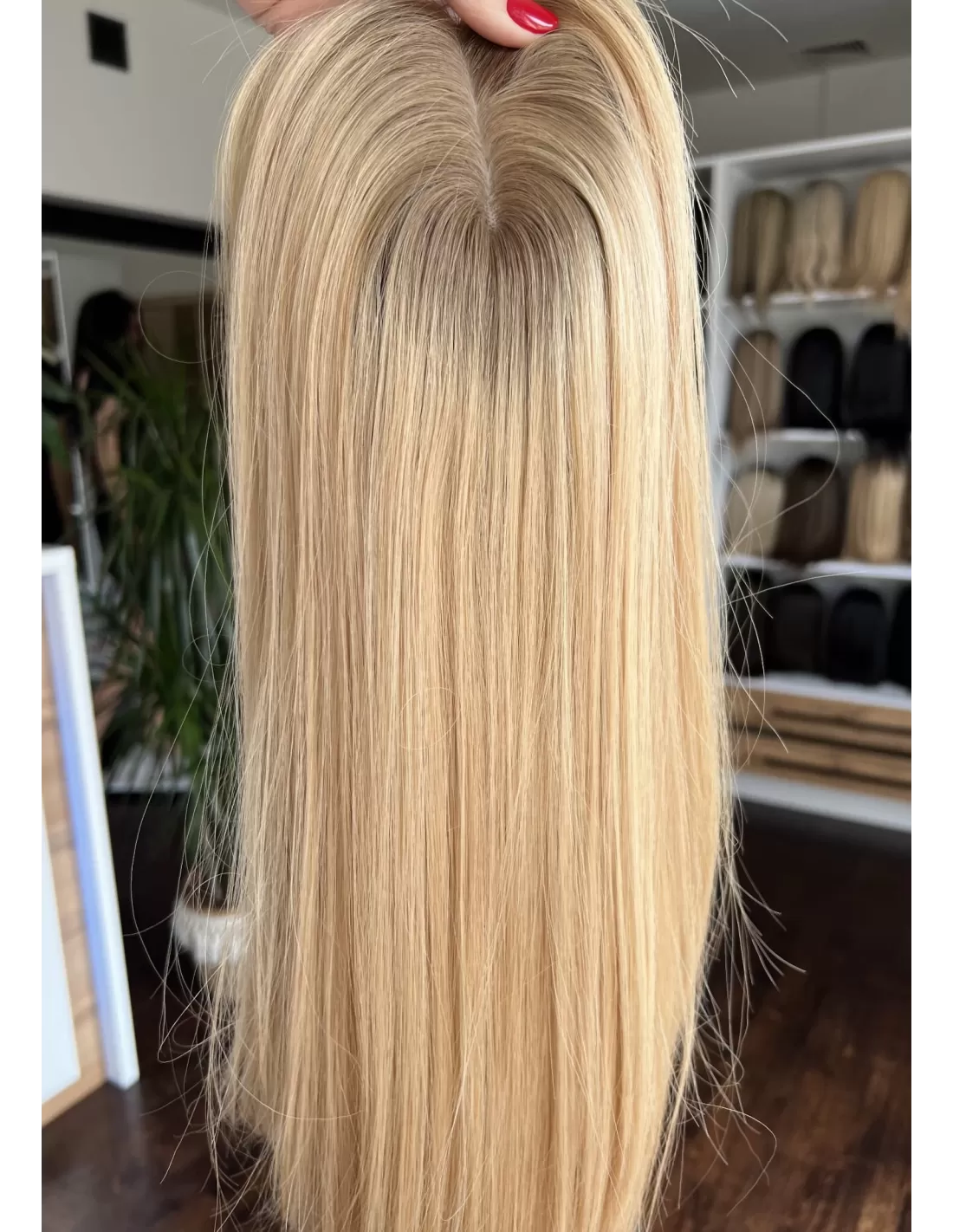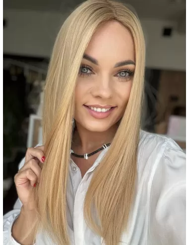 Poznaj Sheilę 45-50 cm – uosobienie elegancji, kobiecości i subtelnego blasku. Jej słoneczny blond rozświetla twarz, a delikatny odrost w odcieniu średniego blondu dodaje fryzurze głębi i naturalności. To topper, który doda Twojemu wizerunkowi pewności siebie i klasy, zachwycając lekkością oraz doskonałym wykończeniem.