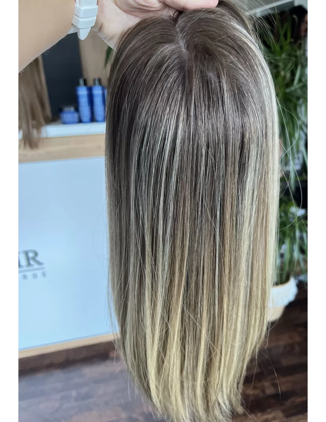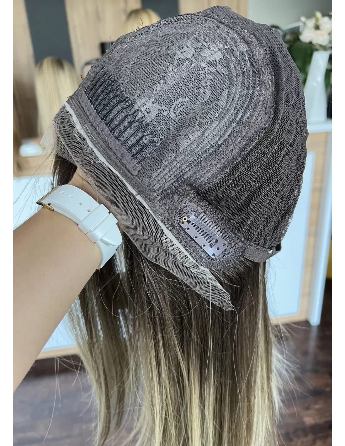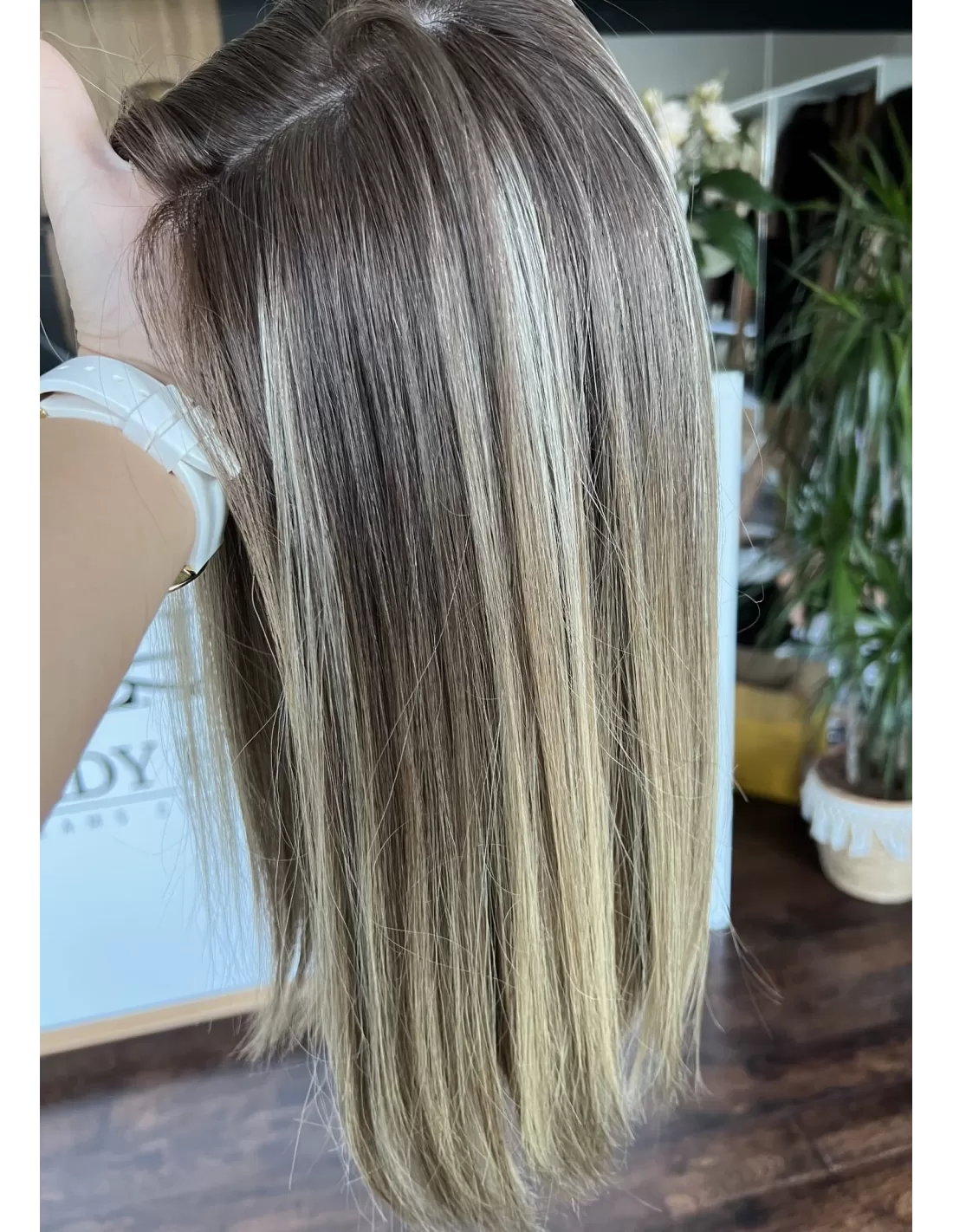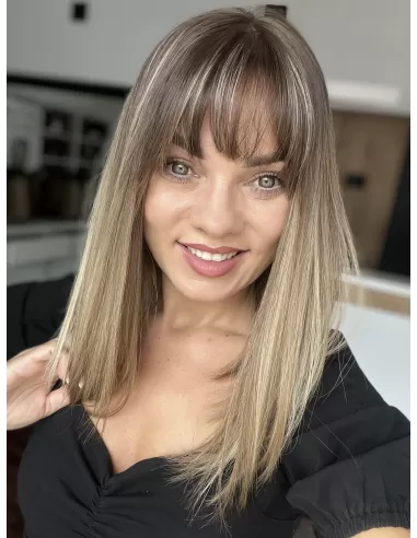 U podstawy peruki znajdują się naturalny odcień brązu, który dodaje głębi i elegancji. W miarę przesuwania się w dół, kolor przechodzi w ciepły odcień blondu, tworząc efektowne ombre, które subtelnie łączy te dwa odcienie w harmonijną całość.