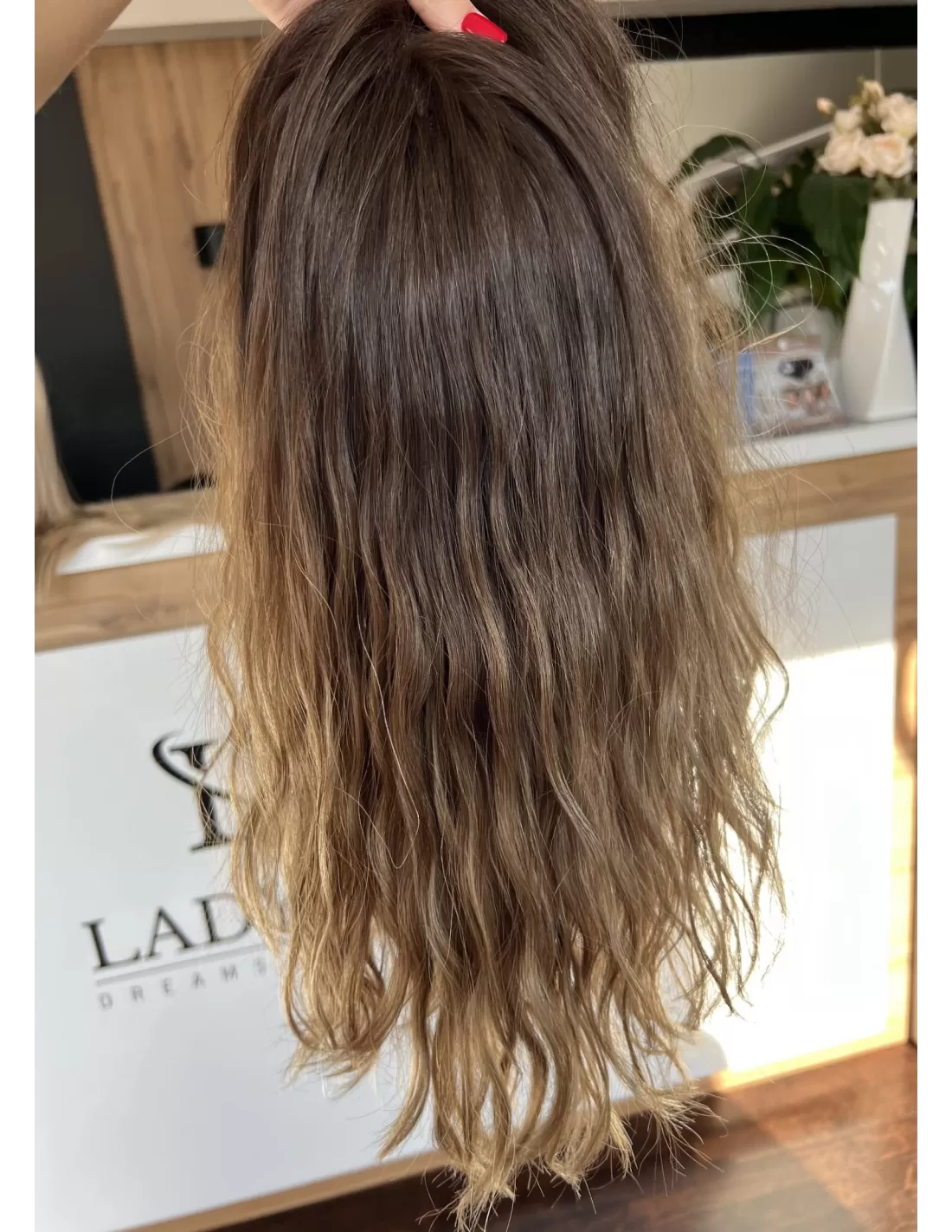 U nasady peruki znajduje się odrost w kolorze naturalnego brązu w chłodnym odcieniu , który dodaje kontrastu i głębi. Ten odcień stopniowo przechodzi w stonowany ciepły blond po długości, tworząc wyjątkowe przejście kolorów (ombre). Ostateczny efekt to harmonijne zestawienie naturalnego brązu i delikatnego ciepłego blondu po długości, co nadaje peruce wyjątkowego uroku.