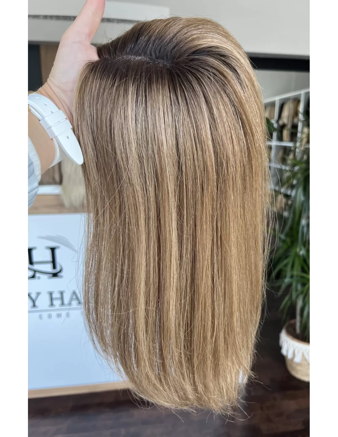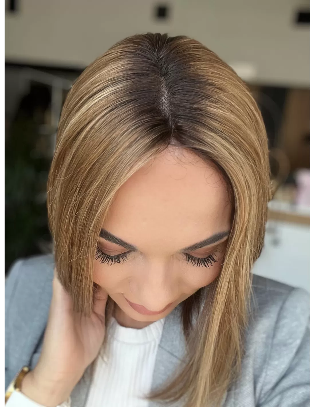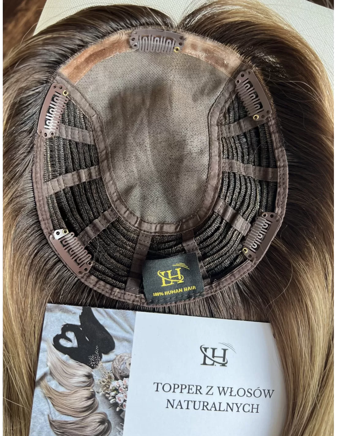 Konstrukcja bazująca na mono: Topper ten wyposażony jest w bazę mono, co oznacza, że włosy są ręcznie tkane do delikatnej siateczki, co zapewnia doskonałe naturalne wykończenie. Mono baza jest niezwykle delikatna dla skóry głowy i zapewnia efekt "scalp-like", co sprawia, że toper jest trudny do odróżnienia od własnych włosów.