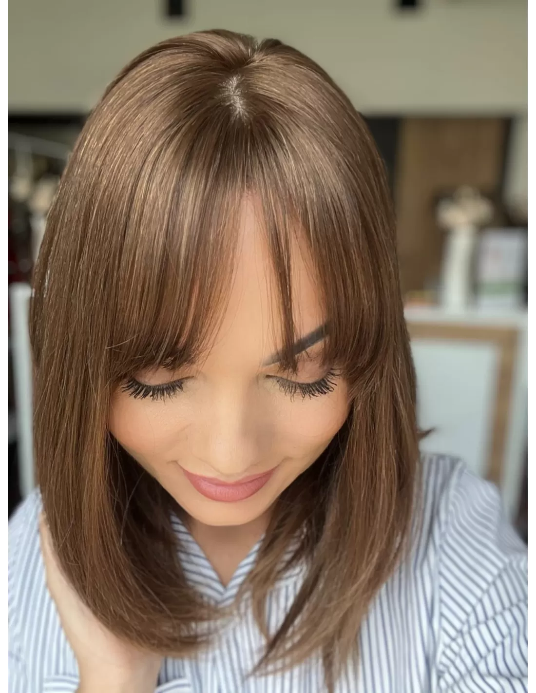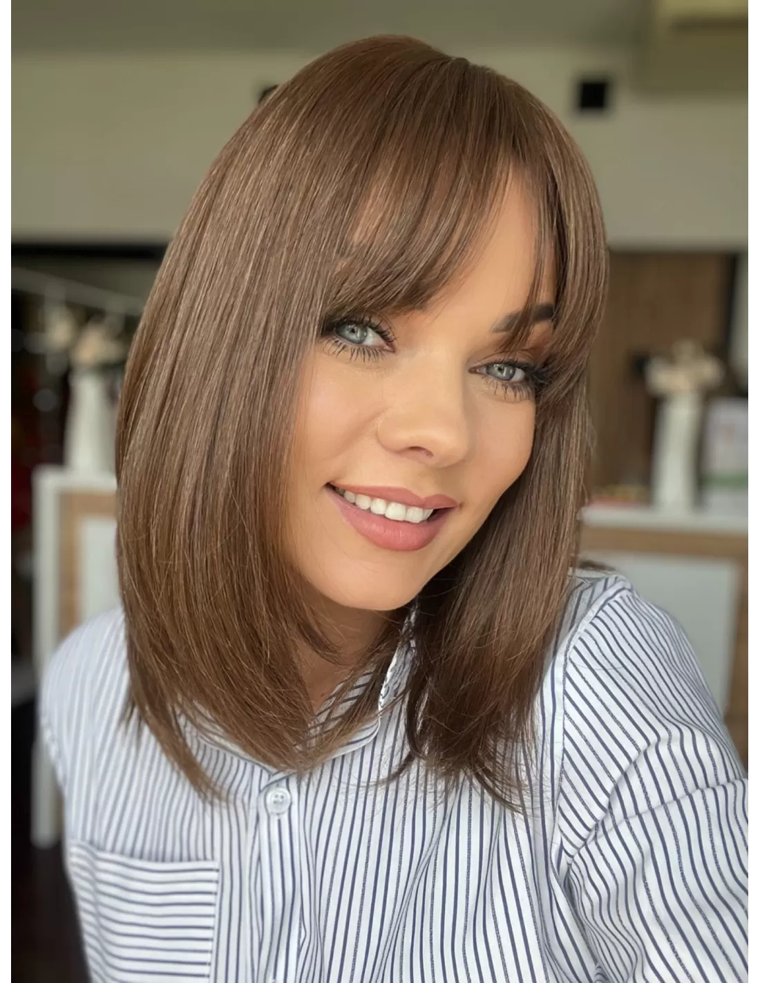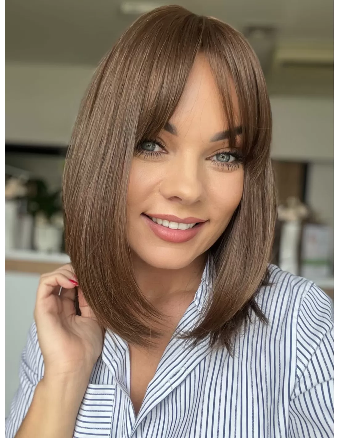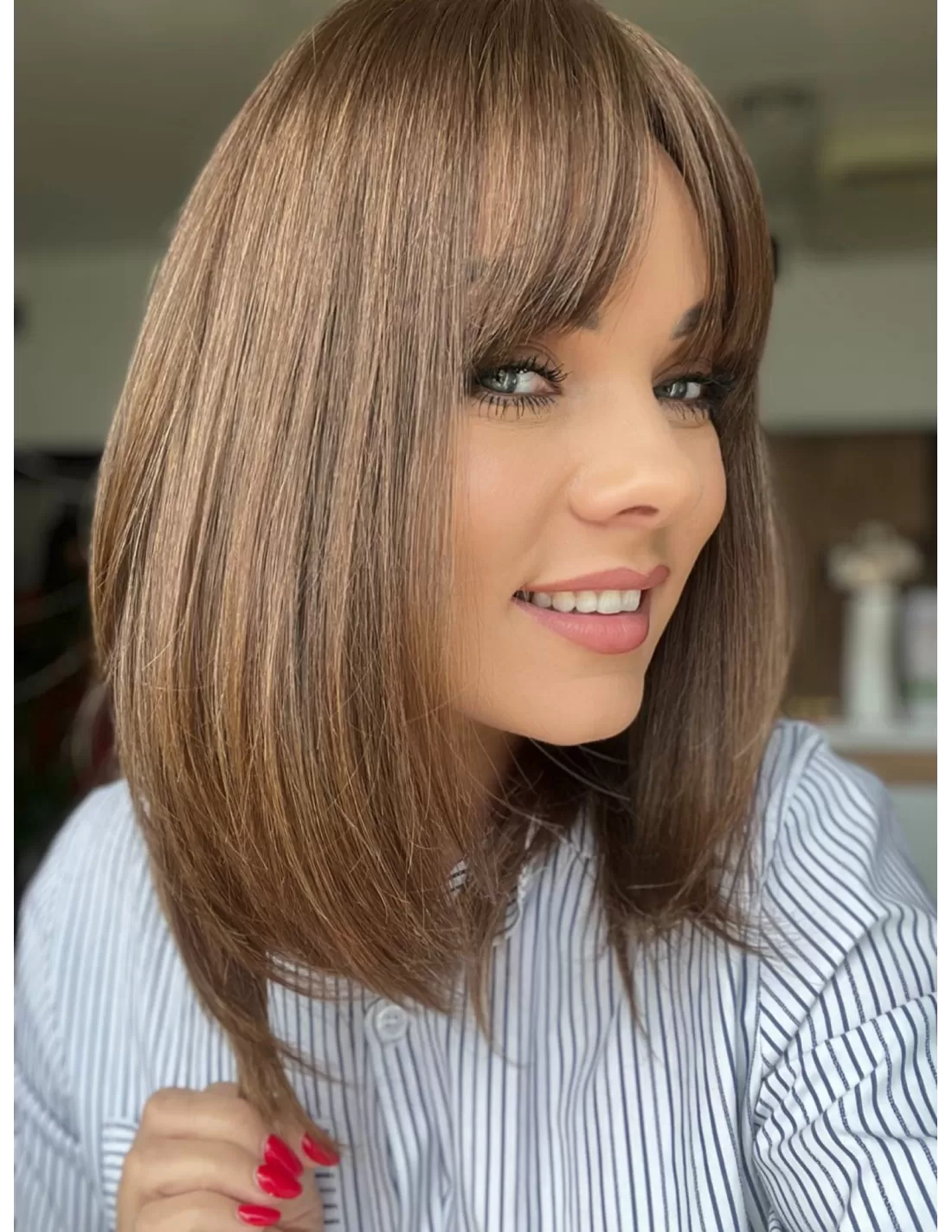 Oprócz doskonałej jakości włosów i naturalnego koloru, topper Alice posiada uroczą grzywkę, która nadaje mu jeszcze większy urok. Grzywka jest starannie przycinana i stylizowana, by idealnie pasowała do reszty fryzury. Dodaje ona subtelności i kobiecego uroku, co sprawia, że cała fryzura wygląda wyjątkowo atrakcyjnie.Dzięki obecności grzywki, masz możliwość różnorodnych stylizacji, w tym układania jej na bok. To doskonały dodatek, który podkreśla naturalność tej fryzury i daje ci większą swobodę w eksperymentowaniu z własnym stylem.
