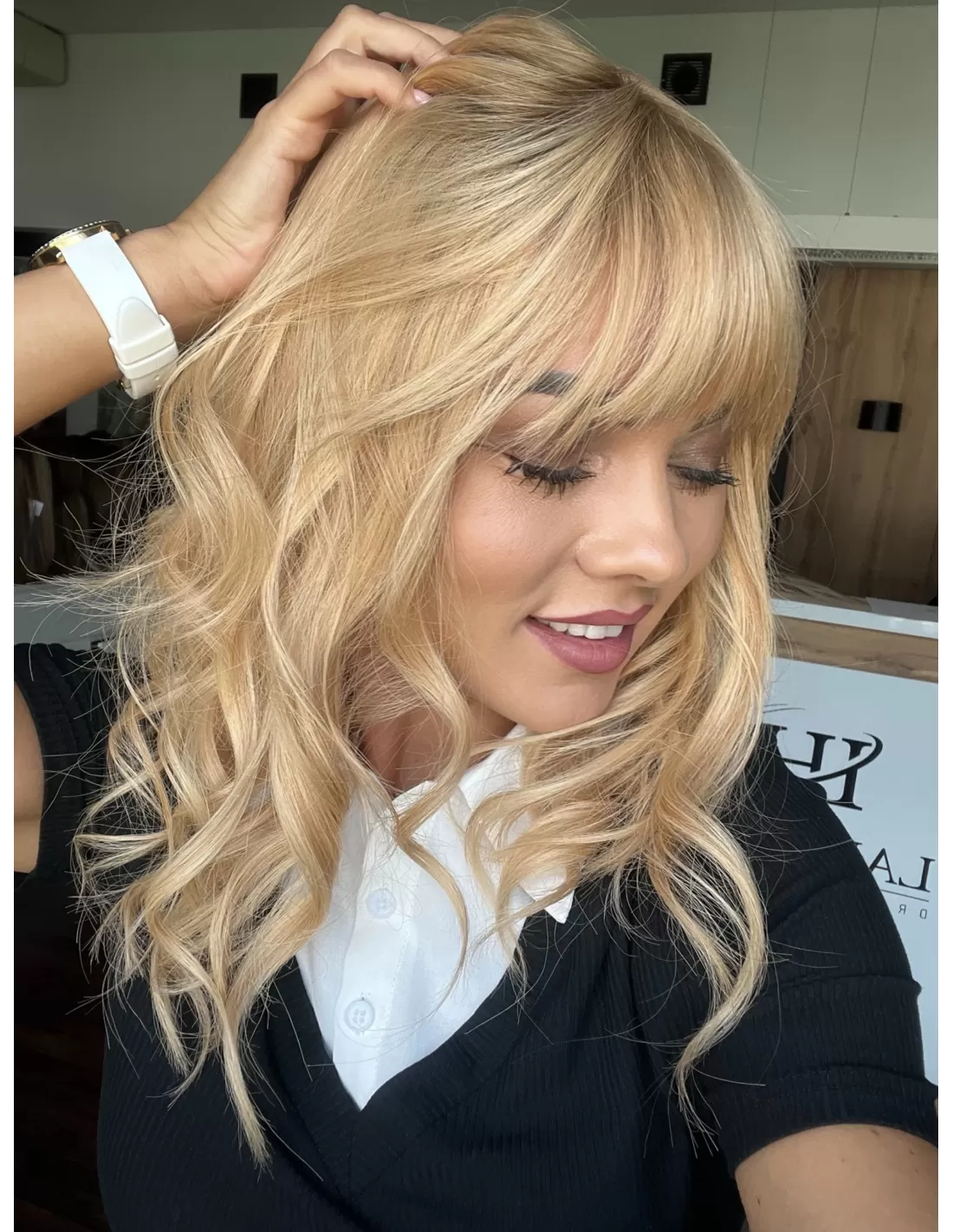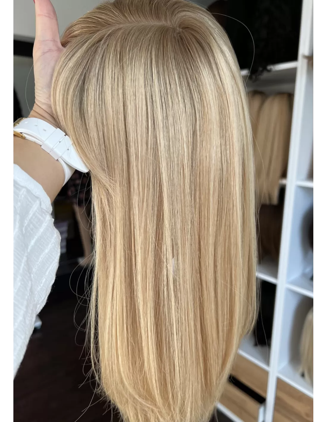Poznaj Sheilę – absolutną definicję elegancji i subtelności. Jej lśniące włosy w odcieniach słonecznego blondu promieniują ciepłem i świeżością, a delikatny kontrast odrostu w kolorze średniego blondu nadaje fryzurze niepowtarzalny charakter. To topper, który doda blasku i pewności siebie, sprawiając, że każdy dzień stanie się wyjątkowy.