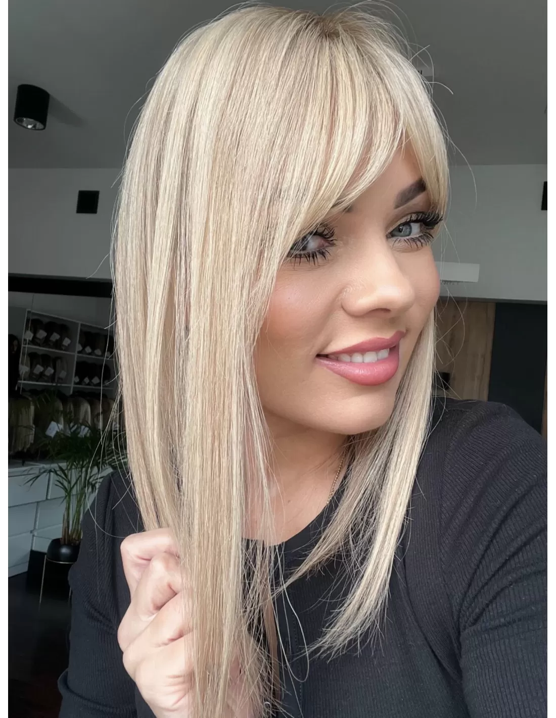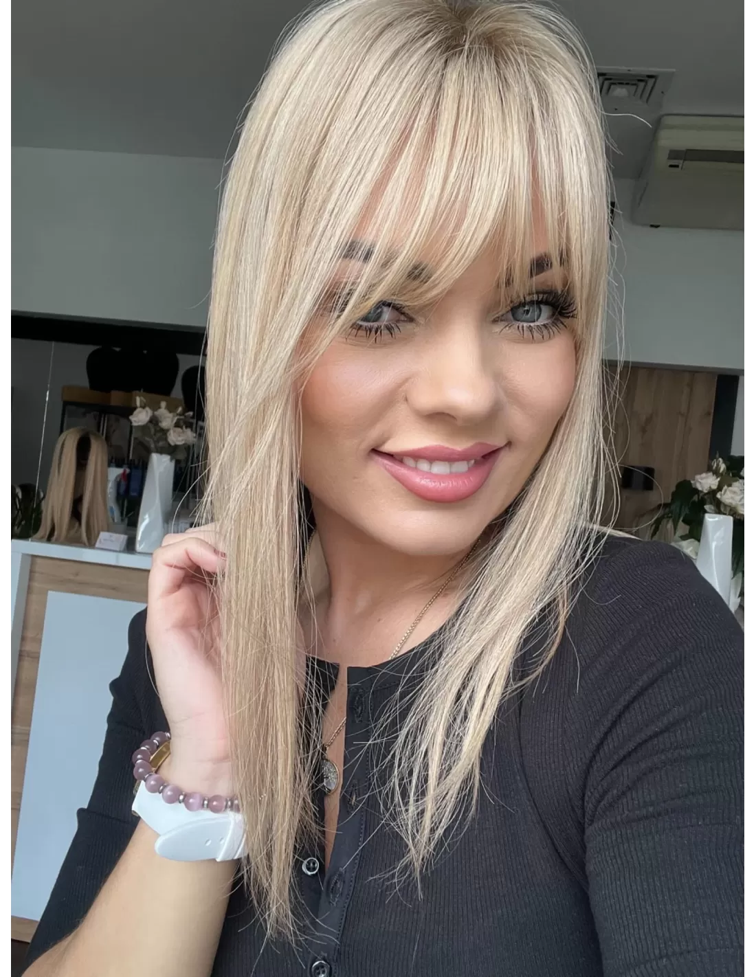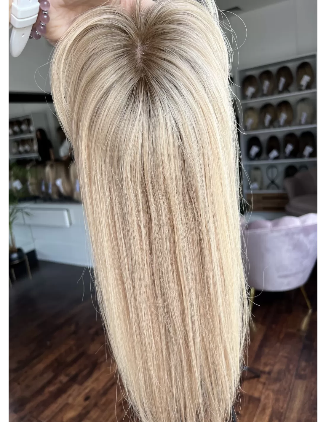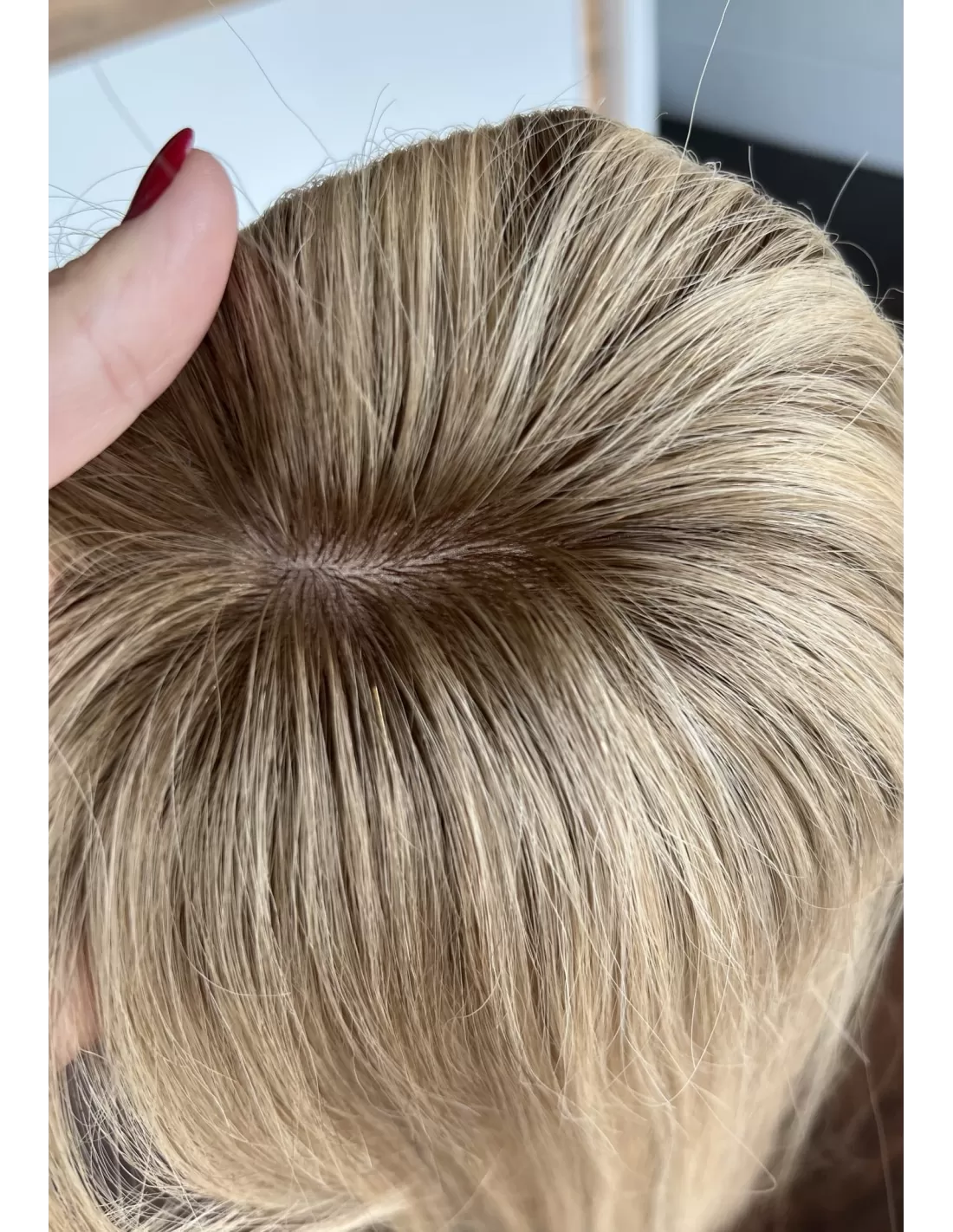 Przedstawiamy mini topper, idealne rozwiązanie dla osób pragnących subtelnie zagęścić przedziałek. Wykonany z naturalnych włosów w odcieniu beżowego blondu z subtelnym odrostem w kolorze ciemnego blondu co dodaje mu naturalnego i eleganckiego charakteru
