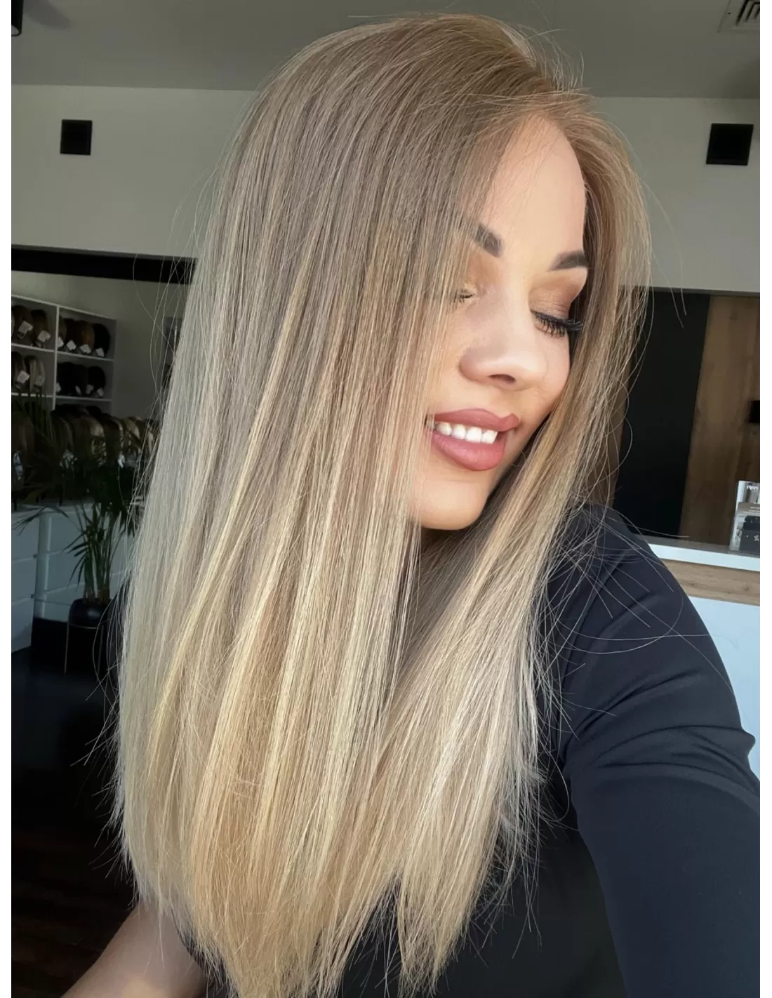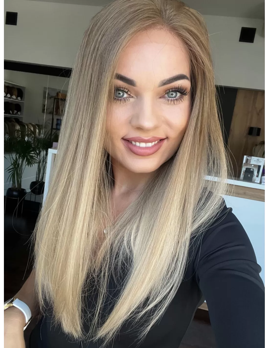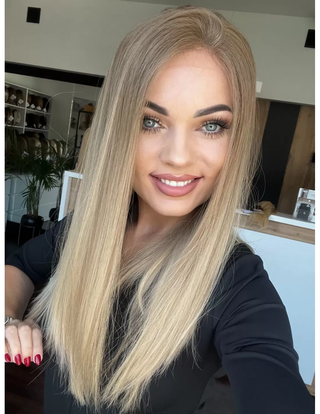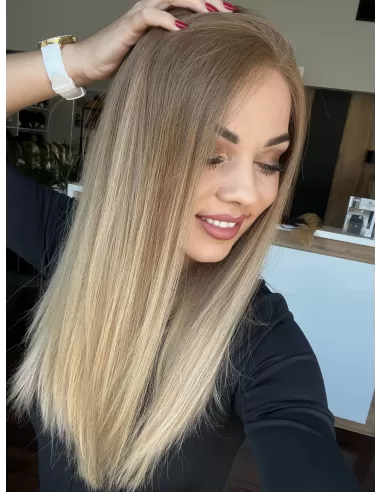 Najważniejszym atutem peruki Beti jest jej kolor. To delikatne ombre, które prezentuje się wyjątkowo subtelnie i stylowo. U nasady peruki znajduje się średni blond w chłodnym odcieniu, który stopniowo przechodzi w ciepłe tony blondu po długości. Te stonowane kolory doskonale komponują się ze sobą, nadając peruce wyjątkowego uroku.