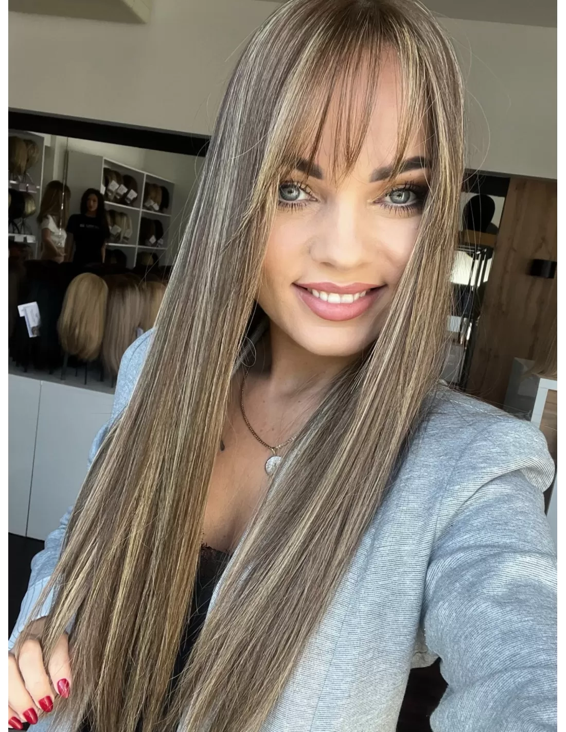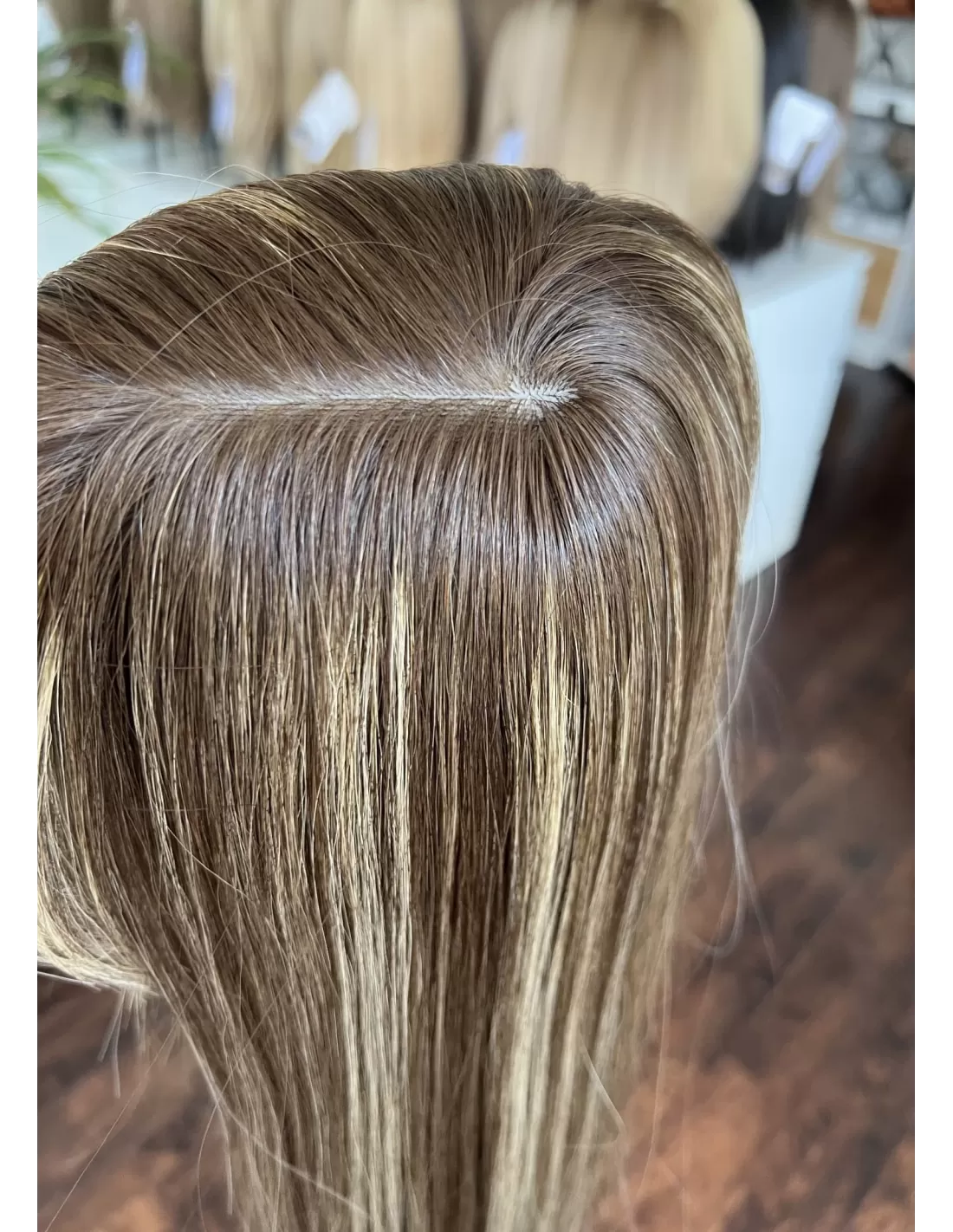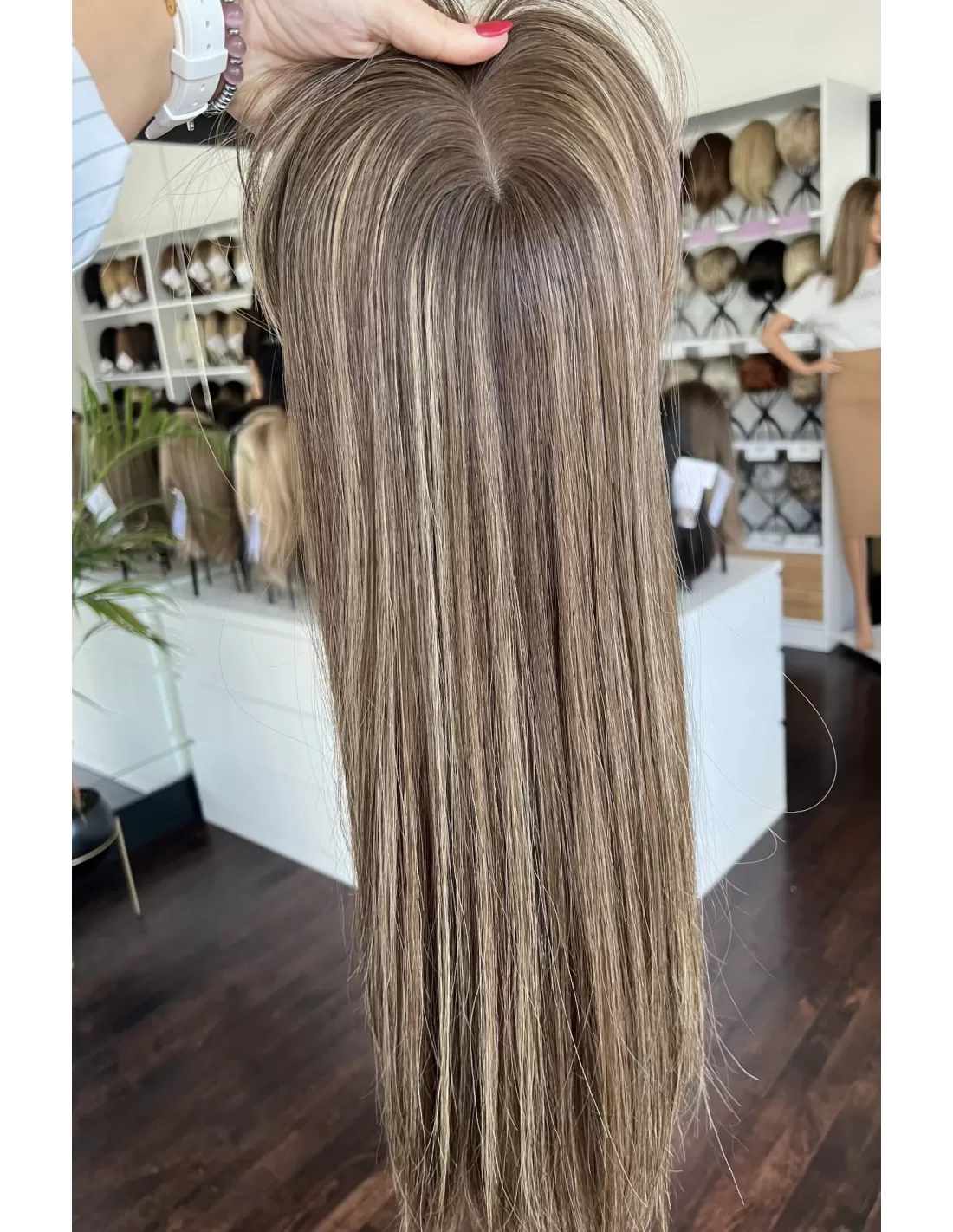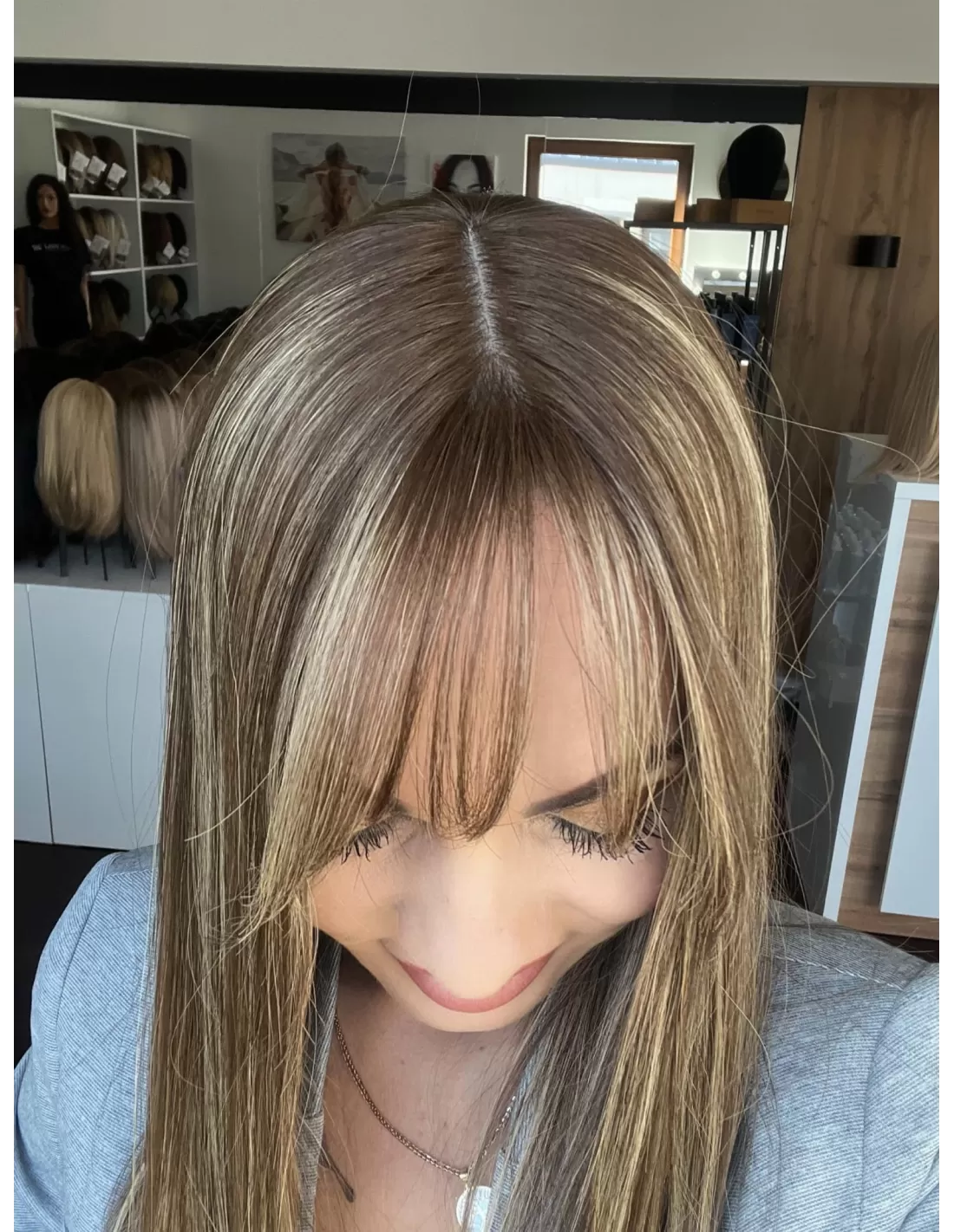 -Przedstawiamy wyjątkowy topper, który nie tylko podkreśli Twoją urodę, ale także dostarczy niezapomnianych doświadczeń stylizacyjnych. Wykonany został z najwyższej jakości włosów naturalnych europejskich. Topper Lola w kolorze baleyage blond z odrostem w chłodnym odcieniu średniego brązu to prawdziwa perełka w świecie fryzur.