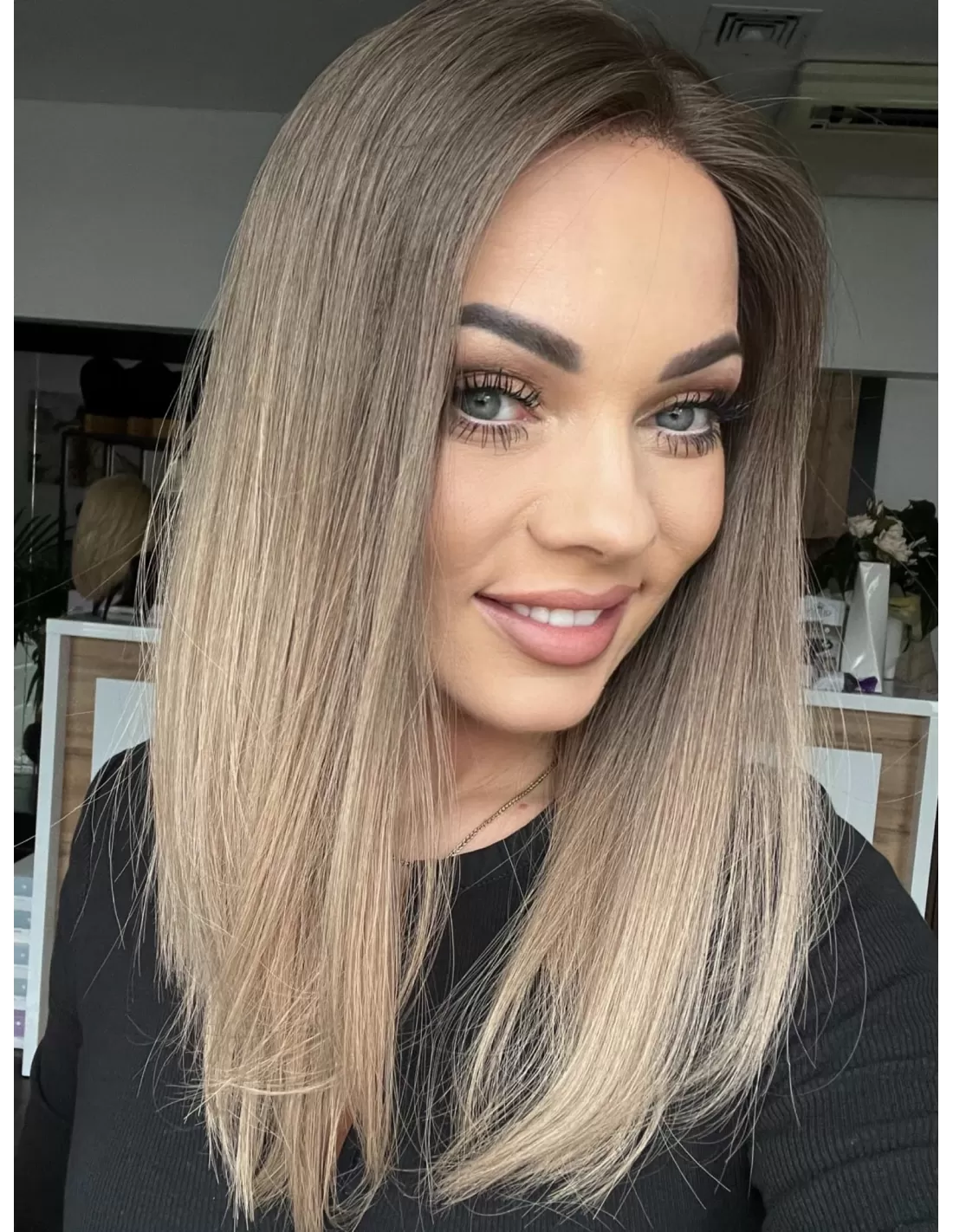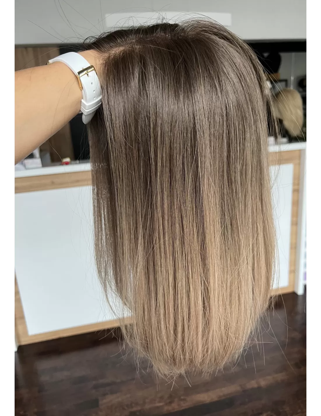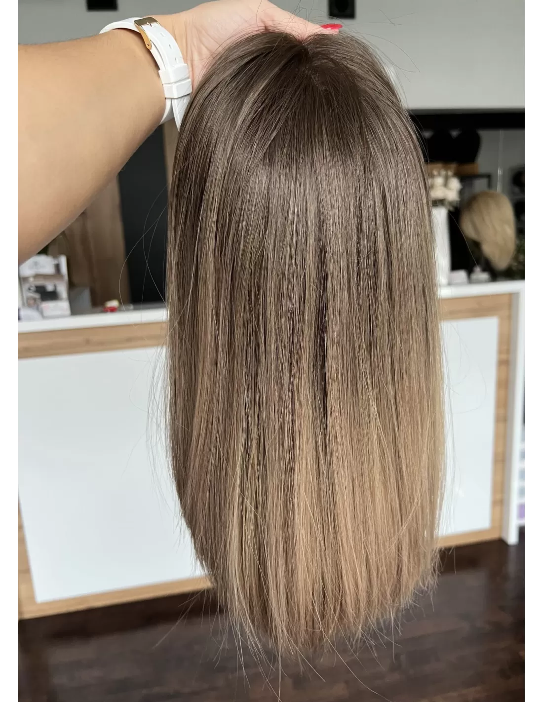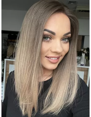 U nasady peruki znajduje się odrost w kolorze naturalnego średniego brązu w chłodnym odcieniu , który dodaje kontrastu i głębi. Odcień ten stopniowo przechodzi w stonowany blond po długości, tworząc wyjątkowe przejście kolorów (ombre). Ostateczny efekt to harmonijne zestawienie naturalnego brązu i delikatnego blondu po długości, co nadaje peruce wyjątkowego uroku.