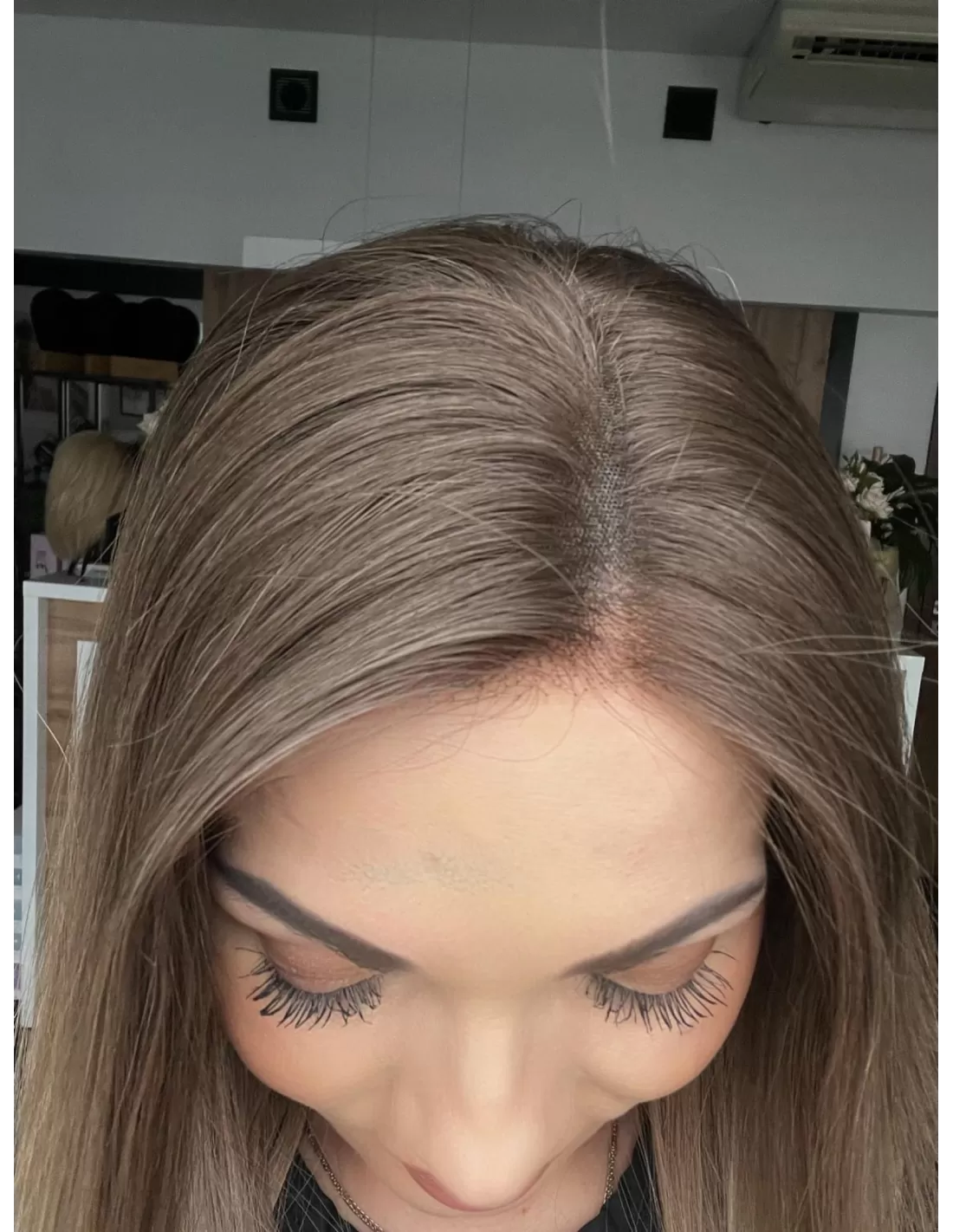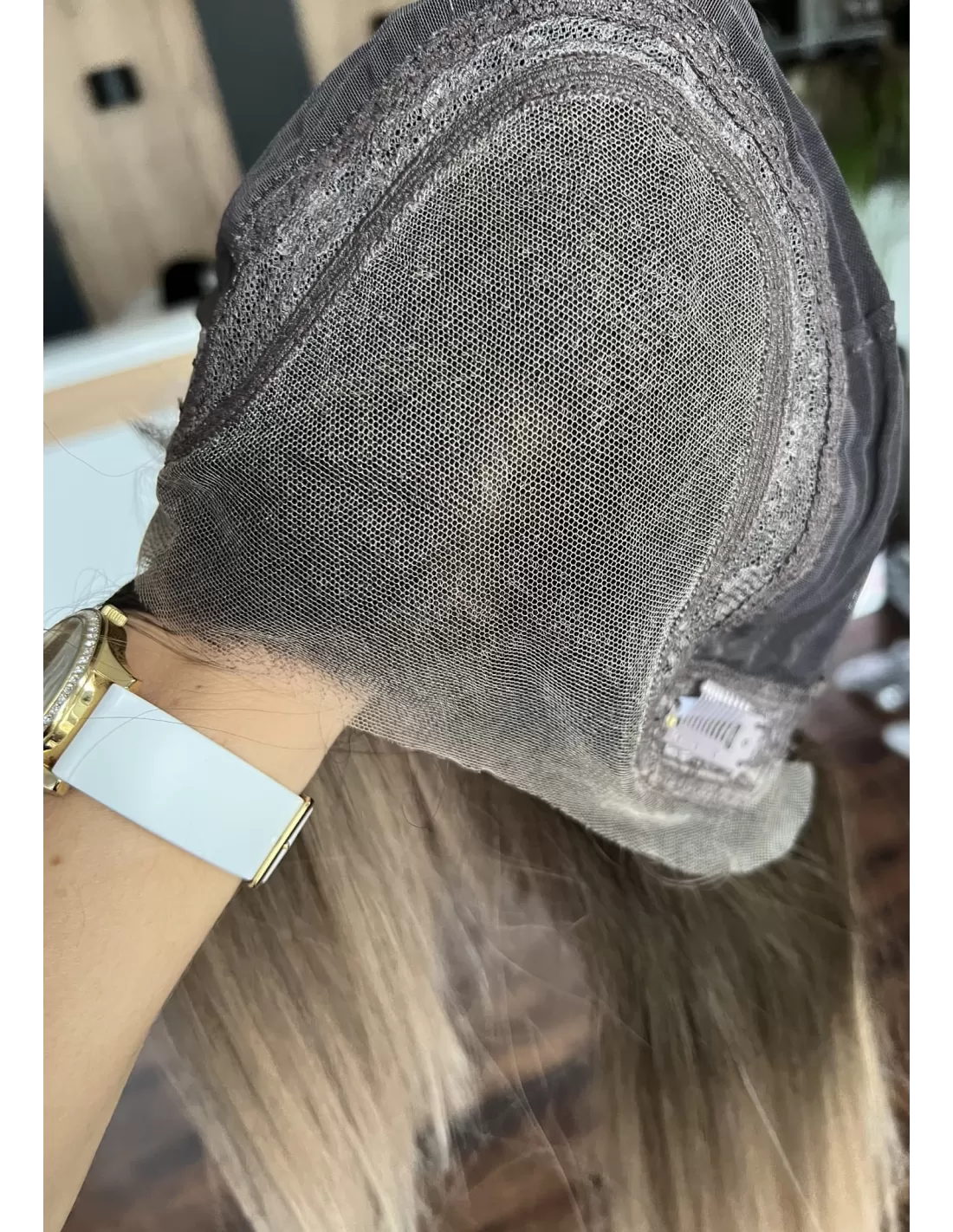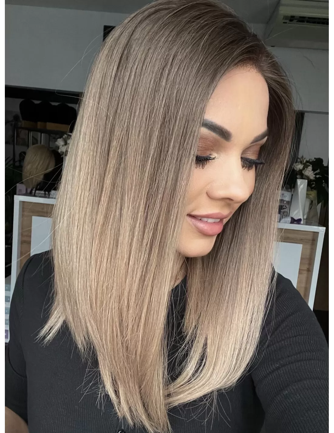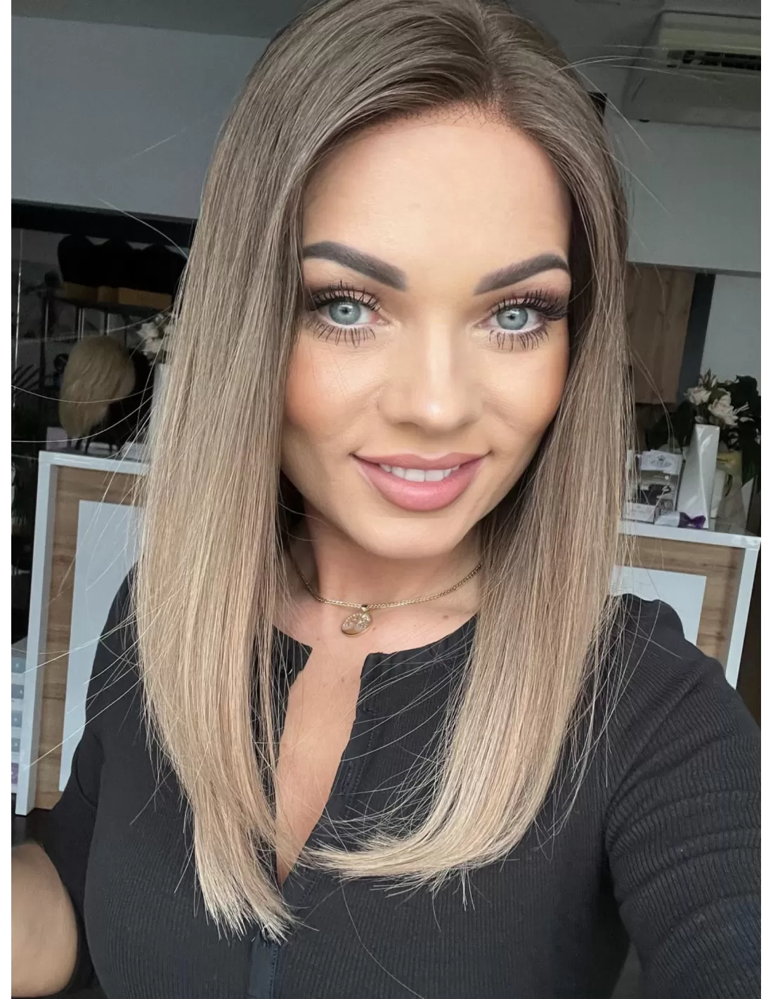 U nasady peruki znajduje się odrost w kolorze naturalnego średniego brązu w chłodnym odcieniu , który dodaje kontrastu i głębi. Odcień ten stopniowo przechodzi w stonowany blond po długości, tworząc wyjątkowe przejście kolorów (ombre). Ostateczny efekt to harmonijne zestawienie naturalnego brązu i delikatnego blondu po długości, co nadaje peruce wyjątkowego uroku.