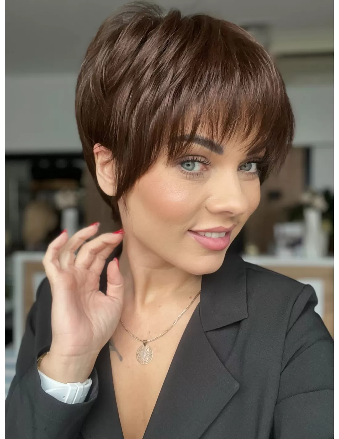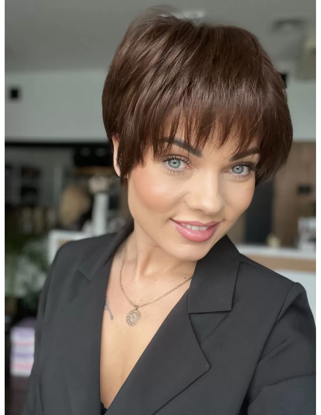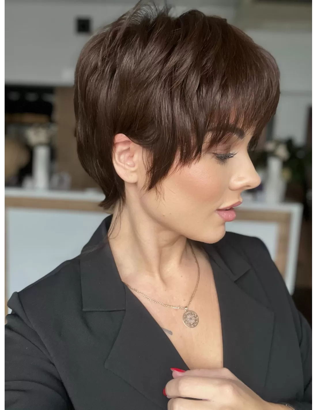 Elastyczny tył zapewnia idealne dopasowanie, a regulacje umożliwiają dostosowanie do indywidualnych preferencji. Kolor czarny nadaje peruce wyrafinowanego charakteru, podkreślając jej elegancję., idealna dla pań ceniących wygodę i krótkie fryzury. Peruka Mona to doskonały wybór dla tych Pań , które pragną zachować styl i elegancję w prosty sposób.