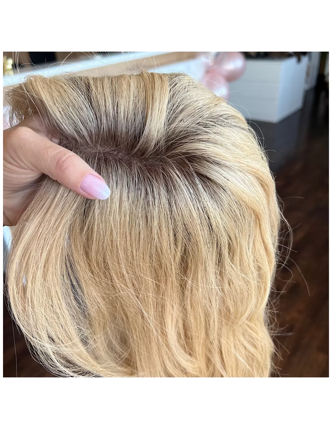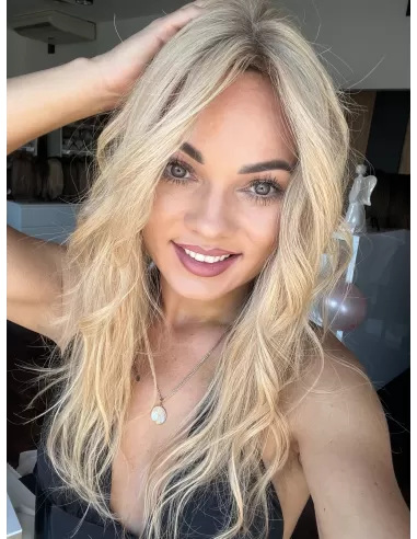 Topper Selene K14 to arcydzieło najwyższej jakości, stworzone z naturalnych włosów, które wprowadzą do Twojej stylizacji nowy wymiar elegancji. Kolorystyka to jasny ciepły odcień blondu z delikatnym odrostem, co nadaje włosom delikatny i naturalny blask.
