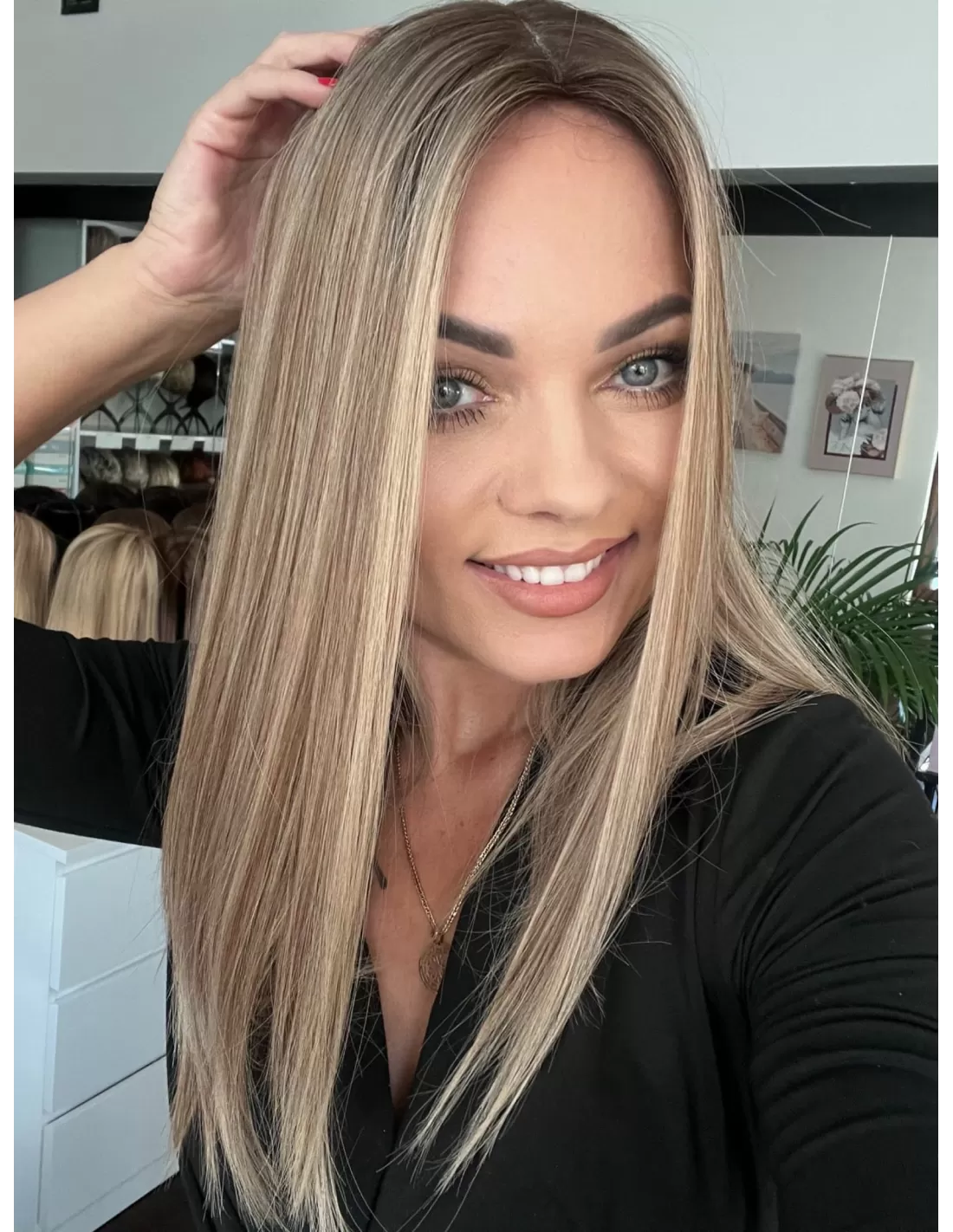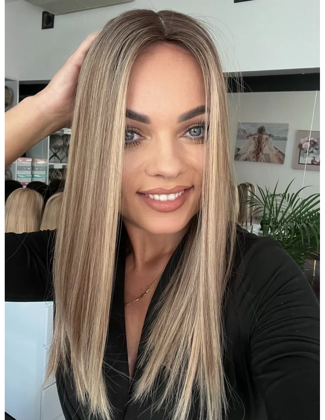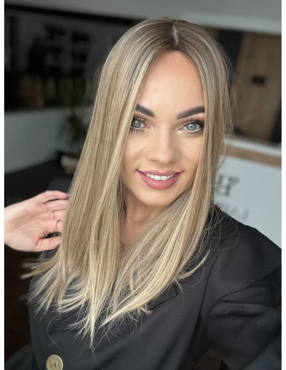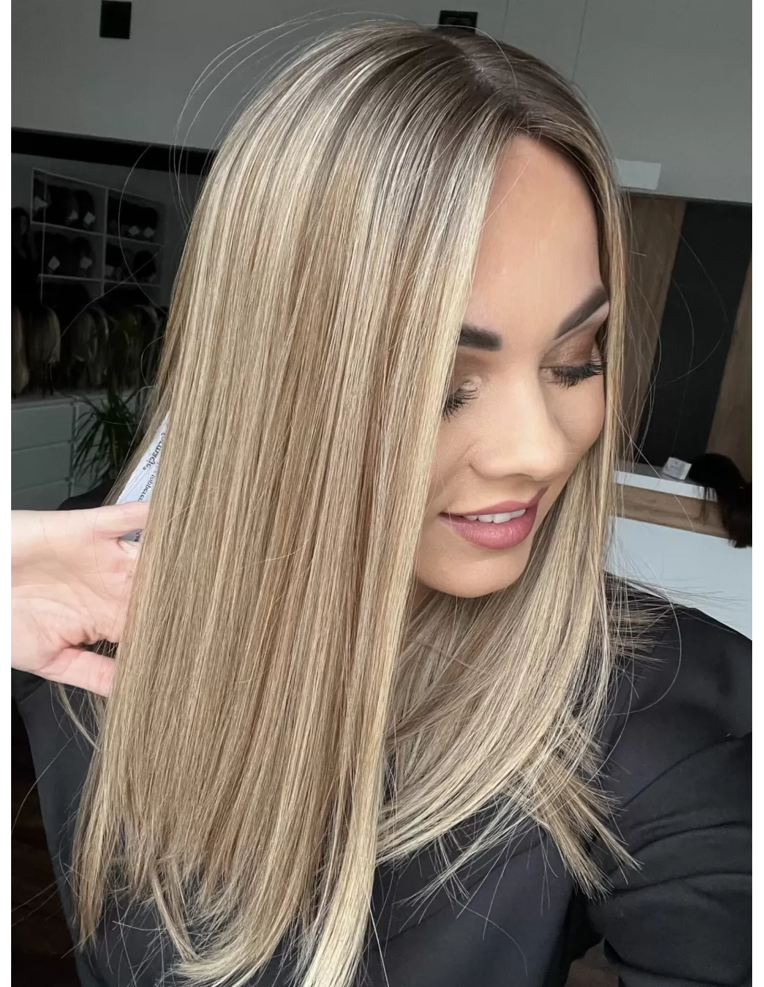 Odrost w chłodnym odcieniu brązu, świetnie kontrastuje z różnymi odcieniami blondu. dzięki czemu nie tylko dodaje całości elegancji, ale również sprawia, że cała fryzura wygląda naturalnie. Efekt końcowy to harmonijna kompozycja, która podkreśla urodę i dodaje charakteru każdej stylizacji.