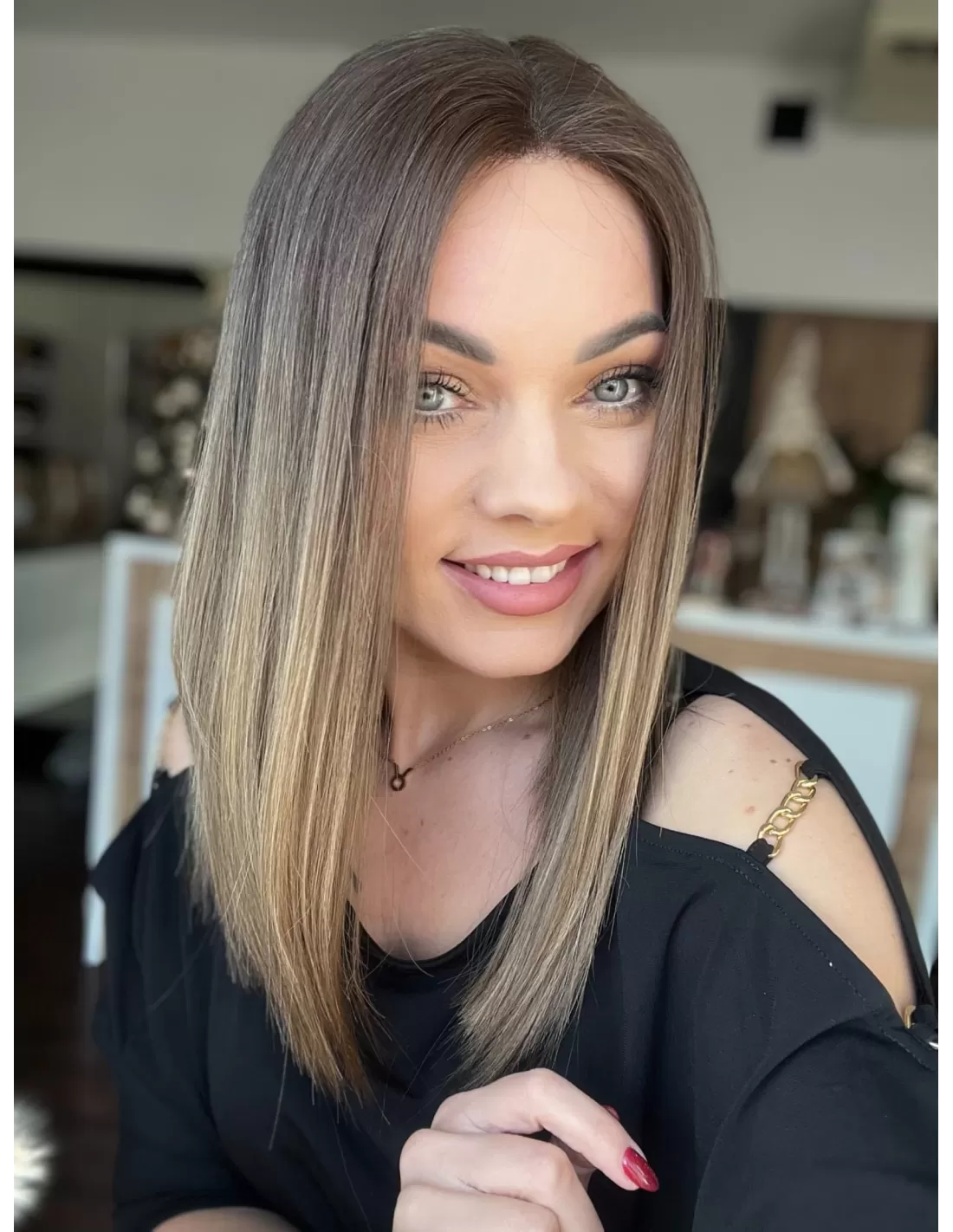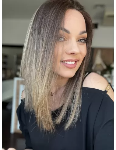 U nasady peruki znajduje się odrost w kolorze naturalnego (mysiego brązu) w chłodnym odcieniu , który dodaje kontrastu i głębi. Ten odcień stopniowo przechodzi w stonowany ciepły blond po długości, tworząc wyjątkowe przejście kolorów (ombre). Ostateczny efekt to harmonijne zestawienie naturalnego brązu i delikatnego ciepłego blondu po długości, co nadaje peruce wyjątkowego uroku.