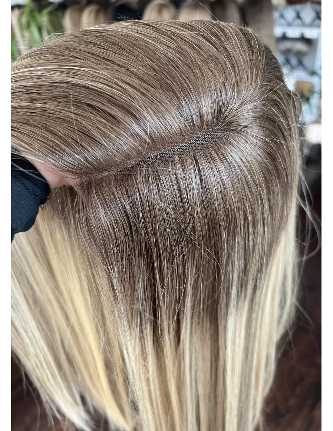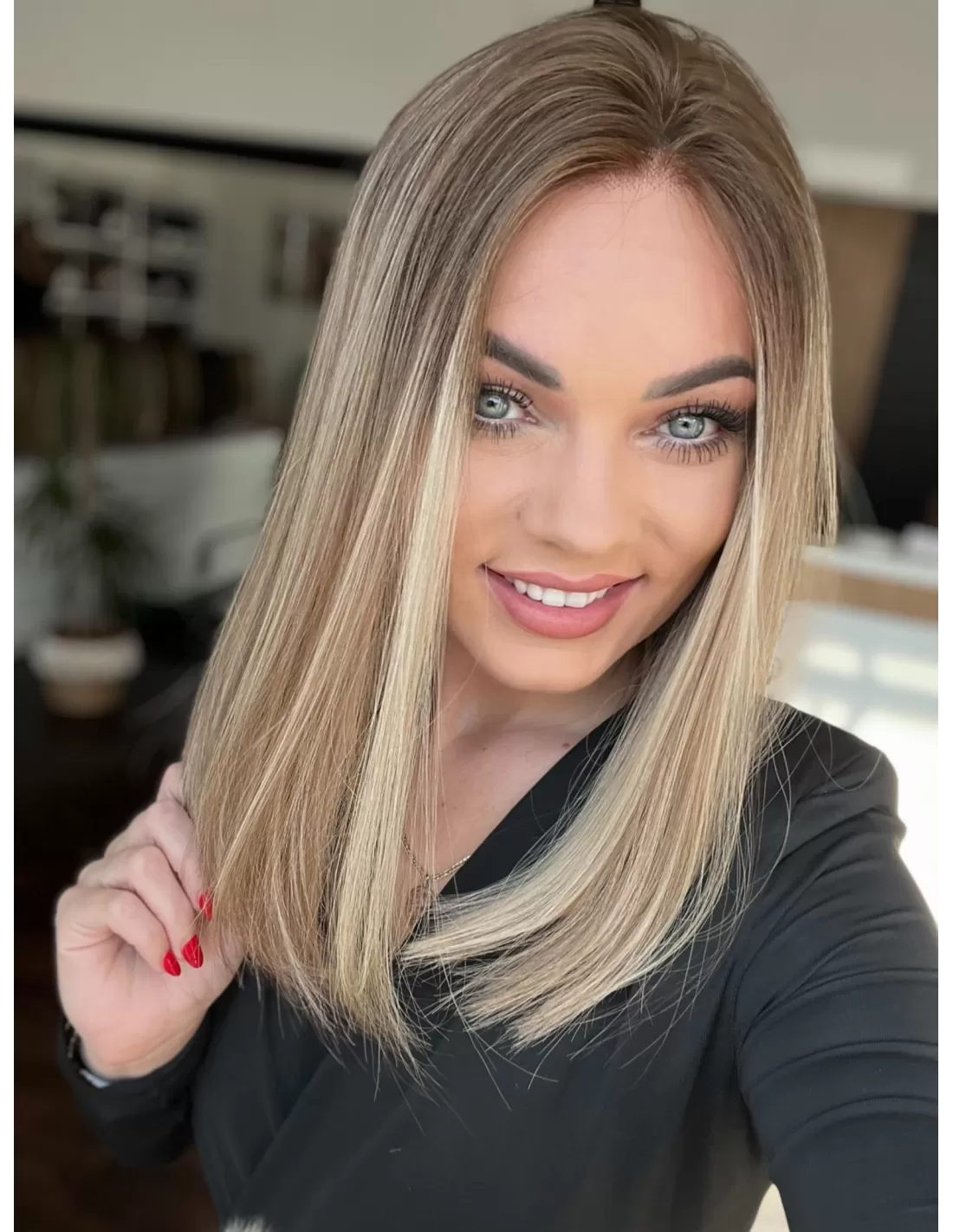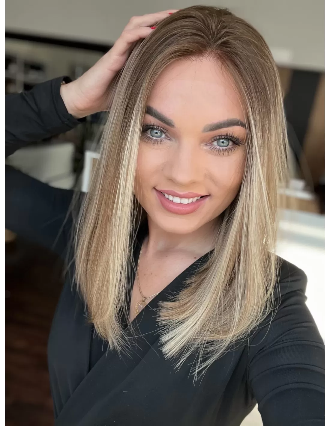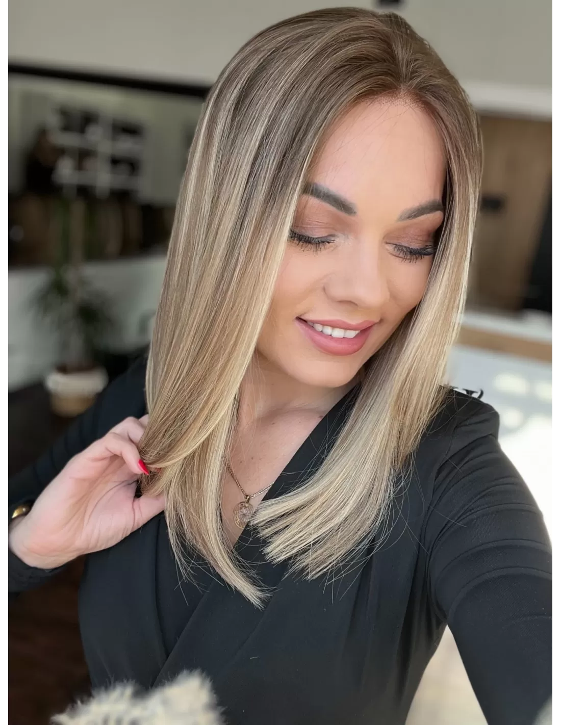 Ta wyjątkowa peruka z włosów naturalnych zachwyca perfekcyjnie dobranym balejażem w ciepłych odcieniach blondu. Mieszanka jasnych, złocistych i miodowych tonów tworzy efekt trójwymiarowej głębi, nadając fryzurze naturalny, pełen blasku wygląd. Delikatny odrost w odcieniu średniego brązu subtelnie podkreśla naturalność koloru, dodając mu autentycznego charakteru.