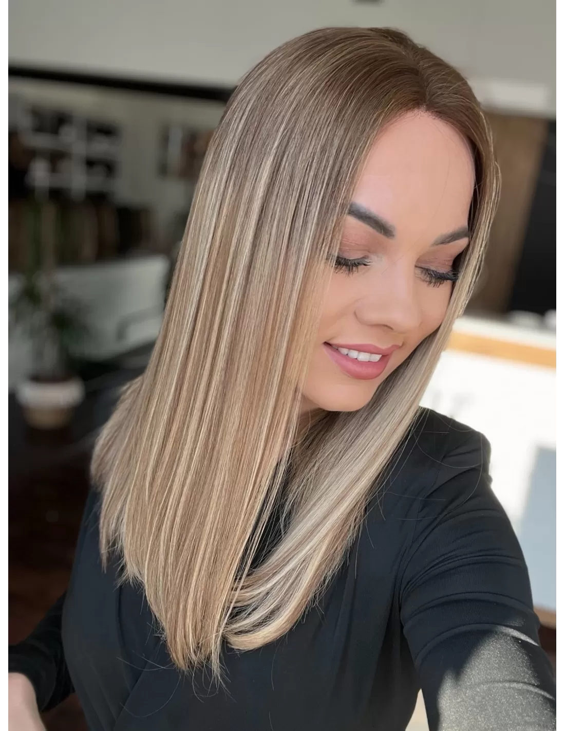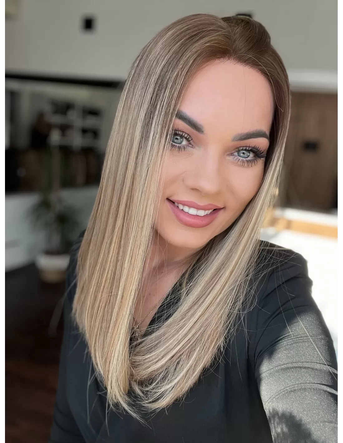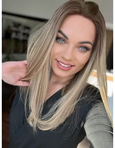 Ta wyjątkowa peruka z włosów naturalnych zachwyca perfekcyjnie dobranym balejażem w ciepłych odcieniach blondu. Mieszanka jasnych, złocistych i miodowych tonów tworzy efekt trójwymiarowej głębi, nadając fryzurze naturalny, pełen blasku wygląd. Delikatny odrost w odcieniu średniego brązu subtelnie podkreśla naturalność koloru, dodając mu autentycznego charakteru.