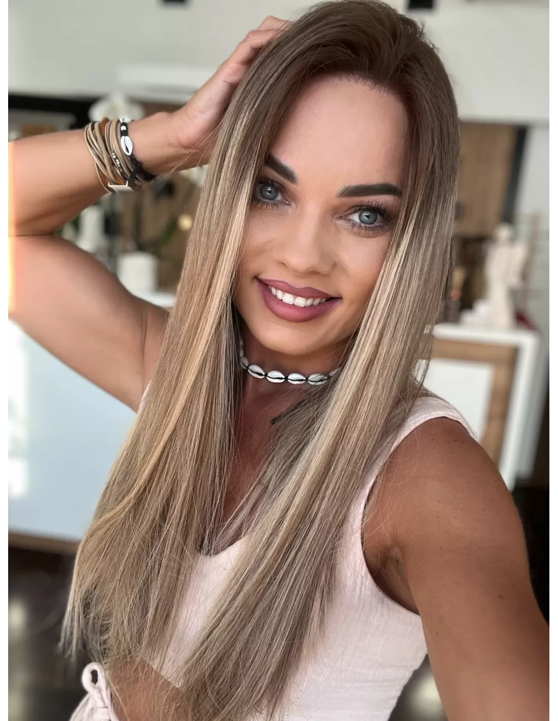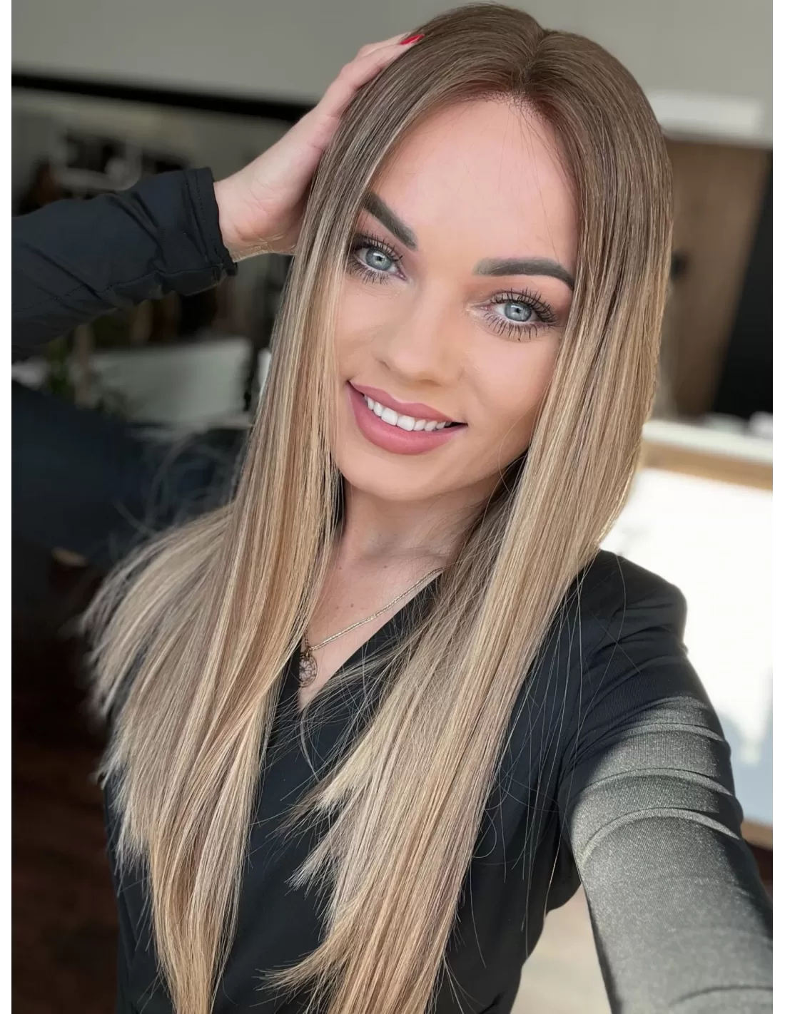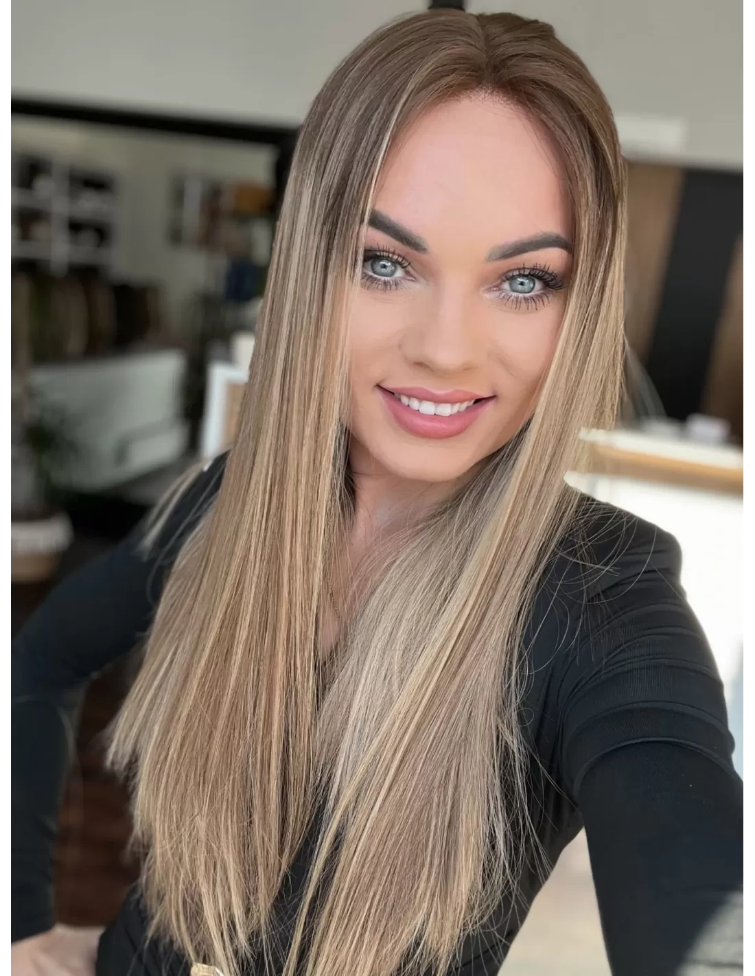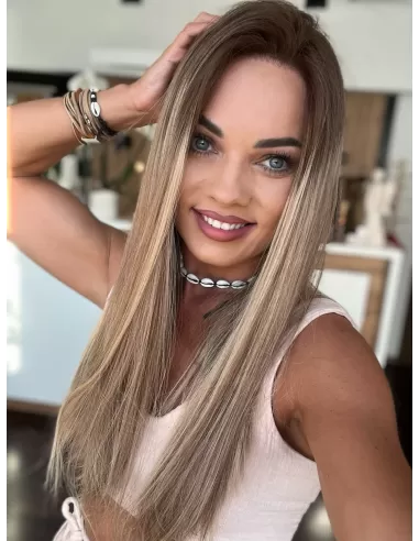 Ta wyjątkowa peruka z włosów naturalnych zachwyca perfekcyjnie dobranym balejażem w ciepłych odcieniach blondu. Mieszanka jasnych, złocistych i miodowych tonów tworzy efekt trójwymiarowej głębi, nadając fryzurze naturalny, pełen blasku wygląd. Delikatny odrost w odcieniu średniego brązu subtelnie podkreśla naturalność koloru, dodając mu autentycznego charakteru.