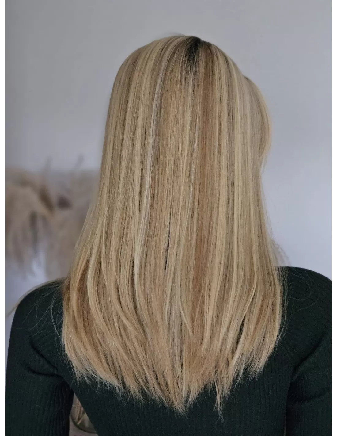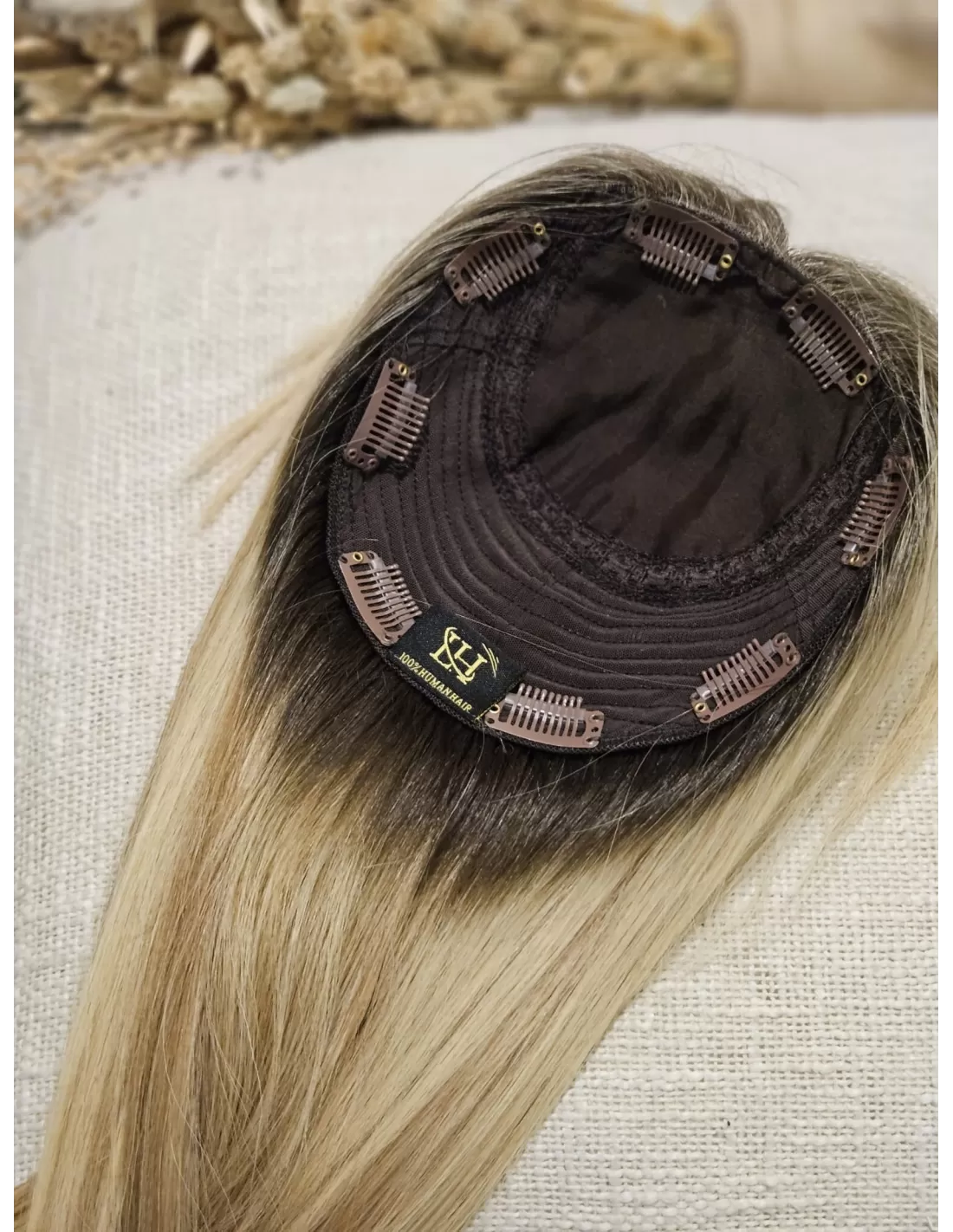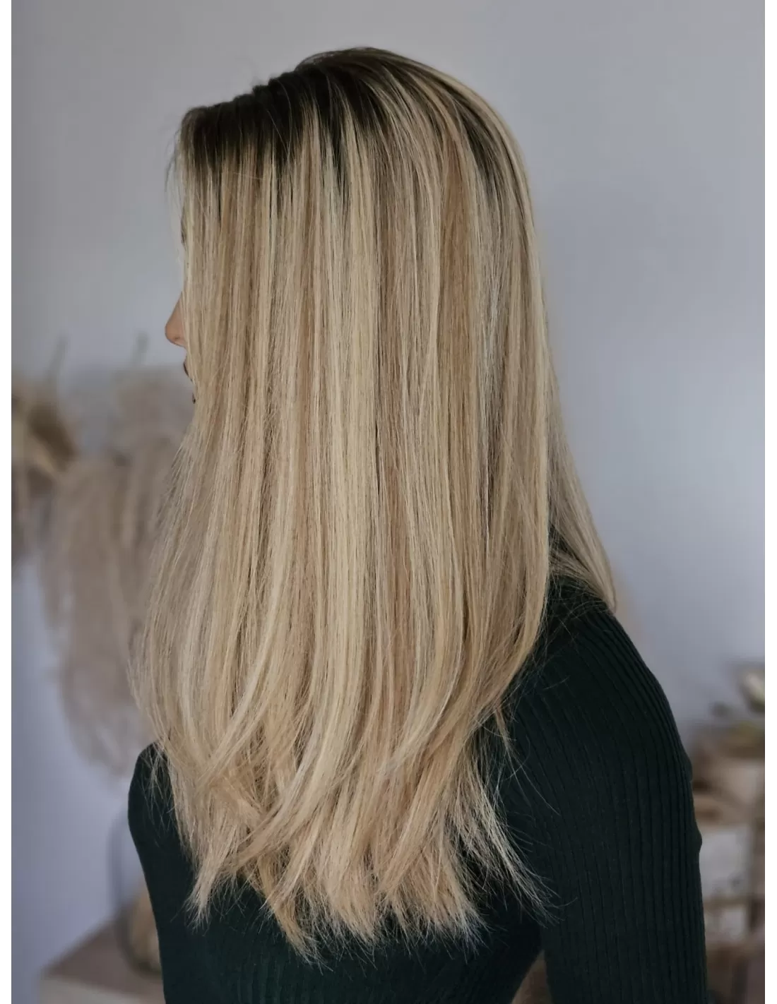 Topper Leila to kwintesencja najwyższej jakości włosów naturalnych, łącząca w sobie elegancję i nowoczesność. Jego ciemny odrost w chłodnym odcieniu brązu dodaje charakteru, podczas gdy baleyage blond w różnych odcieniach blondu i jasnego brązu nadaje mu wyjątkowej głębi.
