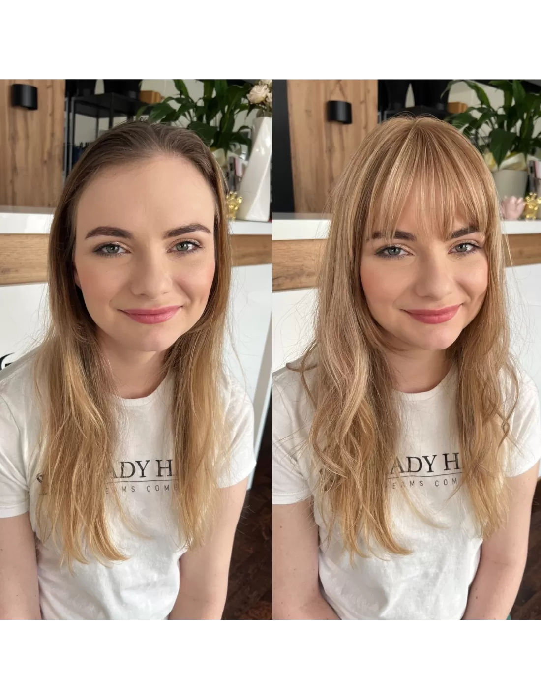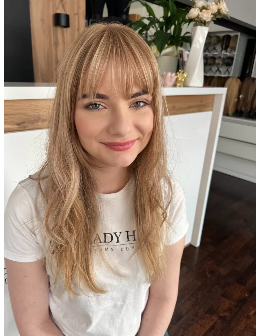 Piękny balejaż w odcieniach blond, z delikatnym beżowym odrostem, sprawia, że grzywka wygląda bardzo naturalnie i elegancko. Te subtelne kolory harmonijnie współgrają z różnymi odcieniami cery, podkreślając urodę. Delikatne zagęszczenie włosów sprawia, że grzywka nie tylko wygląda efektownie, ale także jest komfortowa w noszeniu.
