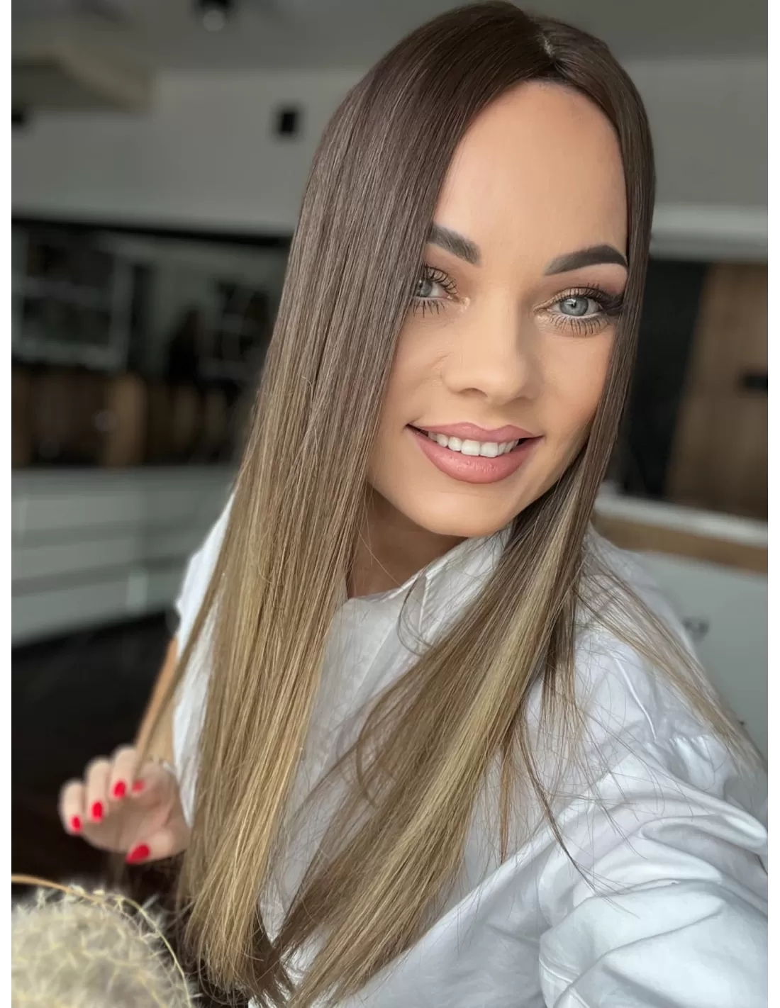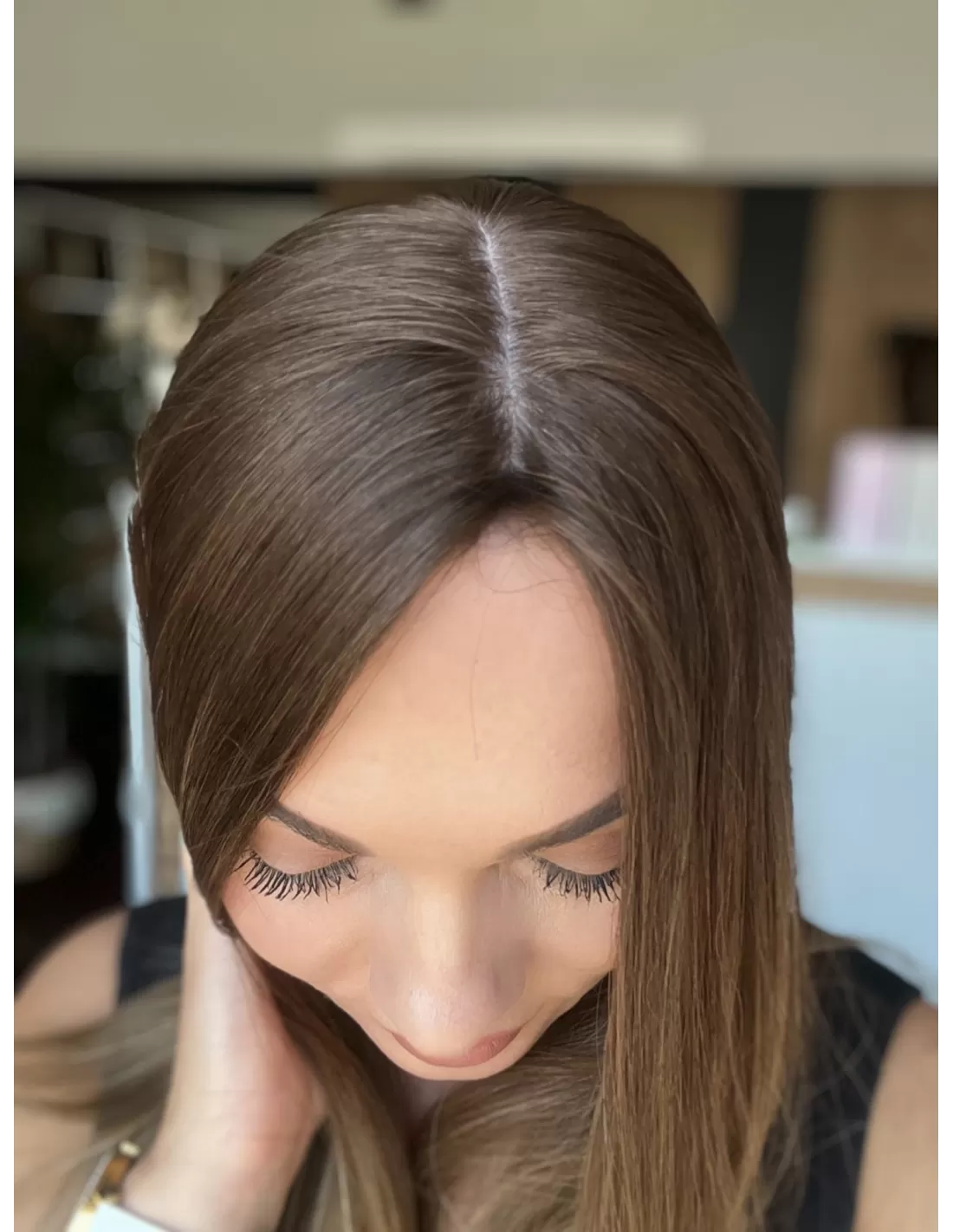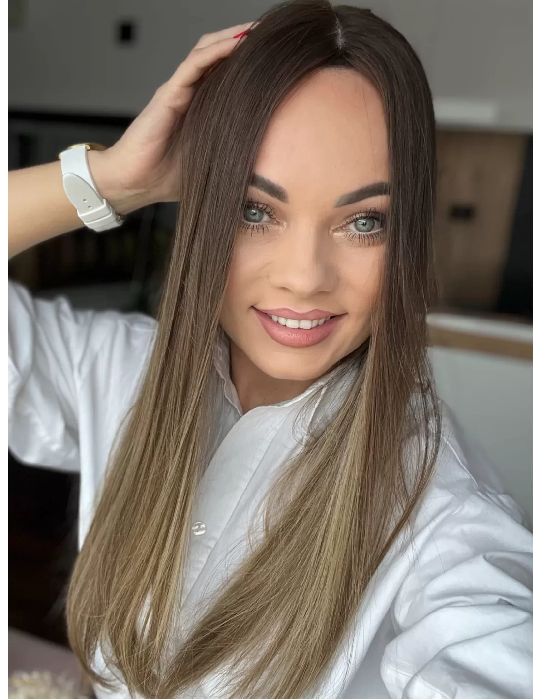 Kolor toppera to połączenie średniego brązu z bardzo subtelnym przejściem w jaśniejszą tonacje blondu.