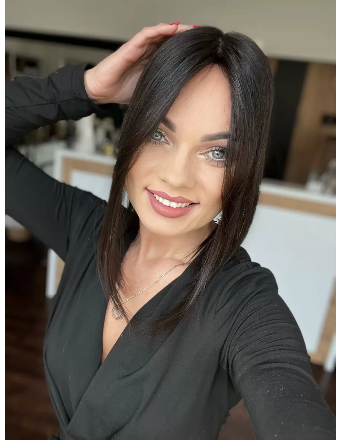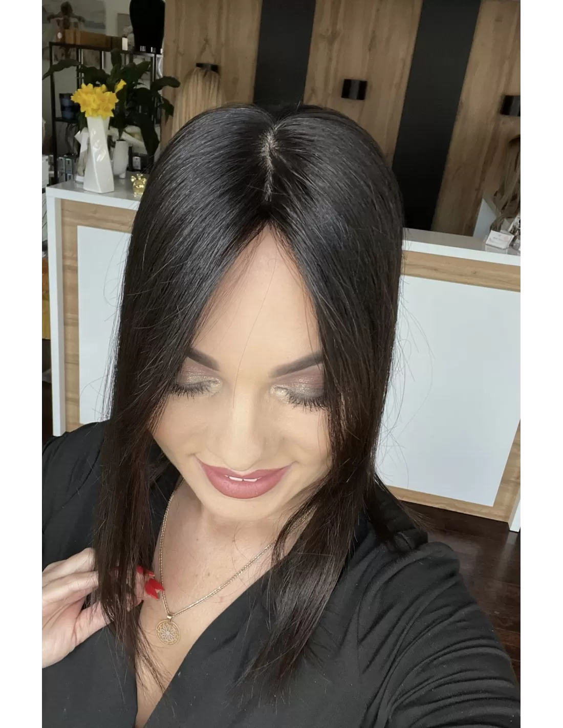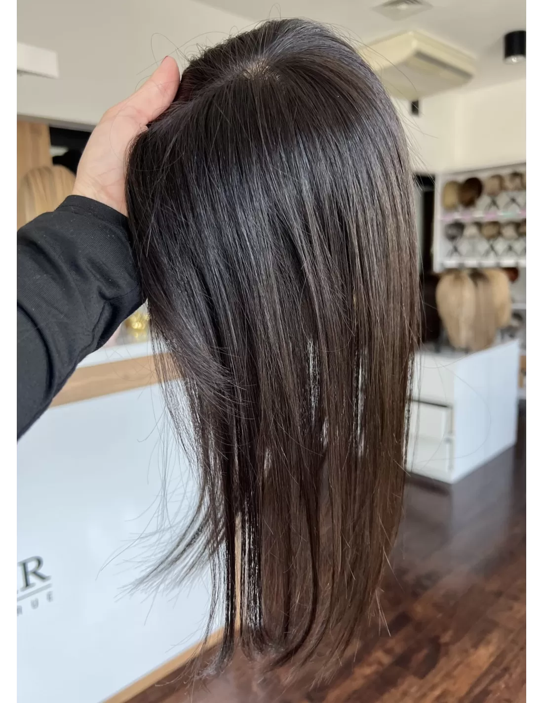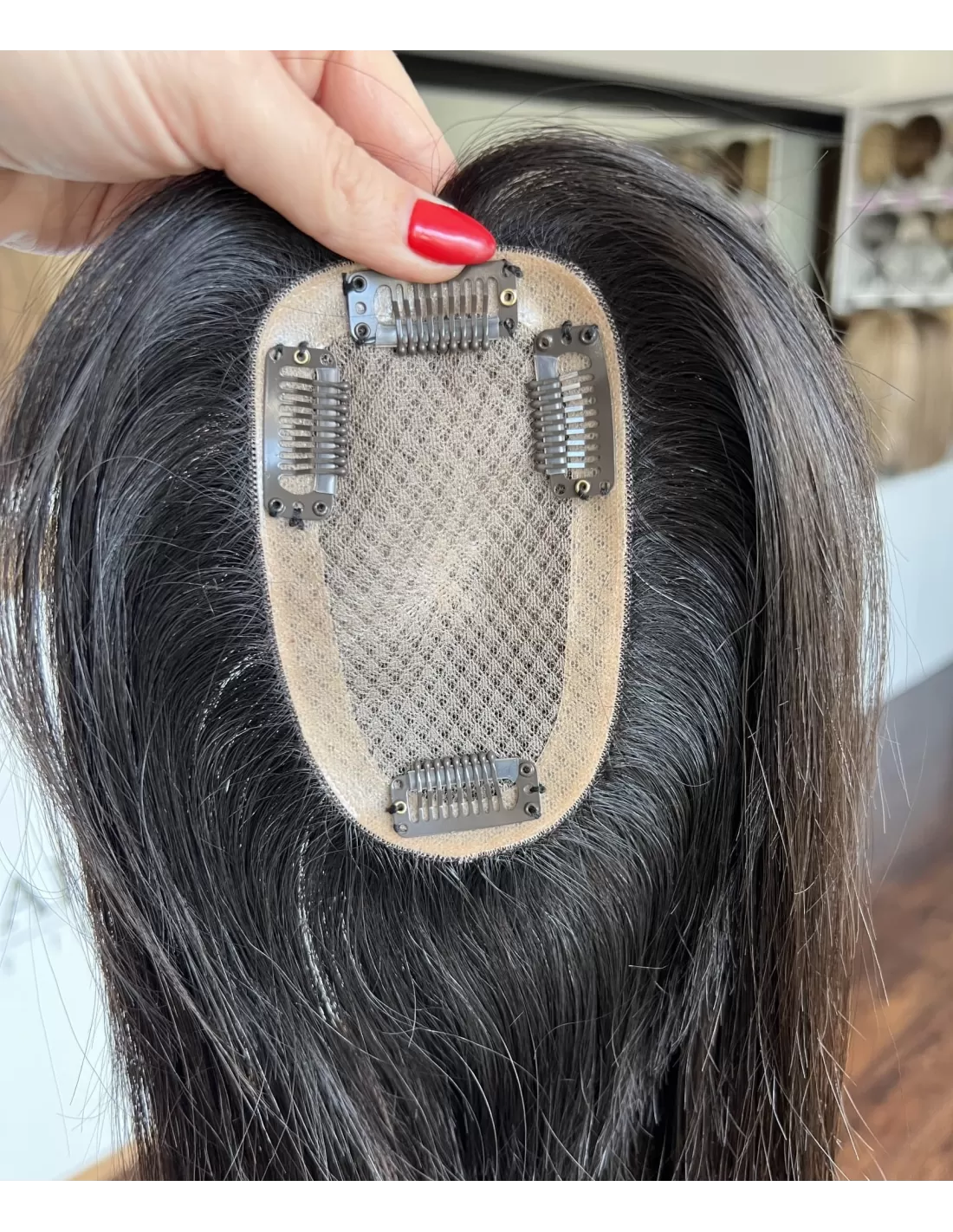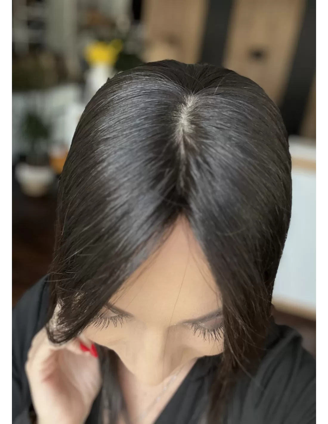 Przedstawiamy mini topper, idealne rozwiązanie dla osób pragnących subtelnie zagęścić przedziałek. Wykonany z naturalnych włosów w odcieniu bardzo ciemnego brązu na poziomie 1B.