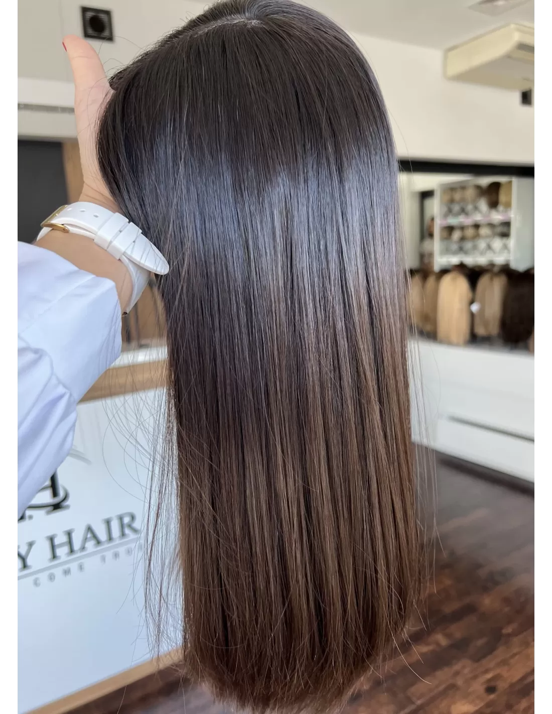 Kolor toppera to przepiękny odcień ombre. Bardzo delikatne i subtelne przejście z ciemnego brązu u nasady toppera do pięknego czekoladowego brązu w ciepłej tonacji po długości